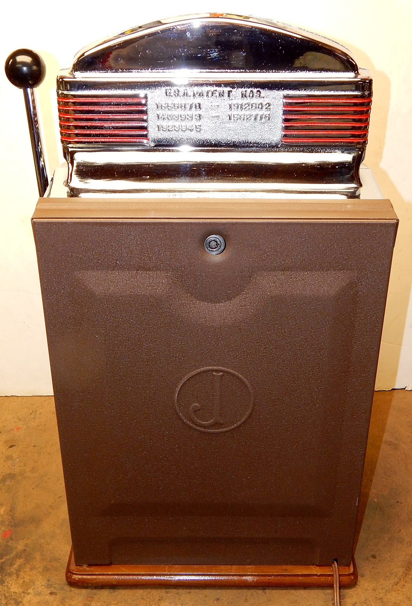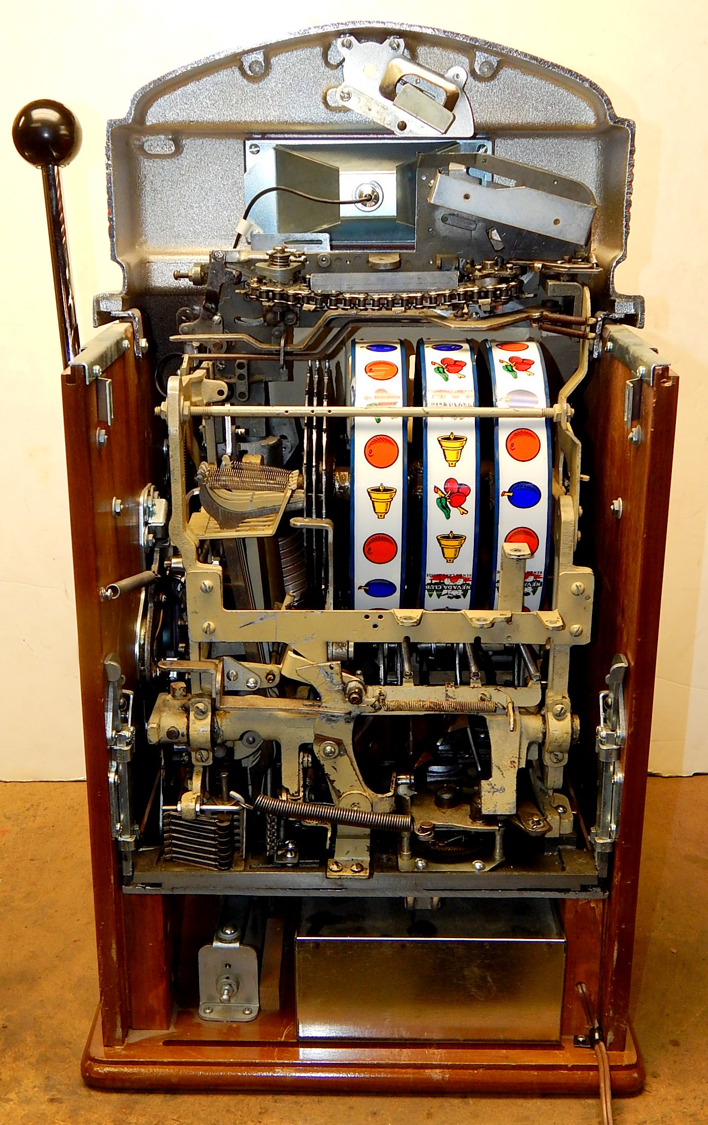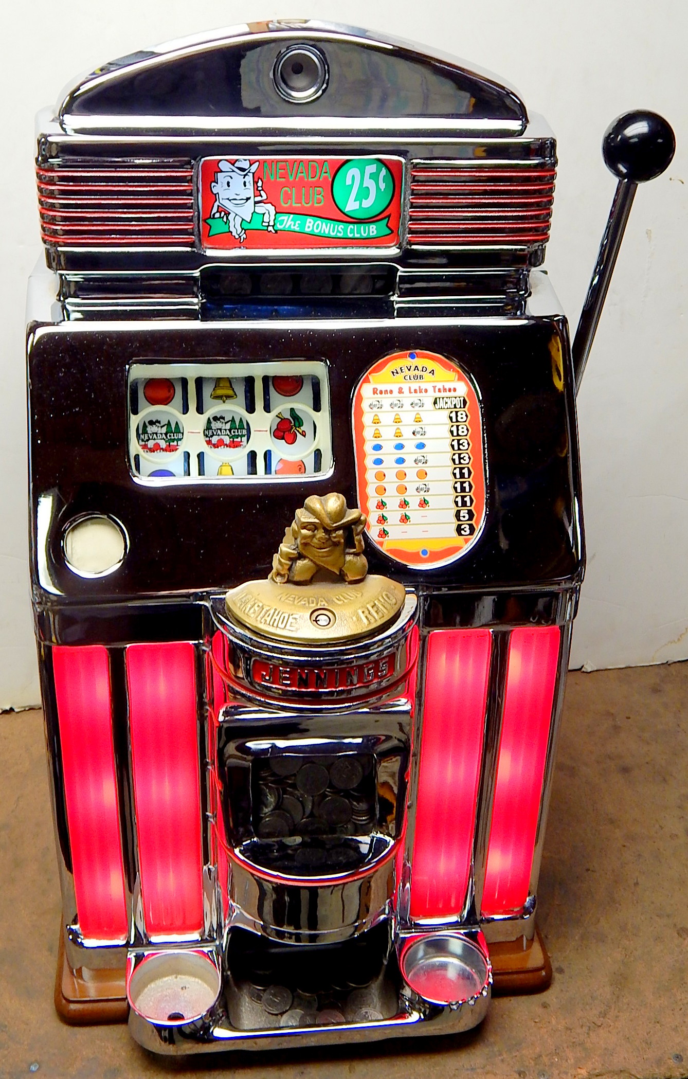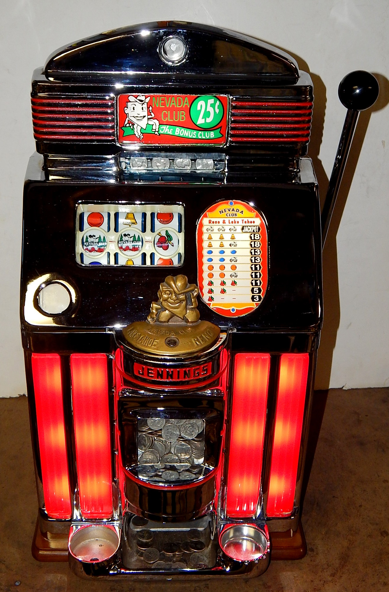 1949 Jennings Sun Chief (lite-up) "Nevada Club" lake Tahoe 25 cent, previously restored with the hard to find Glass and Ash tray money bowl. Functioning front load jackpot, back door with lock and keys. Has red top marquee, award card, bottom plastic. The chrome plating on this machine is 10 out of an 10. The cabinet is made of mahogany. Cash box and back door lock are replacements The machine plays very easy and pays as it should.