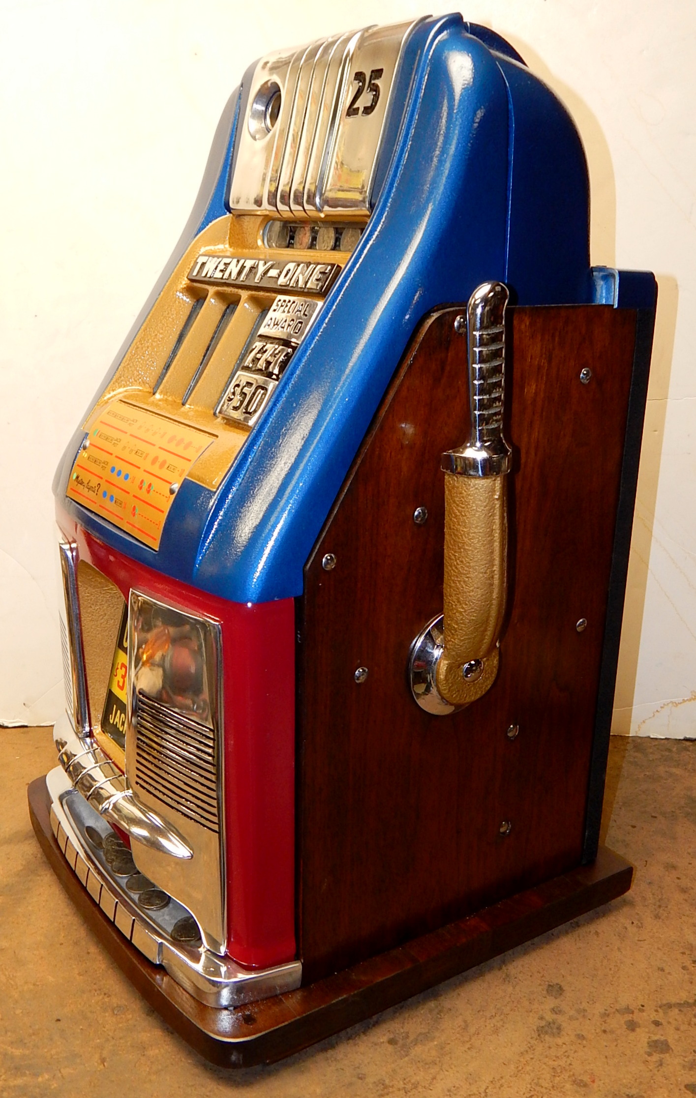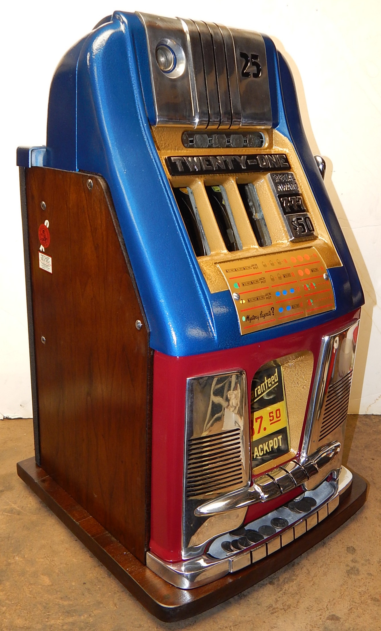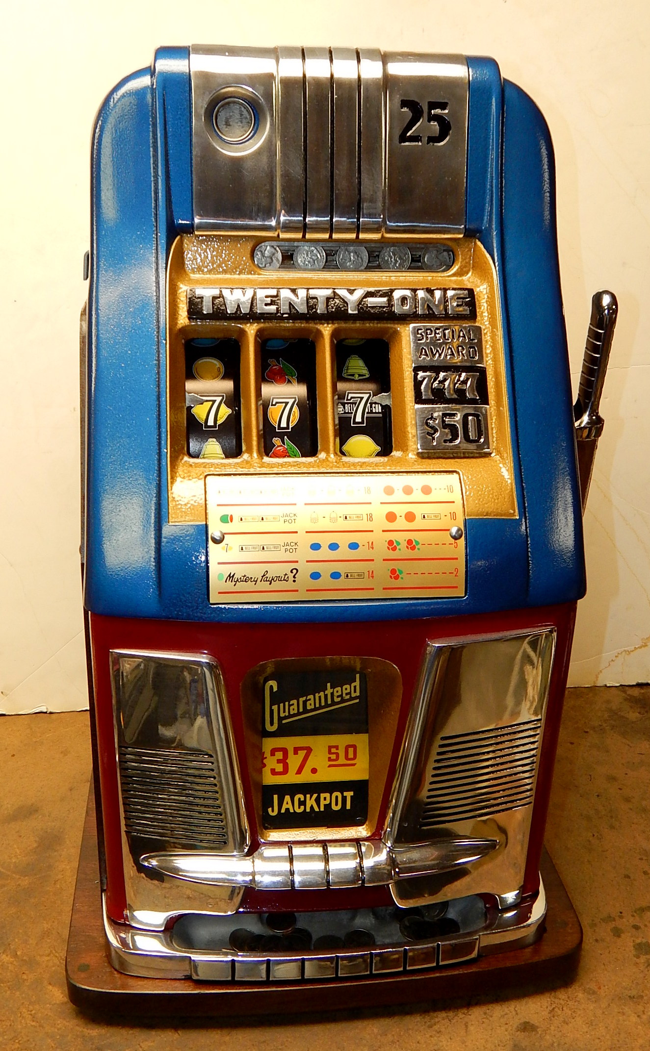 Mills Hi-Top 7-7-7, 25 cent. restored back to original condition.  Original back door, original cash box, Mills locks with one key, new award card. .