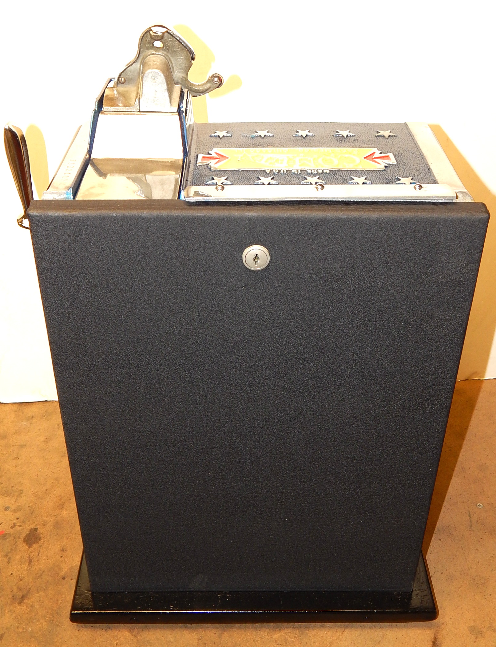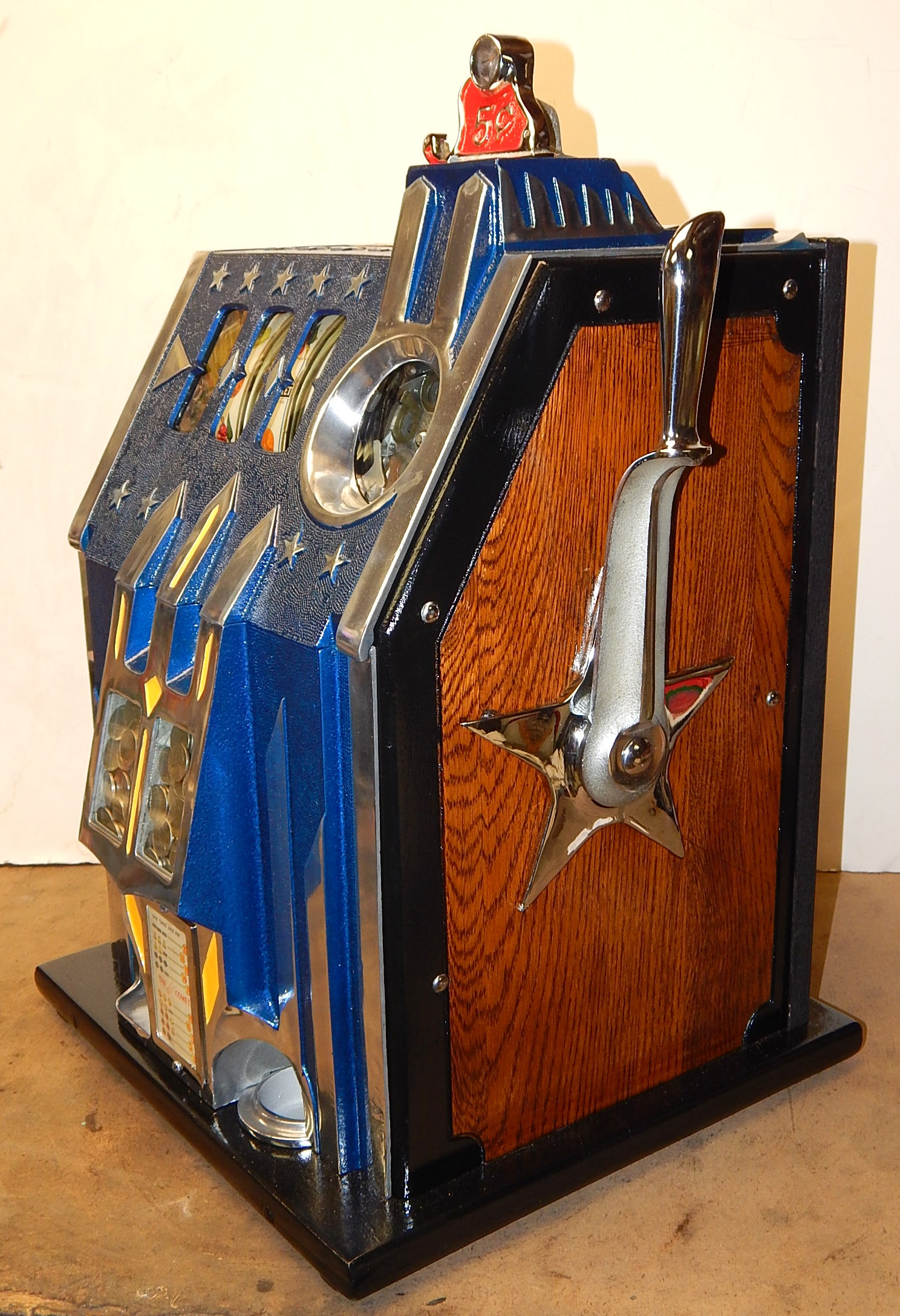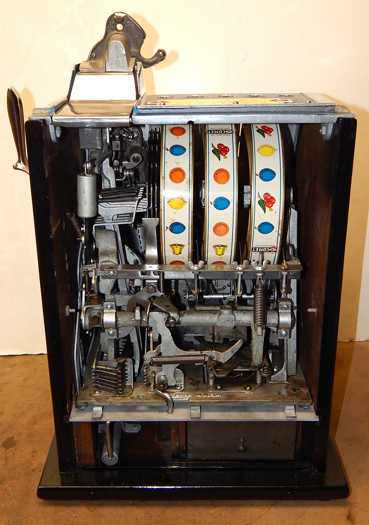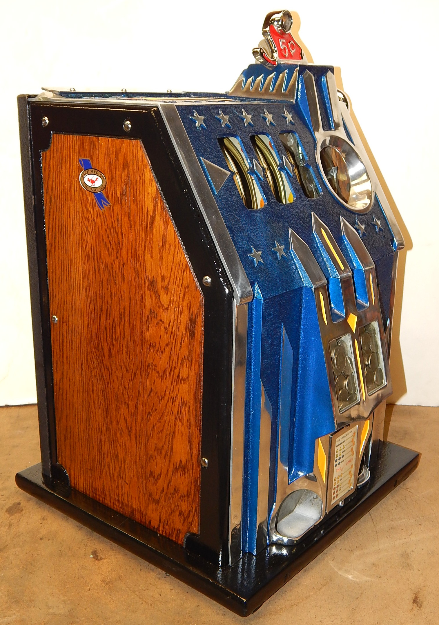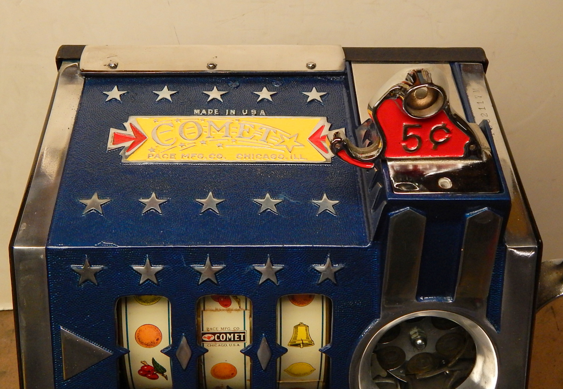 1936 Pace Comet 5 cent, restored back to its original colors Blue, trimmed in red and yellow. Original reel strips and award card. Original back door with original Pace lock and key. Original cash box, functional twin jackpots. Handle and coin head have been chrome plated. Plays and pays as it should. 3-5 pay out.