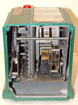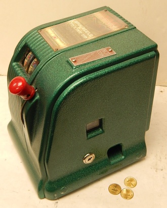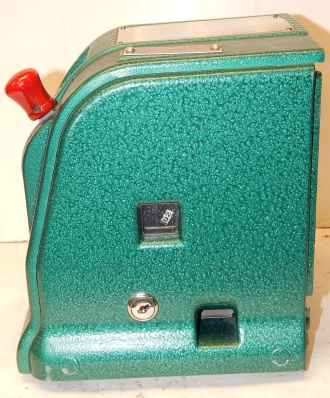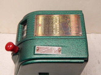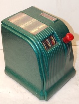 1940 Daval MFG. Marvel Visibility "Free Play" Previously restored 3- reel Countertop Cigarette Trade Stimulator. Not coin operated. Painted Hammer tone green. Comes with three tokens. Play's like it should and pays out one token each time you line up three of a kind cigarette packs. Has a counter on the side to keep count of the plays with a reset key. You could play up to 70 plays at a cost of 5c a play up to $3.50 to win packs of cigarette.