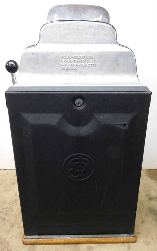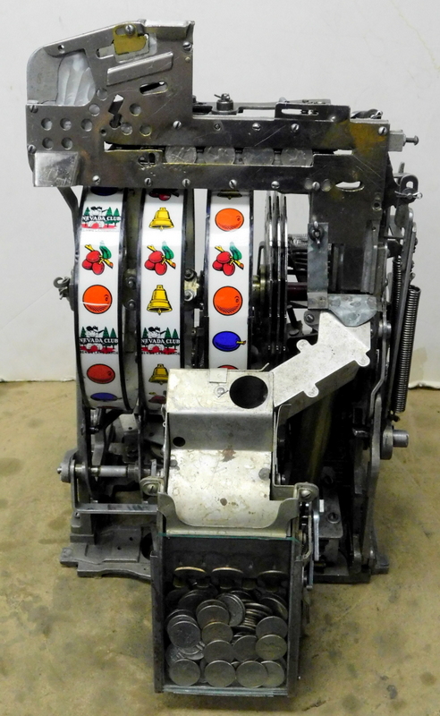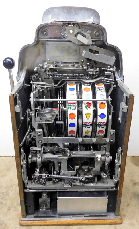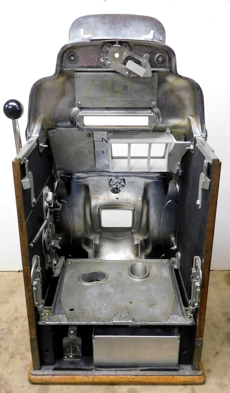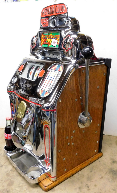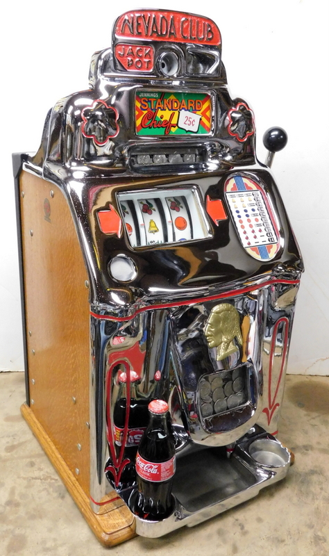 1949 Jennings Standard Chief "Nevada Club" 25 cent with glass holder and ash tray, previously restored. Chrome plated 9.9 out of a 10. This is the way we received this machine from a previous owner that was downsizing. Mint condition award card, reel strips, marquee. Working automatic Jackpot with reserve. Very nice back door and lock with one key, original oak cabinet in mint condition, new cash box. Plays very easy and pays as it should.