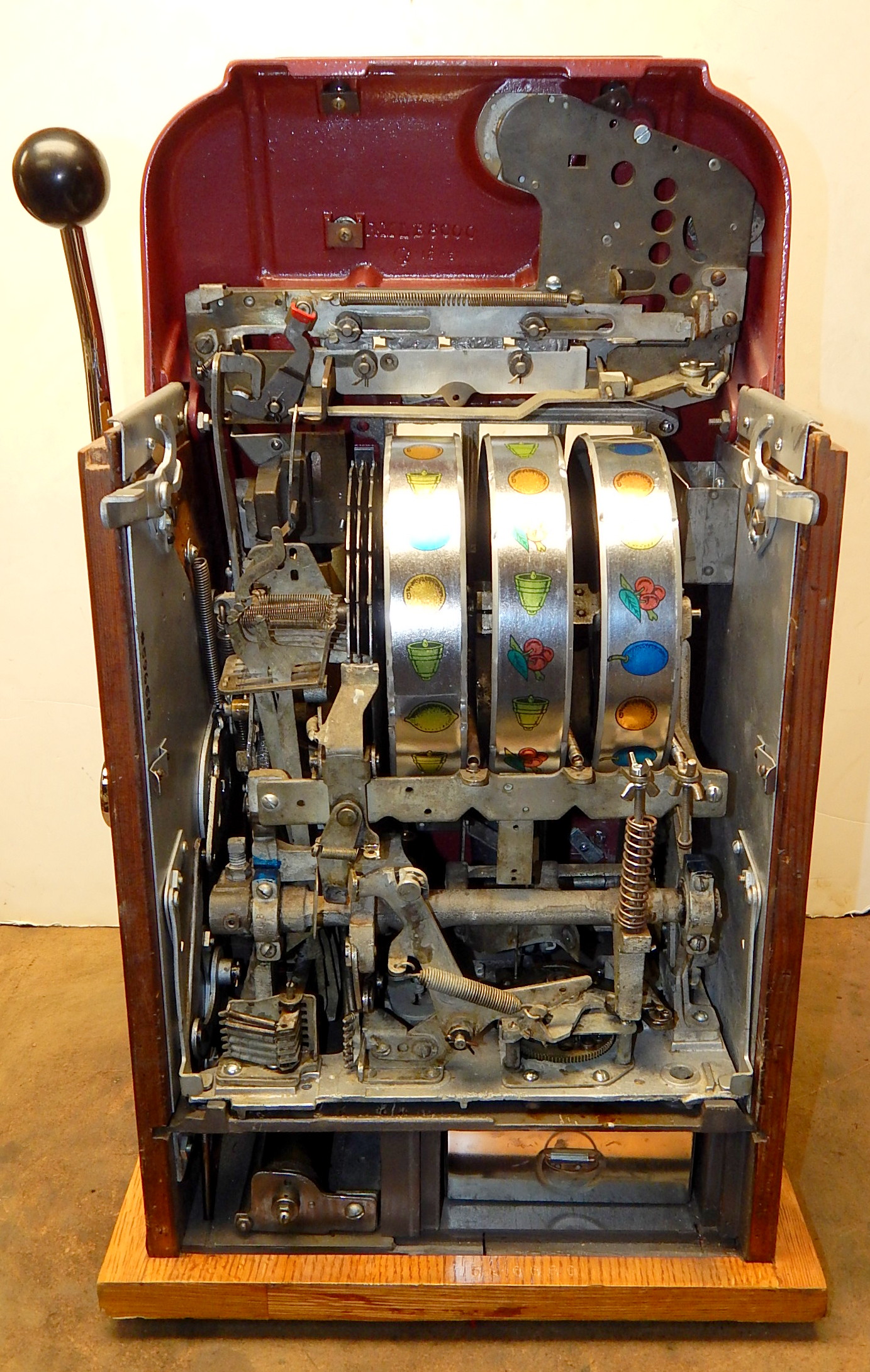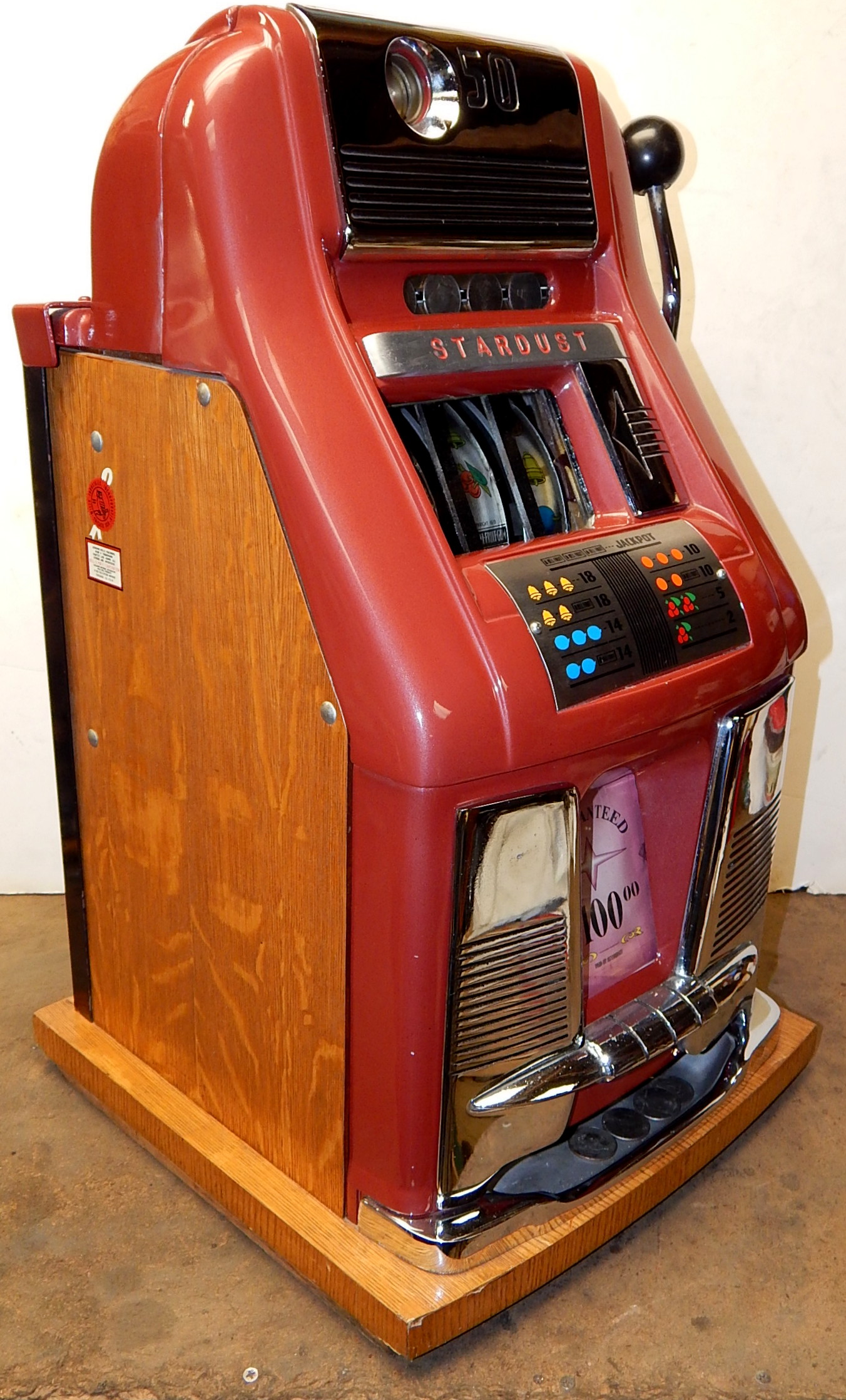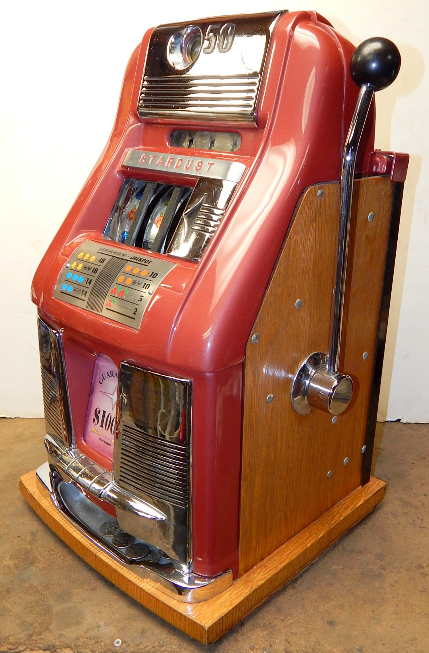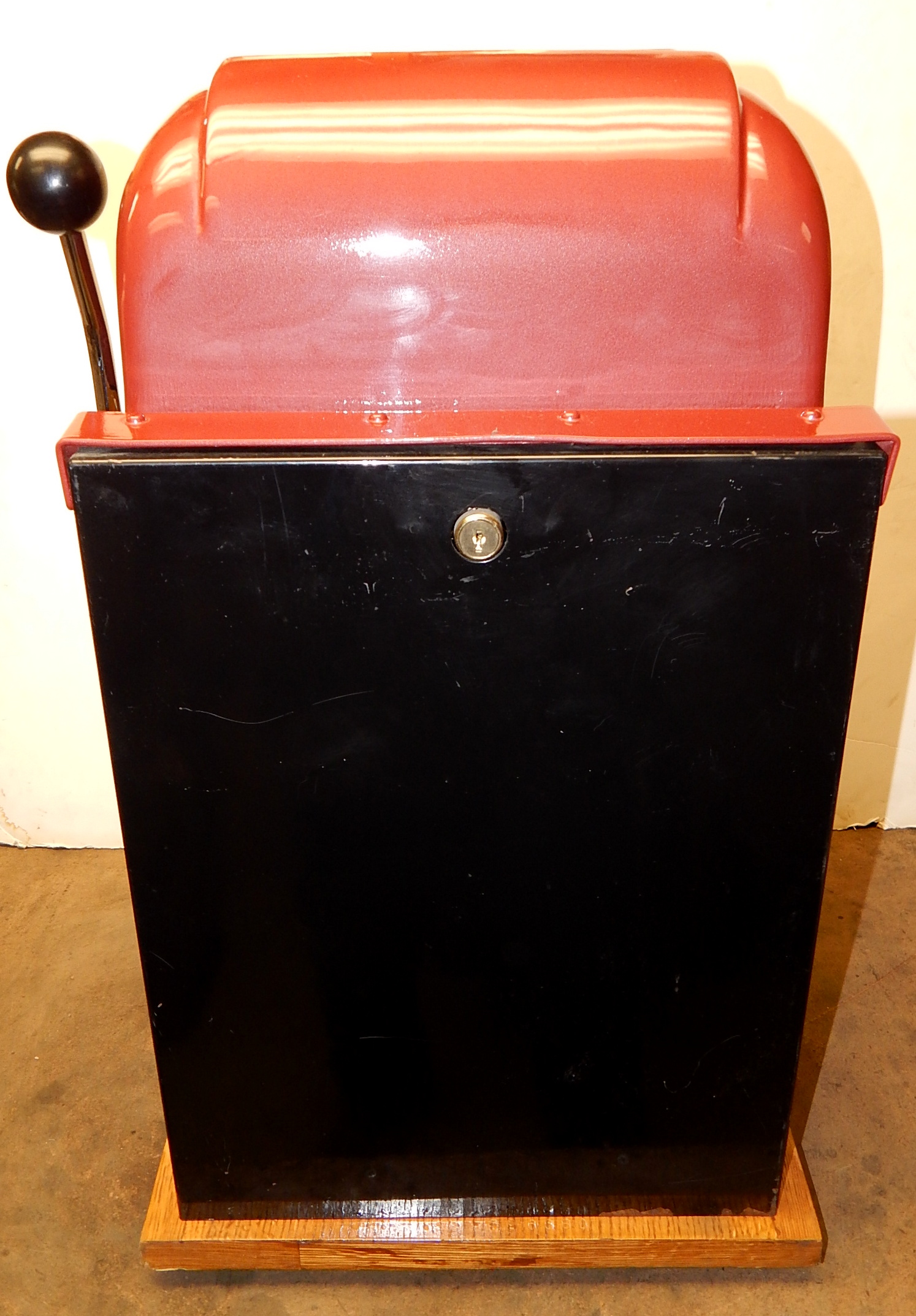 Mills 1950 Hi-Top, 50 cent, Previously restore. This is a very nice restored large coin machine, Gloss maroon. Most of the trim on this machine has been chrome plated to add a little flash to the gloss Maroon color. Club ball handle, new award card, new back door, new cash box, No Jackpot. Plays very easy and pays as it should.