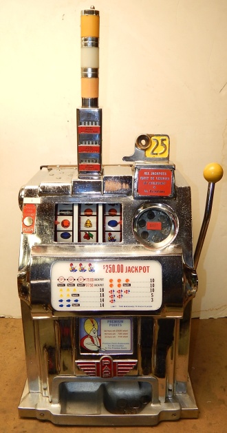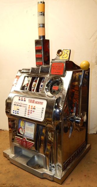 1963 Pace "Harrahs Club" 3 reel Jackpot with Sultans 25 cent, original reel strips, original back door. The mechanism still has the Harrah's Club Casino brass serial number tag on it. Chrome plated 8.5 out of a 10 not bad for a 55 year old machine. Both sides have a high polish stainless steel plates, looks like chrome. This is one of the last mechanical machine use in the casino from back in the day. Play very nice and pays as it should.