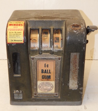 Groetchen "Zephyr" Trade Stimulator 1937 penny, play smoothly, gives a gumball every play. Holds up to 300 gum balls. Cigarette packs on the reels also came with fruit on the reels. Original condition and color, original award card has two keys. The Tax stamp is still on the machine in mint condition from 1941, not bad for 73 years old.