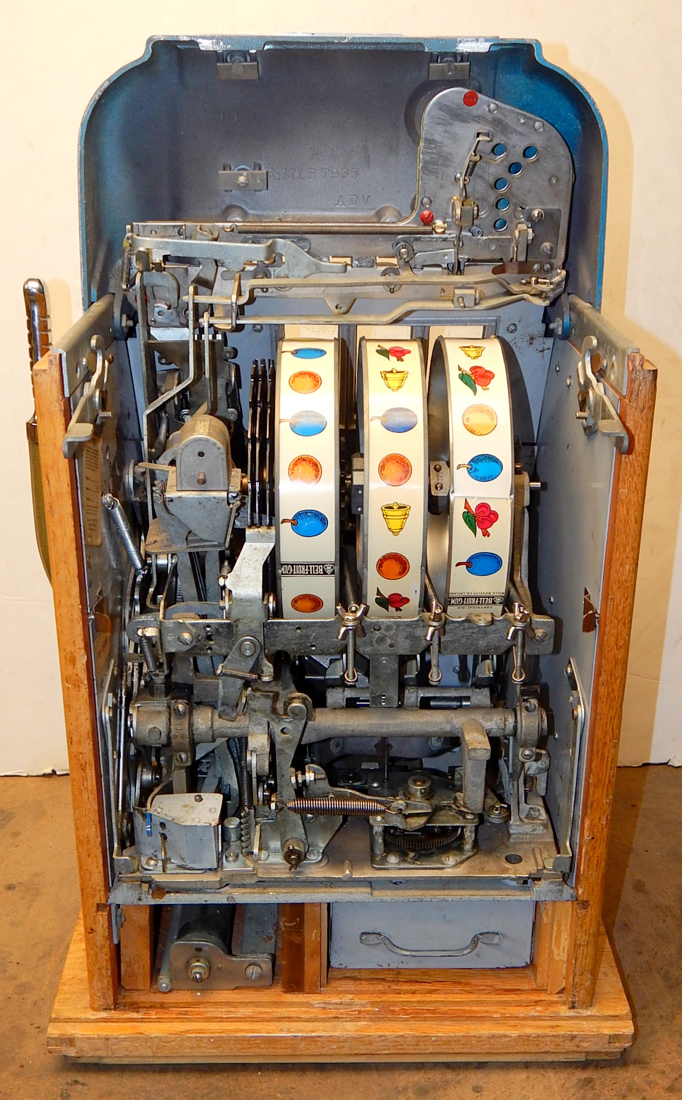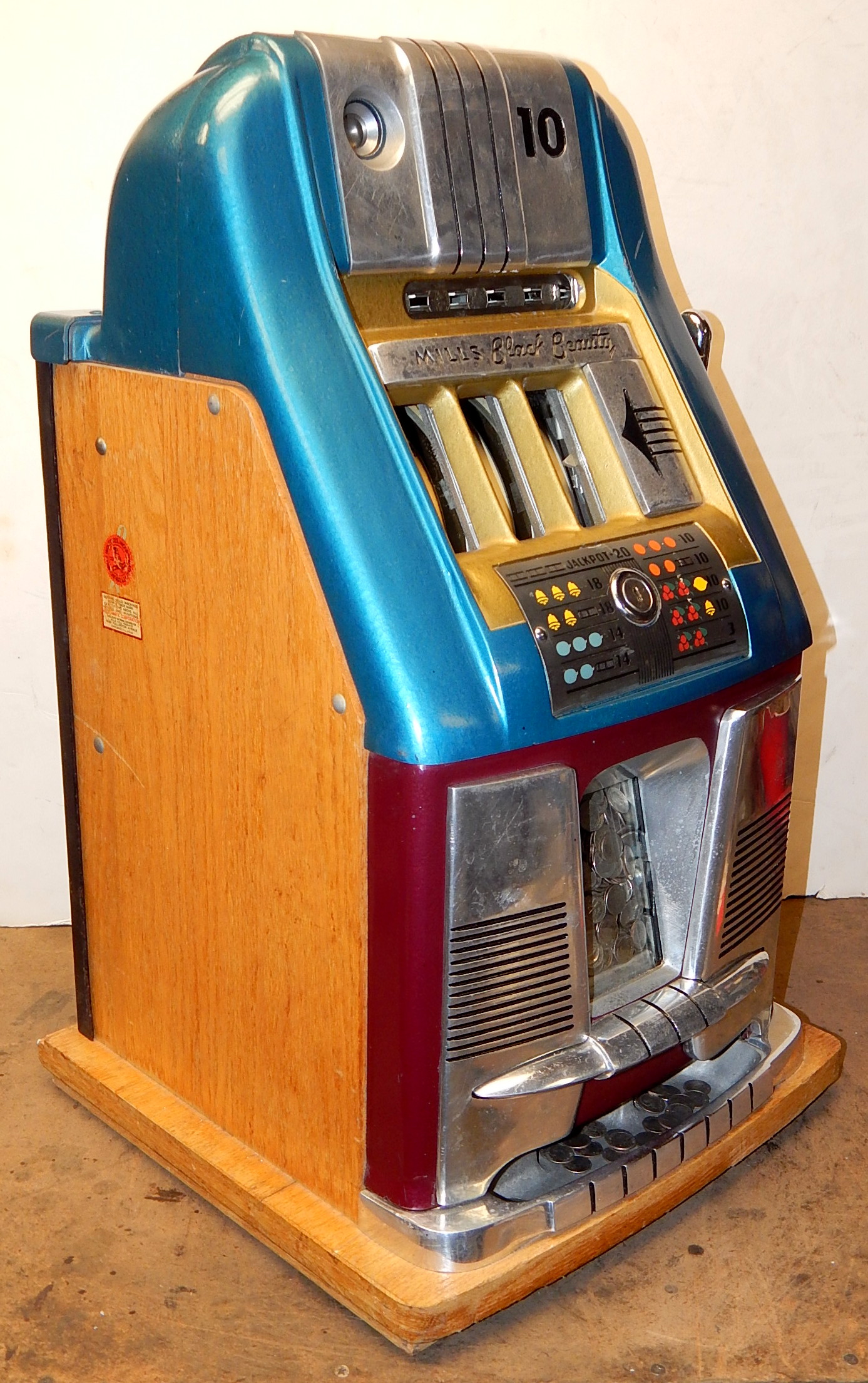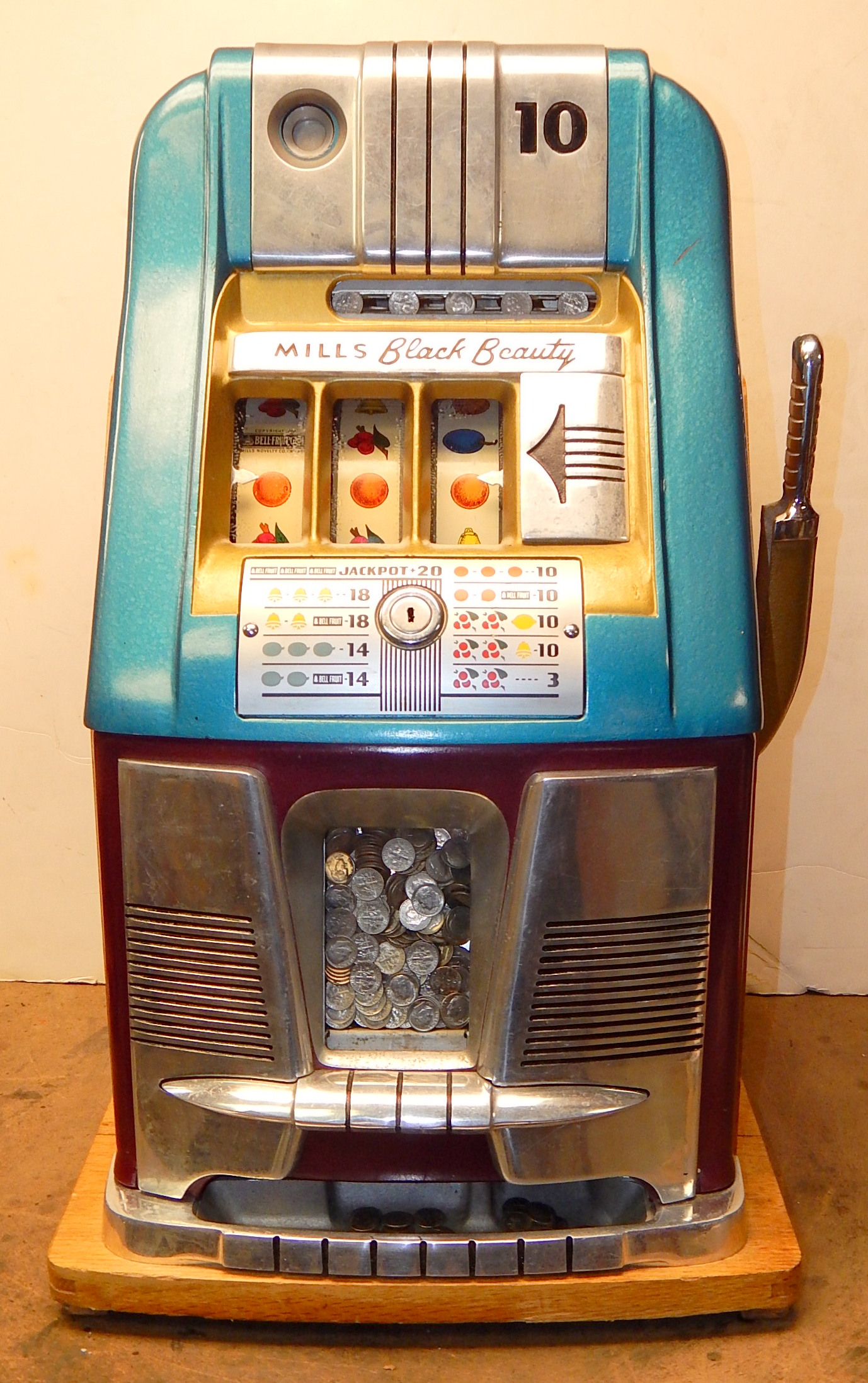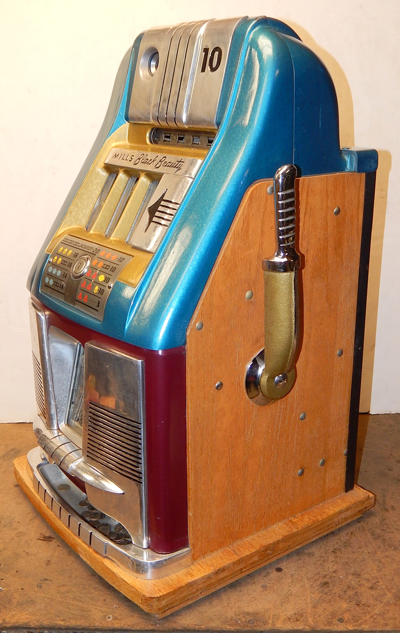 Mills Black Beauty 10 cent, in original condition, original reel strips, front load Jackpot, original back door, original cash box, locks are Mills locks with one key. Very nice oak cabinet with original paper work on the inside. Notice, on the award card two cherrys and bell or lemon pays ten coins not five. If you are looking for a nice original machine untouched here you are. This machine has been cleaned, lube and adjusted . Ready for many years of trouble free play.