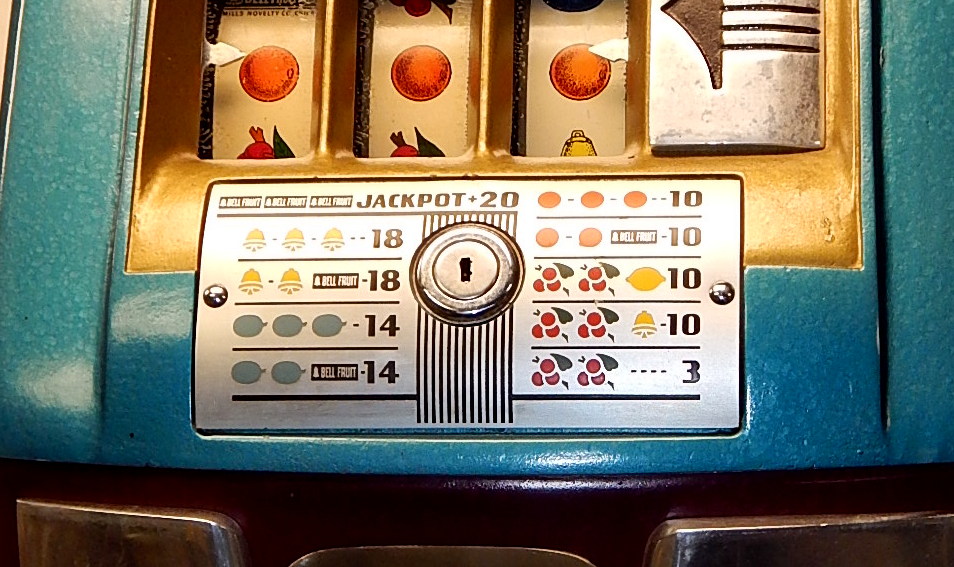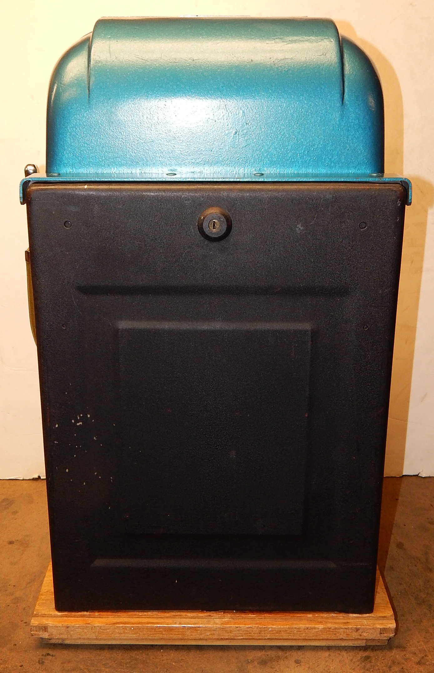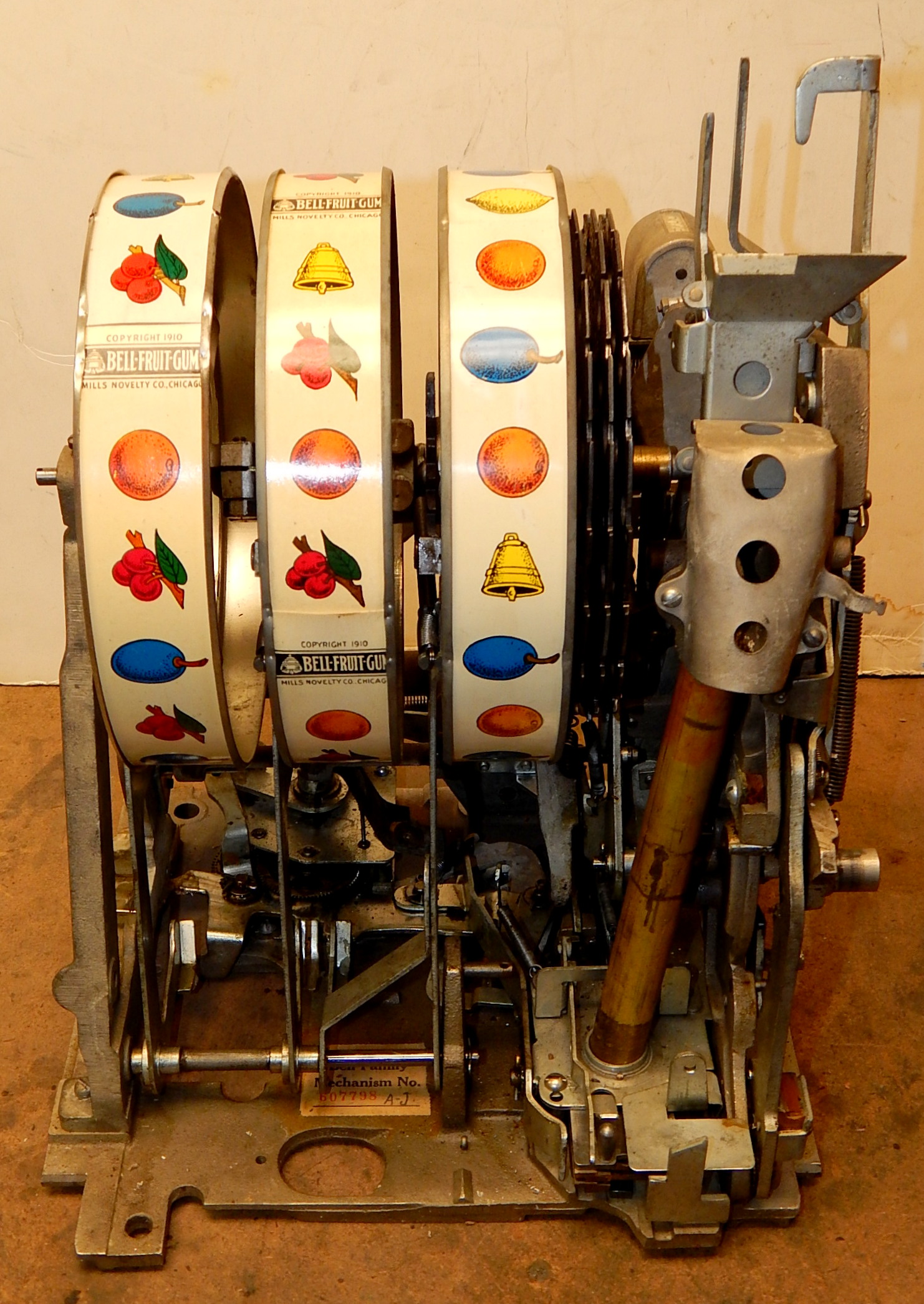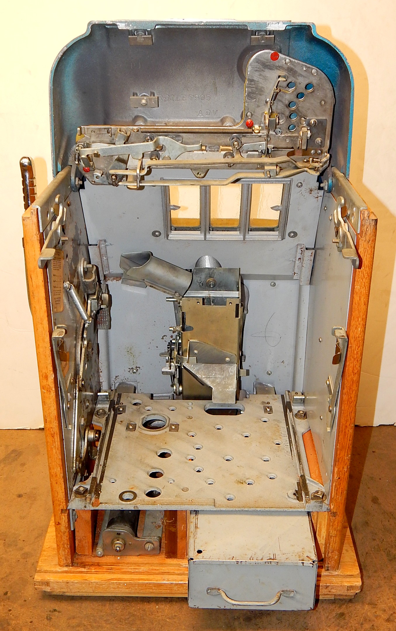 Mills Black Beauty 10 cent, in original condition, original reel strips, front load Jackpot, original back door, original cash box, locks are Mills locks with one key. Very nice oak cabinet with original paper work on the inside. Notice, on the award card two cherrys and bell or lemon pays ten coins not five. If you are looking for a nice original machine untouched here you are. This machine has been cleaned, lube and adjusted . Ready for many years of trouble free play.