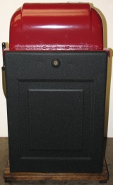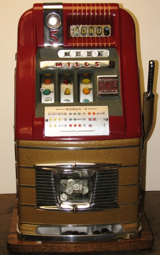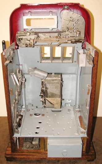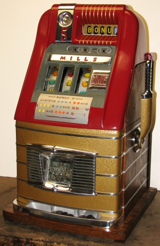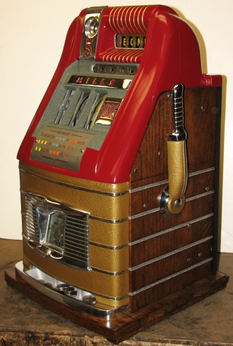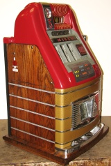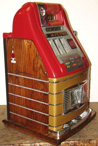 Mills 1948 Bonus Hi-Top 5 cent restored back to the original colors of burgundy, hammer gold trimed in wrinkle green. This machine has the Hard to find Bonus feature. Mint condition orignal award card, original reel strips, original cash box, original back door with Mills locks with one keys. The cabinet on this machine was in such fine condition, we did not have the heart to hide this beautiful all oak wood cabinet with paint so, its finished and stained instead of painted to bring out it's natural beauty. Other then the new paint, a very nice all original machine. Plays easy and pays as it should, 2-5 pay out