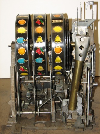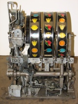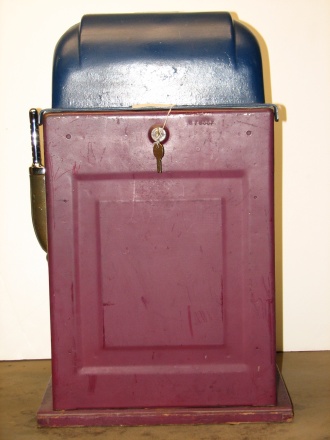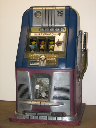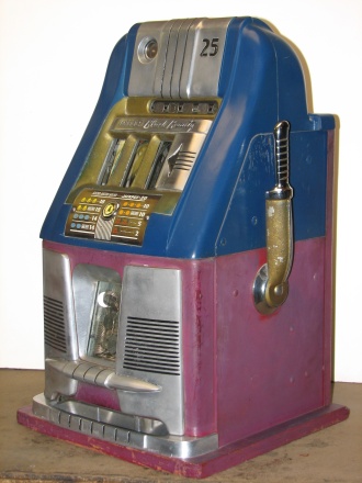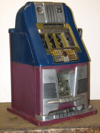 25 cent Mills Black Beauty in original condition, original reel strips, front load Jackpot, original back door, money box door, original cash box, all locks are Mills locks with one key. Front loader lock and cash box door lock are keyed alike. If you are looking for a nice original machine untouched here you are. This machine has been cleaned, lube and adjusted . Ready for many years of trouble free play.
