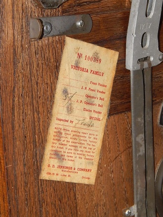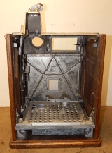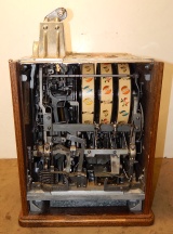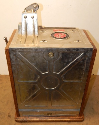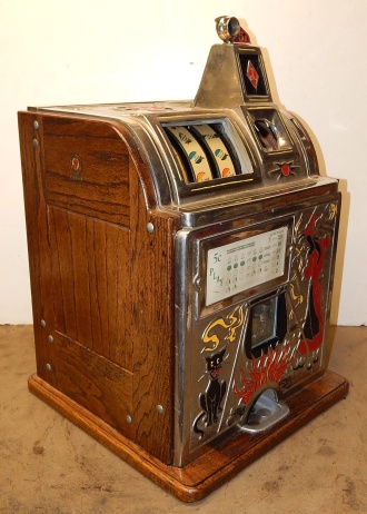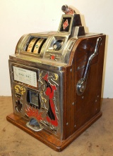 Jennings Victoria "Black Cat" 5 cent, preioiusly restored. Nickel plated, mint condition oak cabinet. Numbers matching, with jackpot. Plays very easy.