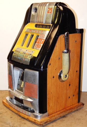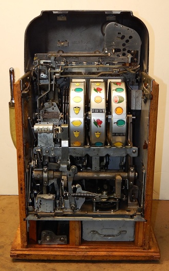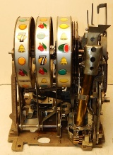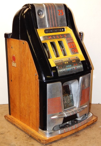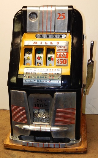 1957 Mills Hi-Top 7-7-7, 25 cent. Very nice original machine not restored, with full Jackpot, original cash box, original back door, original reel stripes. original Mills lock with one key, 7-7-7 Token vendor with three tokens.