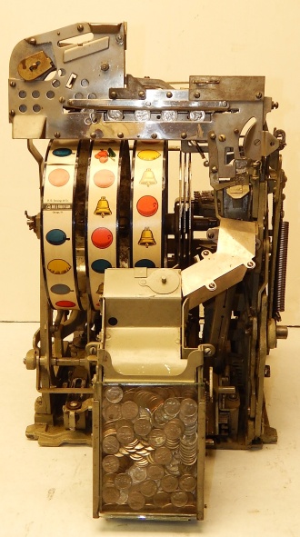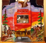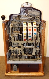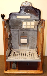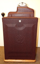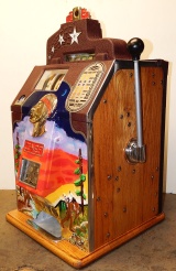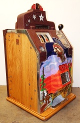 1936 Jennings "4 Star" Chief, 10 cent. Painted wrinkle Brown. Very nice original number matching machine. Casting are polished not plated. Mint condition oak cabinet, original condition award card, original cash box, original back door, original reel stripes. Ace lock on back door with one key. original. The only thing that is not original on this machine is the paint. The hunting scene on this machine was hand painted