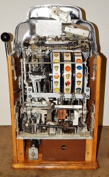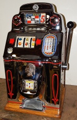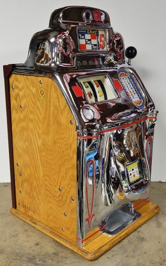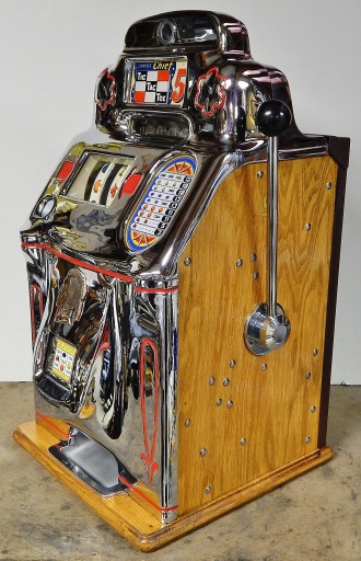 1947 Jennings Standard Chief "Tic-Tac-Toe" 5 cent, Serial numbers match. Has a full functioning Jack-Pot. Original condition Reel strips. Original Award card and Marquee, original back door with Ace lock and key, original cash box. Very nice mint oak cabinet. Chrome on this machine is a 9.9 out of a 10.