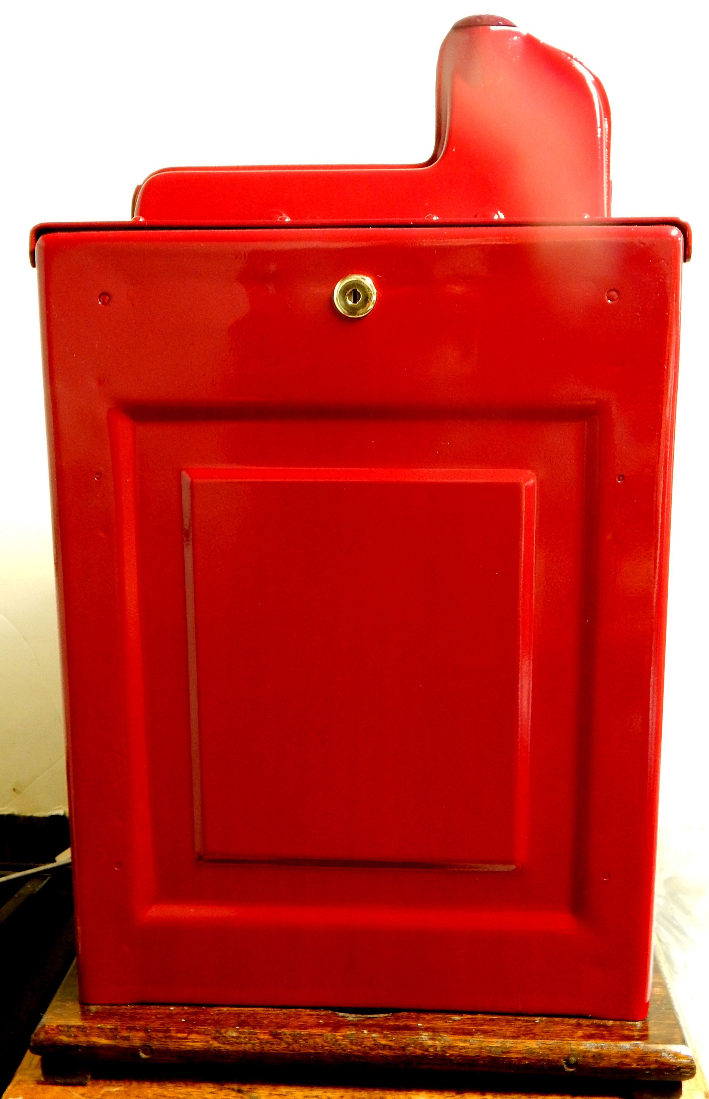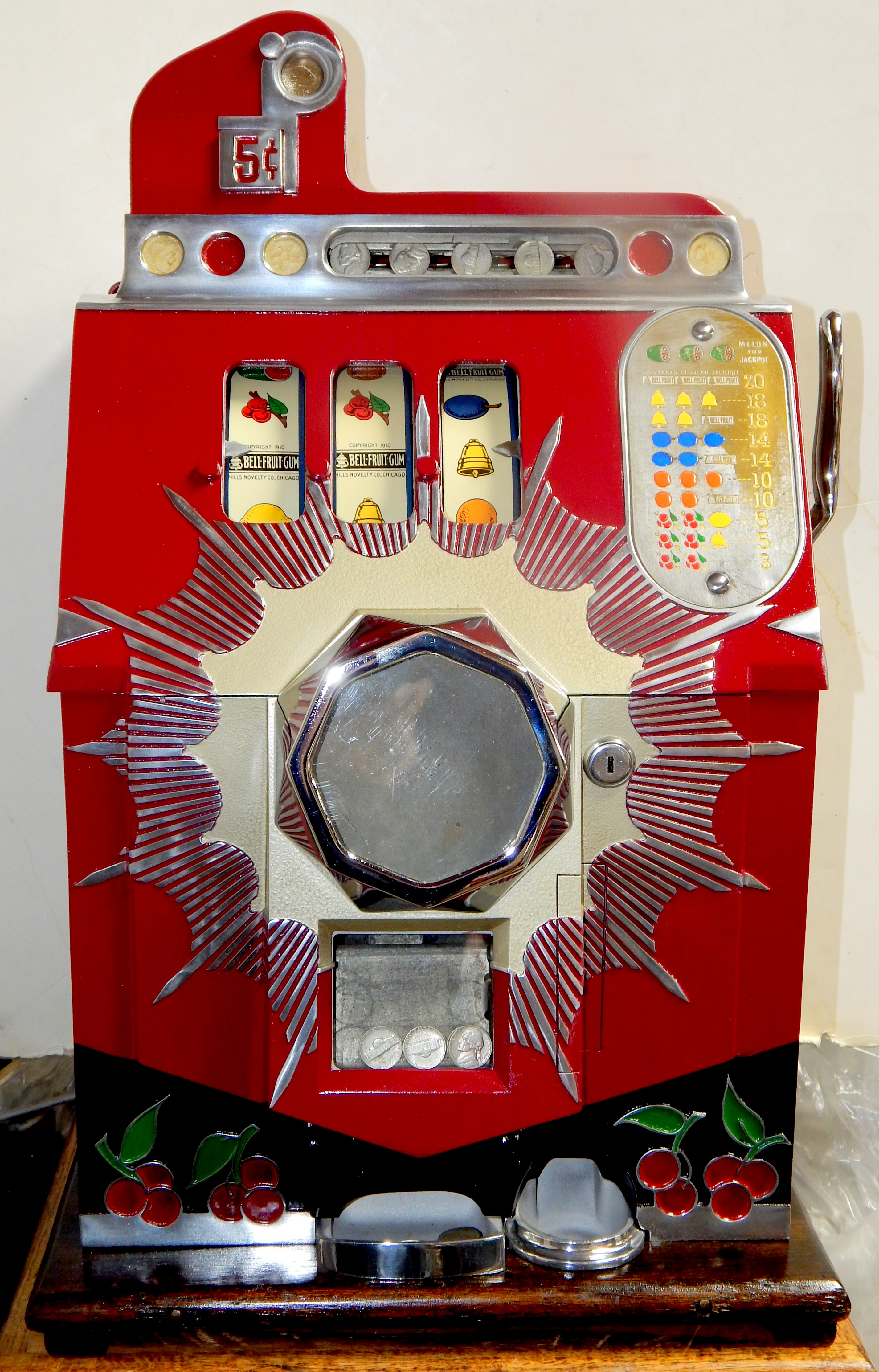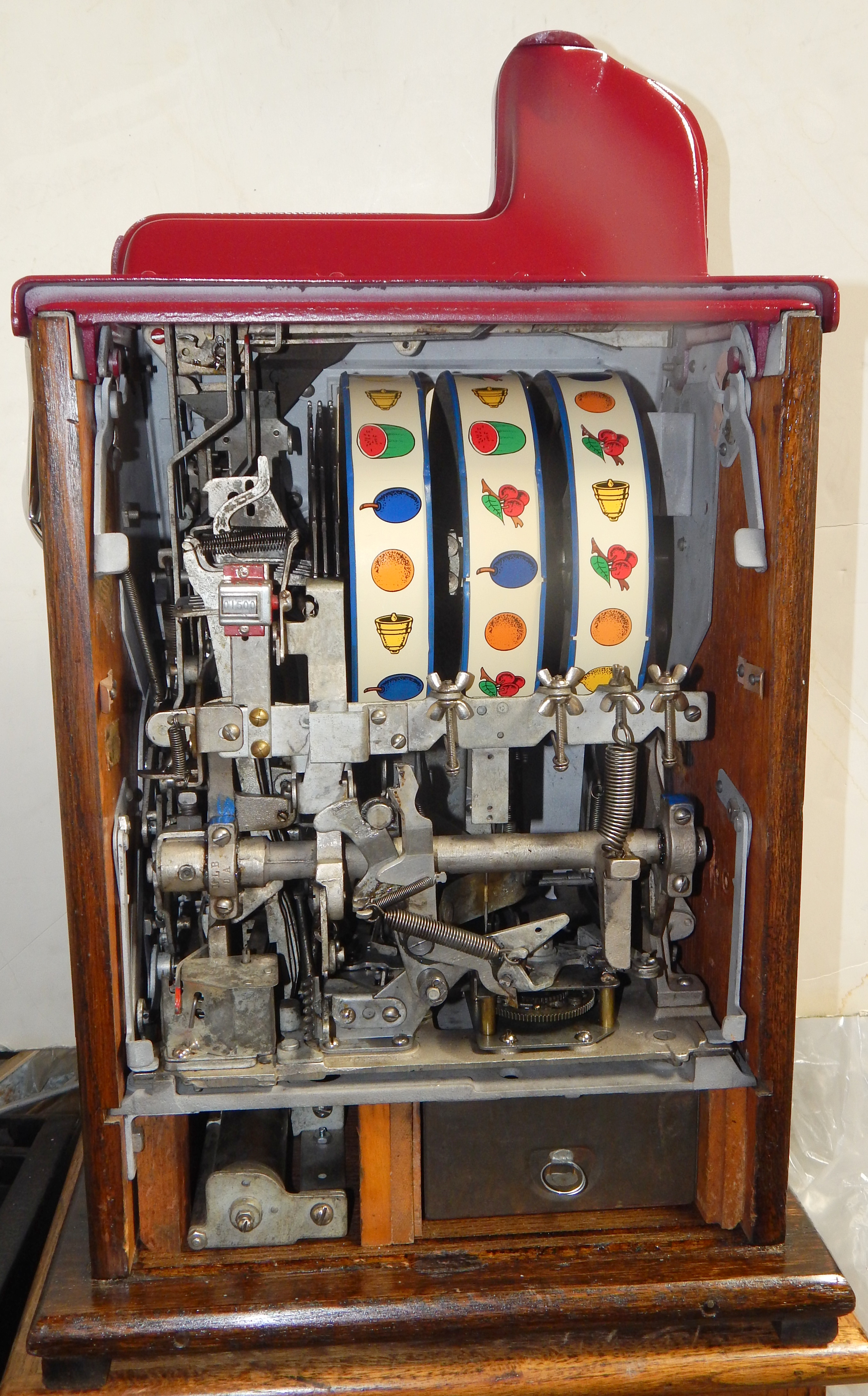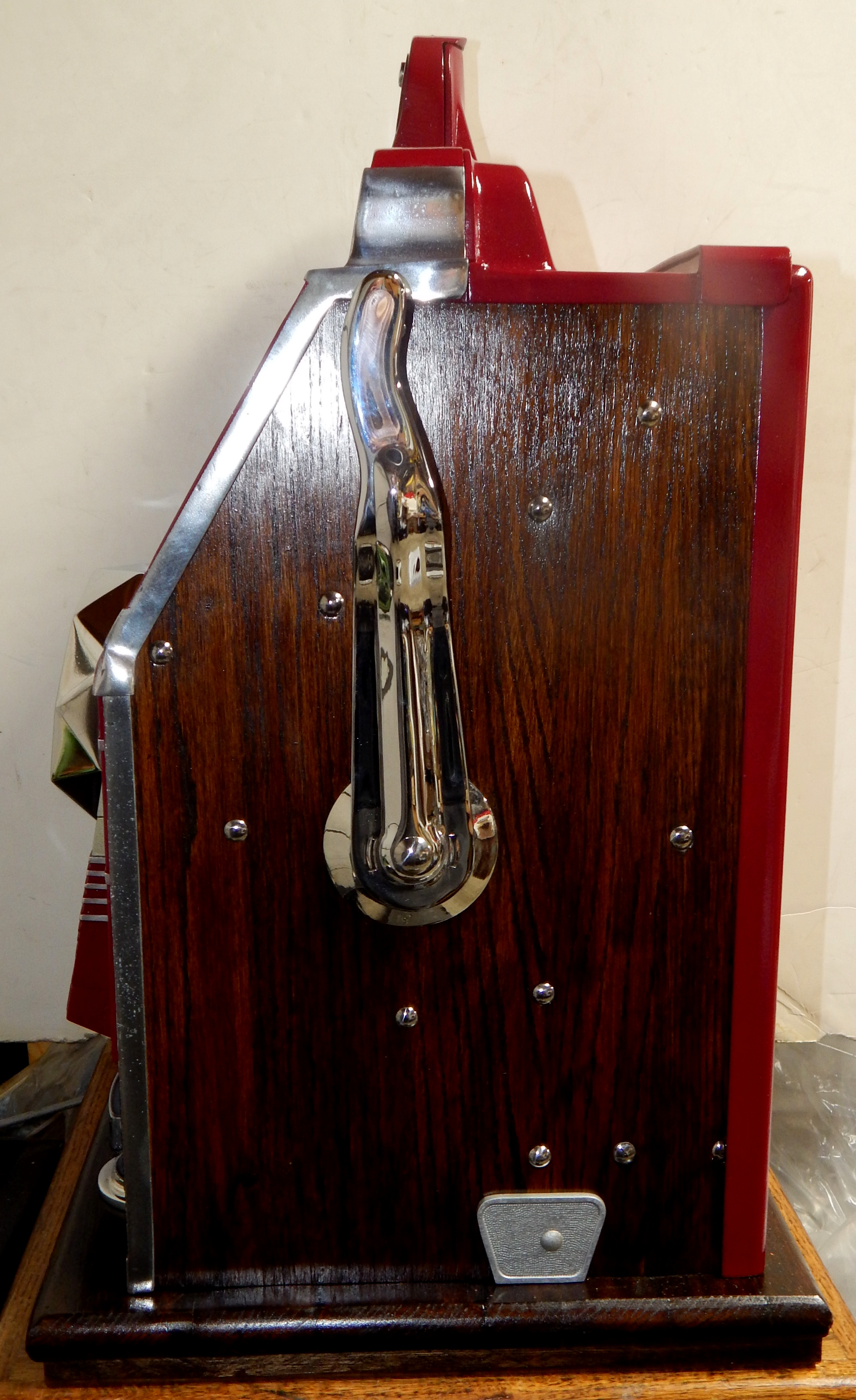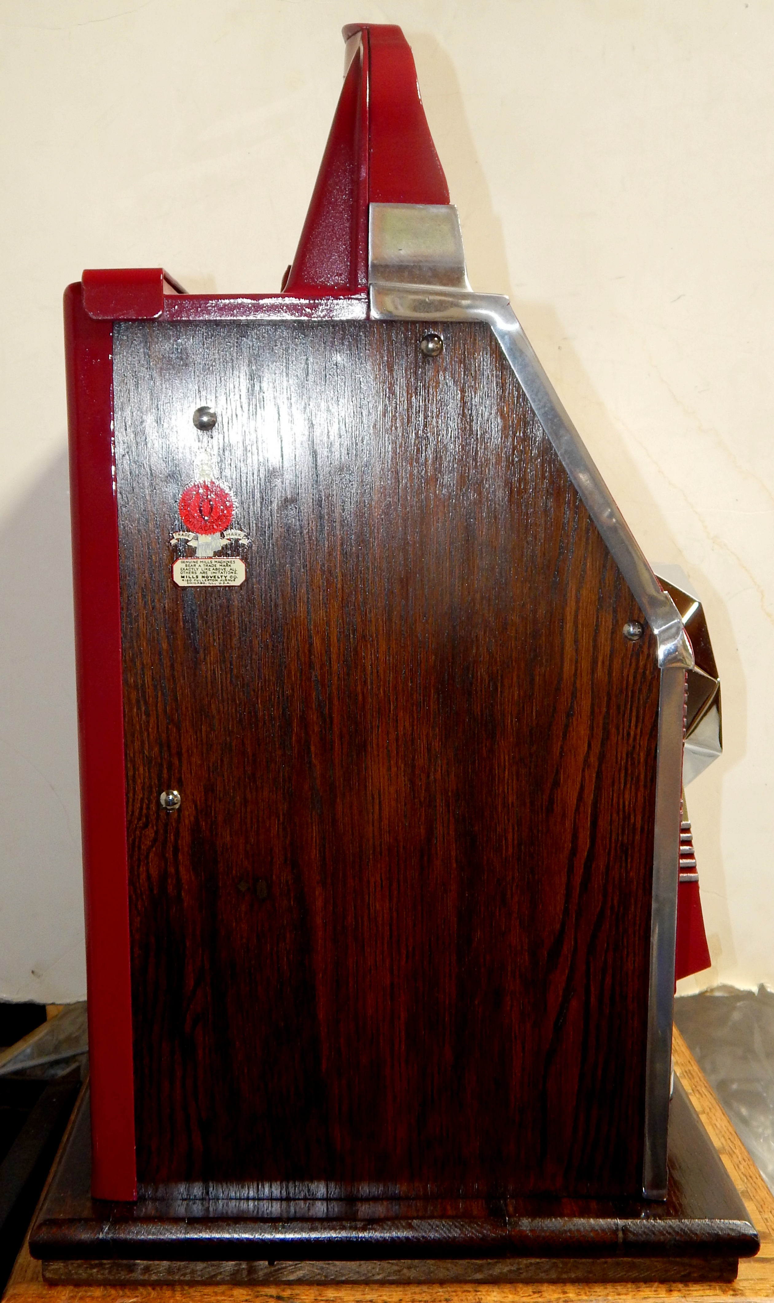 Mills 1938 Bursting Cherry "Melon Bell" 5 cent, restored, painted burgundy and gold, with red and green trim colors. Original award card, Jackpot with reserve, original back door and lock with one key, original cash box, new reel strips, oak cabinet. What is special about this slot machine is it has two Jackpots, one for three Bars and the other is for three Melons. The large diamond jackpot on the front was for the three melons. Back in the day operators would place a watch or paper money in the diamond on the front to attract more players. Plays very easy.