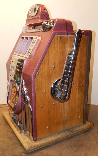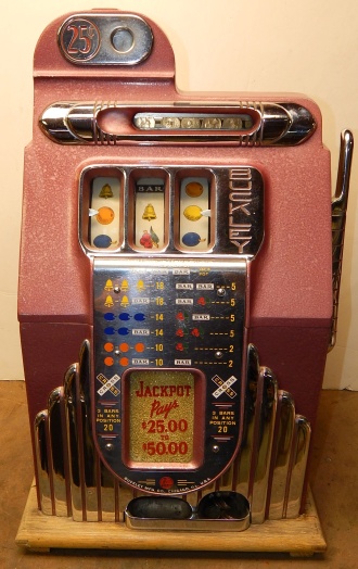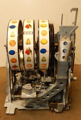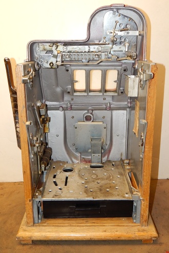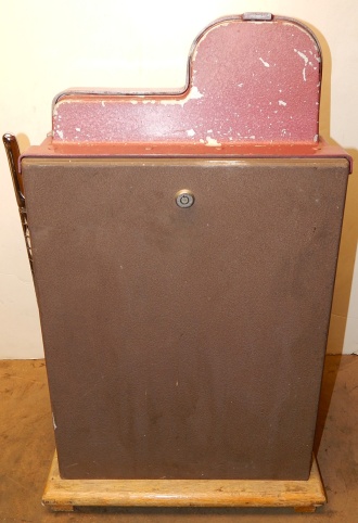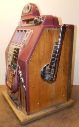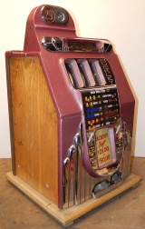 1948 Buckley Criss Cross Jackpot Bell 25 cent, comes with six original jackpot tokens, original extra large cash box, original reel strips, original award card, and original back door, oak cabinet. Matching serail number on the cabinet and mechanism. All the chrome trim on this machine looks to be very good condition. Looking at the mechanism, this machine didn't see much service. The paint also looks to be original, a very nice machine inside and out. There is a small piece missing at the top on the side (see picture) not noticeable from the front. If you look close at the inspection tag on the inside of the cabinet, you will see it's a 2/5 pay out with a 86% reel bundle. Play's very easy and pays as it should. If you are looking for a very nice example of a Buckley Slot machine here you are.