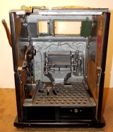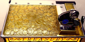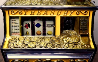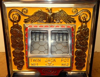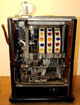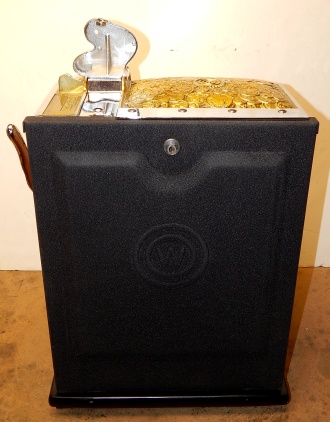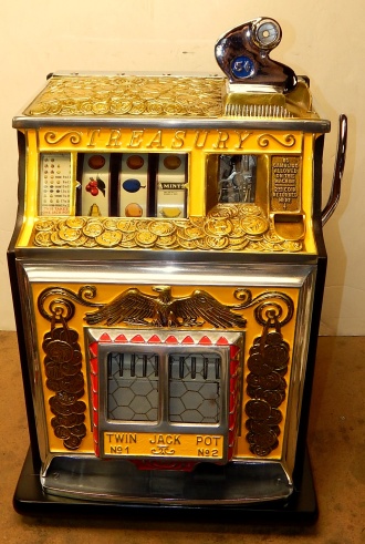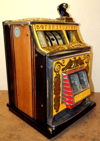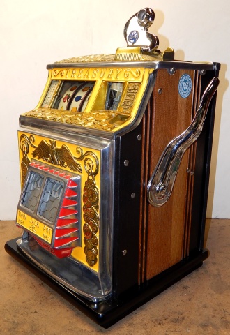 1937 Watling Treasury 5 cent, restored back to the original colors, polished casting with original tin reel strips, original back door with the original watling lock and key, twin Jackpots, original cash box with lock and key. Very nice oak cabinet. Play and pays as it should.