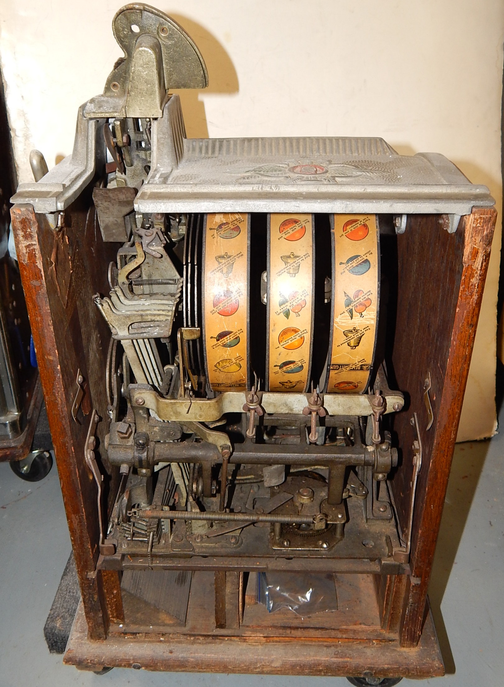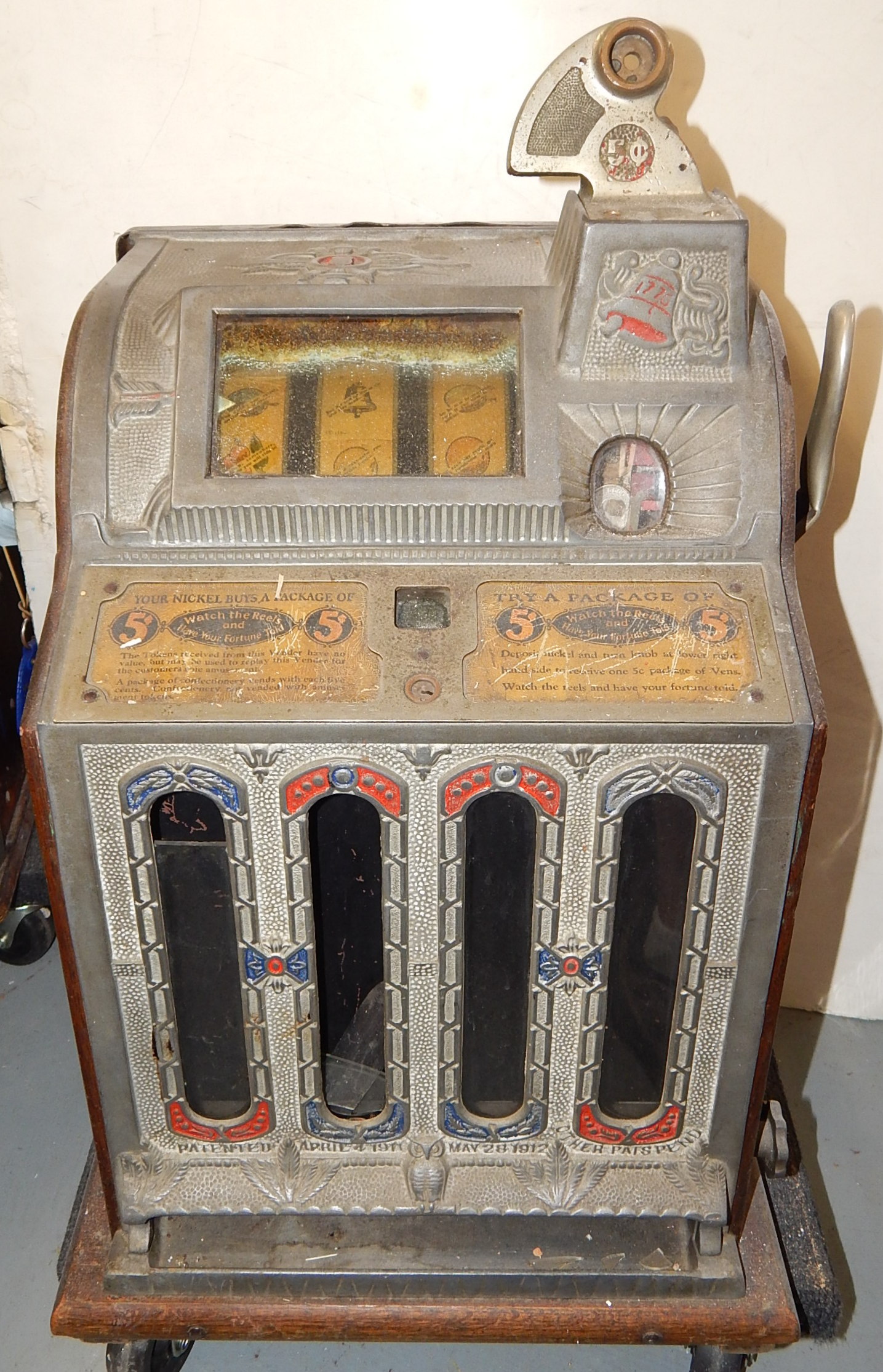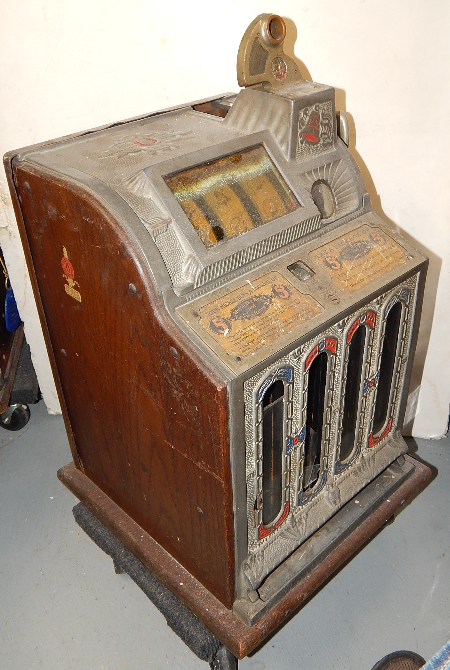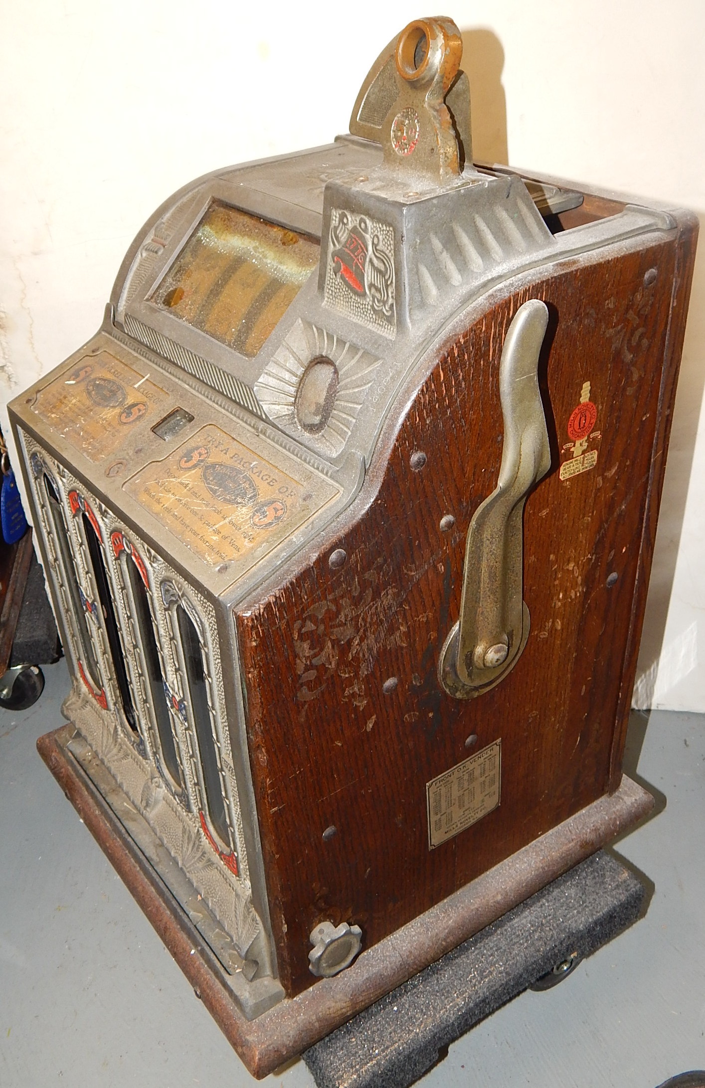 1926 Mills FOK 4 Column Vender 5 cent, original condition. This machine has a lot of things going for it, Mint vender, which give you a roll of mints every play plus.  Plays great and pays as it should. In line to be restored if not sold first.