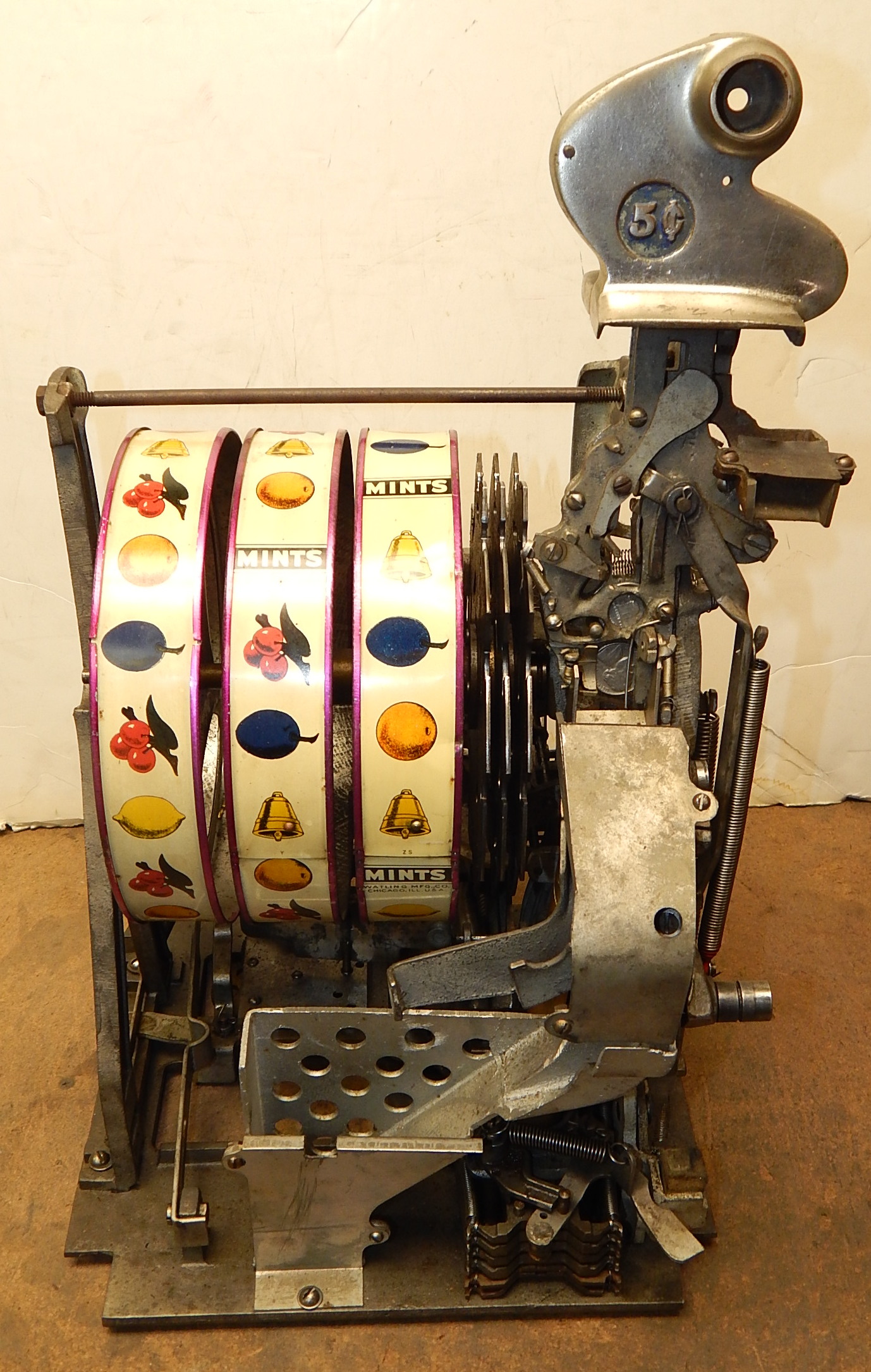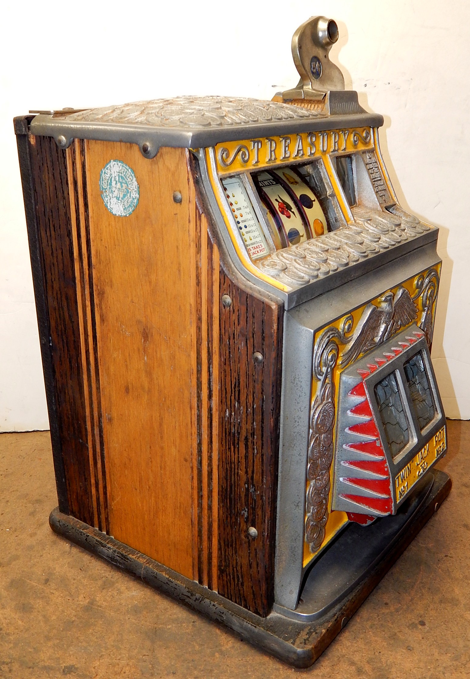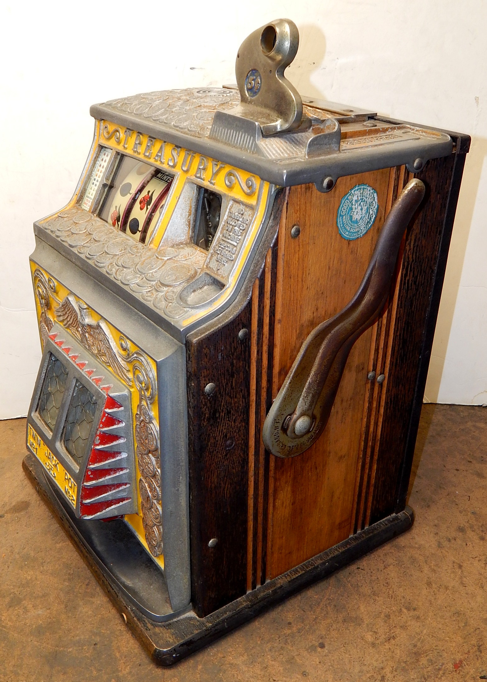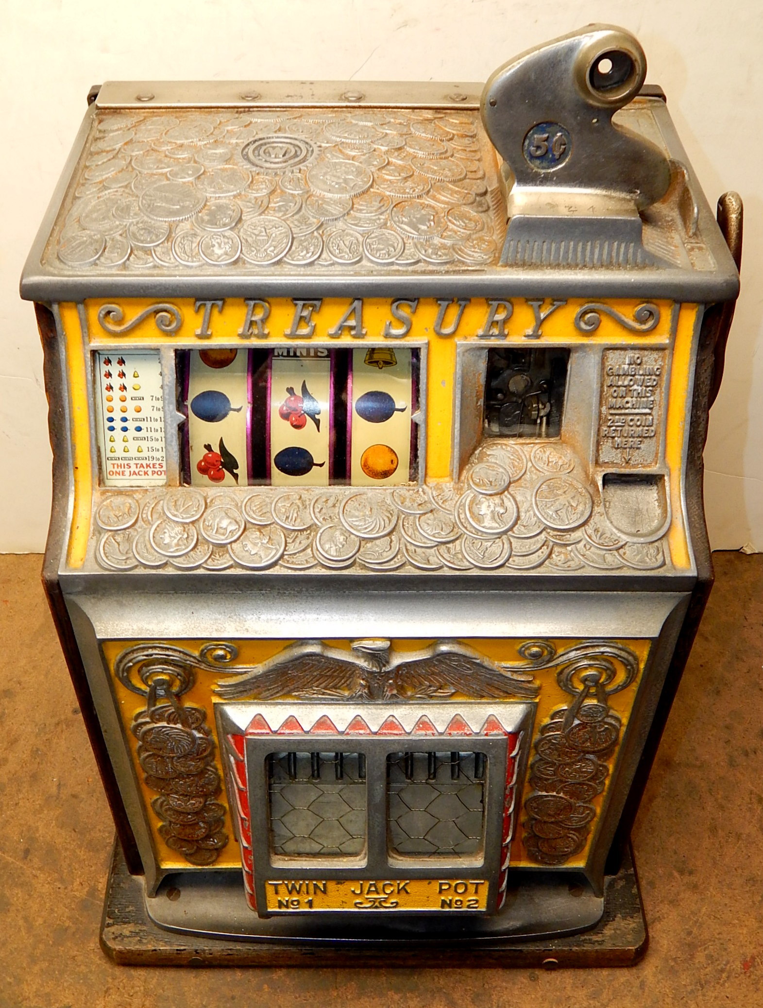 Watling 1933 Treasury 5 cent, with original reel strips, original back door with the original Watling lock and key, twin Jackpots, cash box with lock and key. 3-5 pay out.
