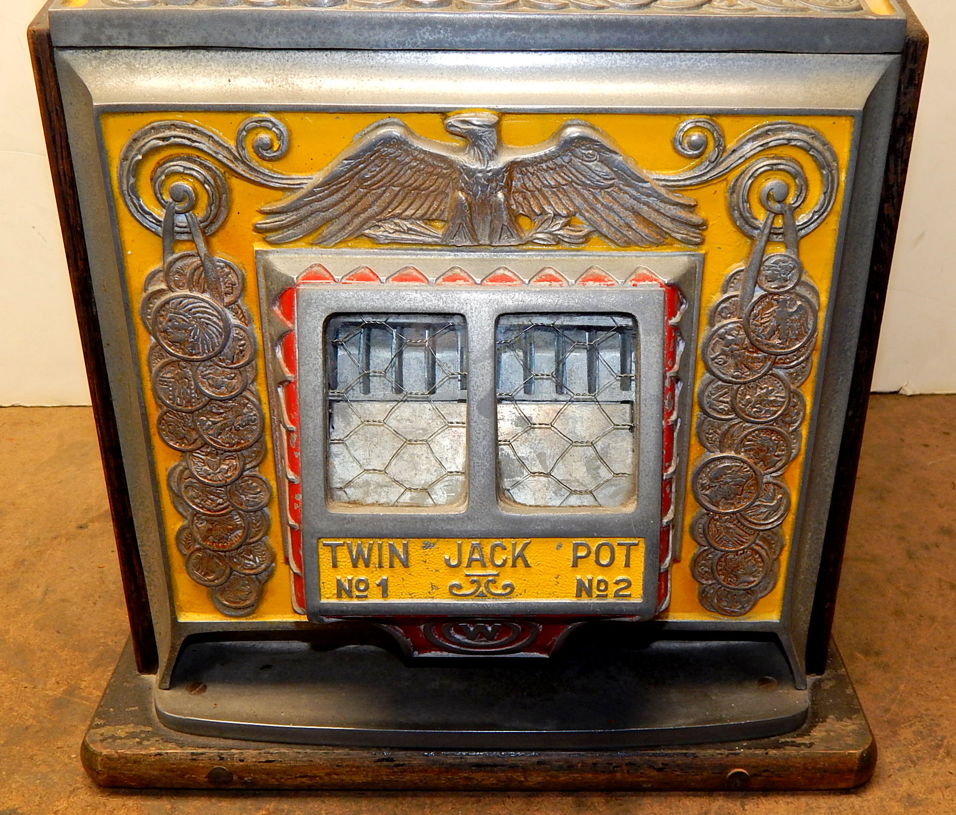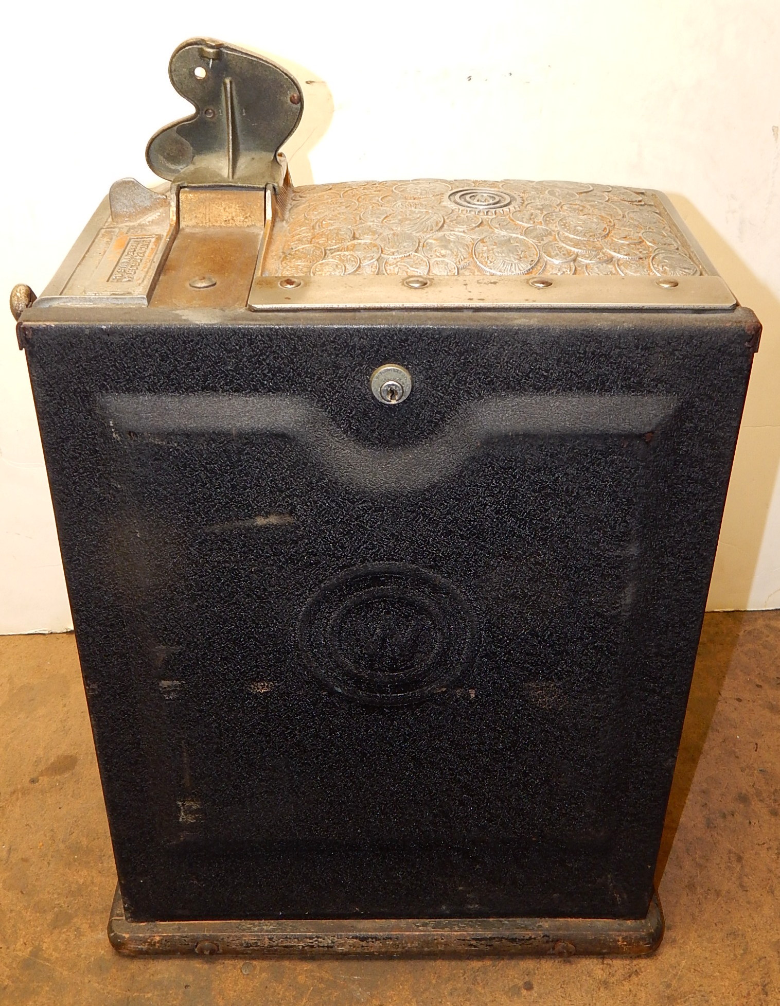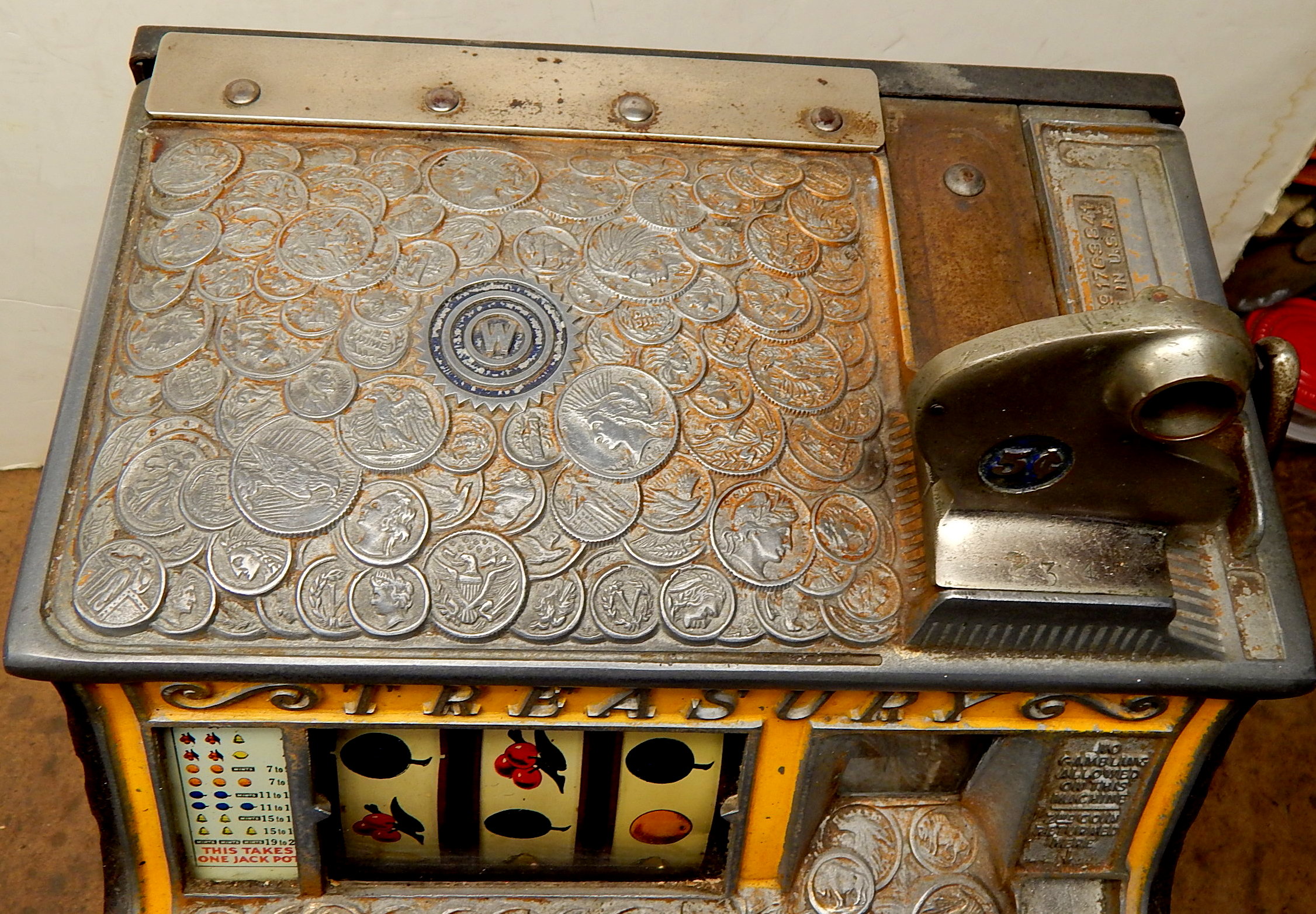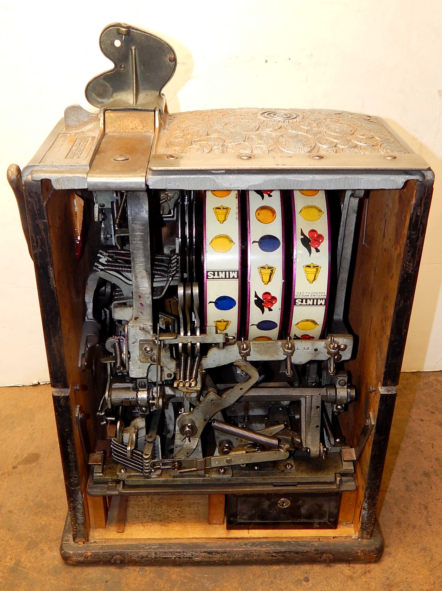 Watling 1933 Treasury 5 cent, with original reel strips, original back door with the original Watling lock and key, twin Jackpots, cash box with lock and key. 3-5 pay out.