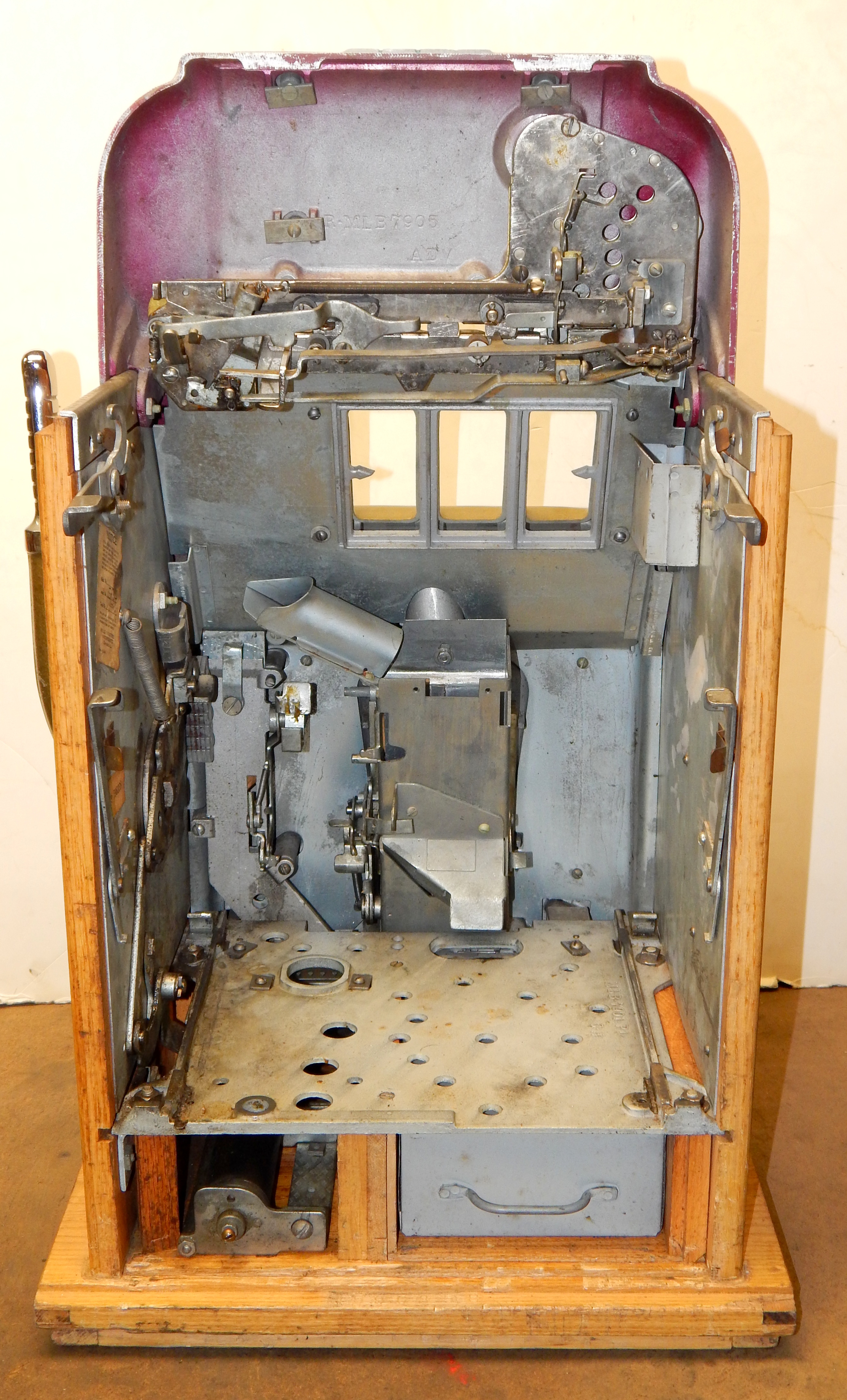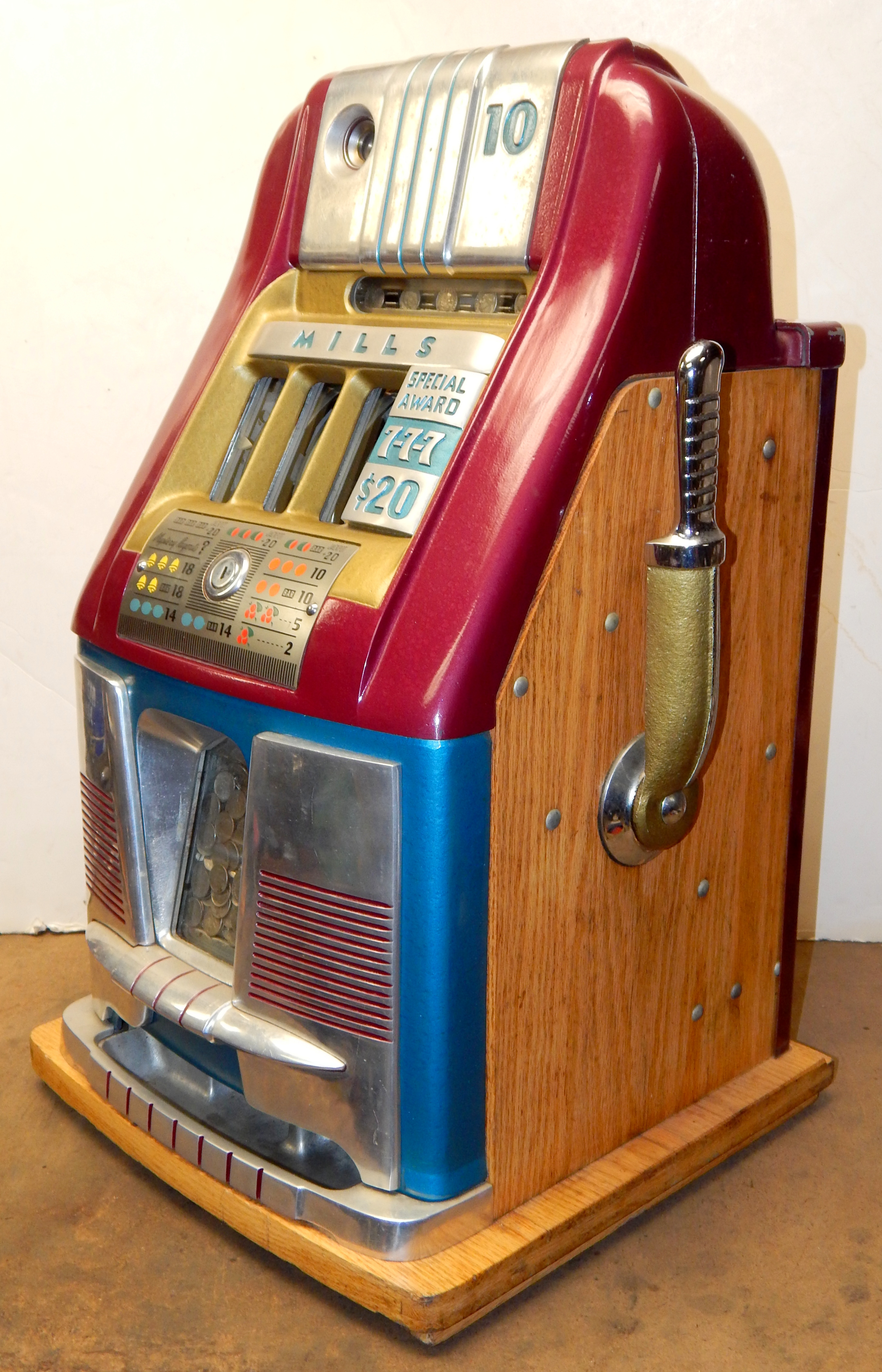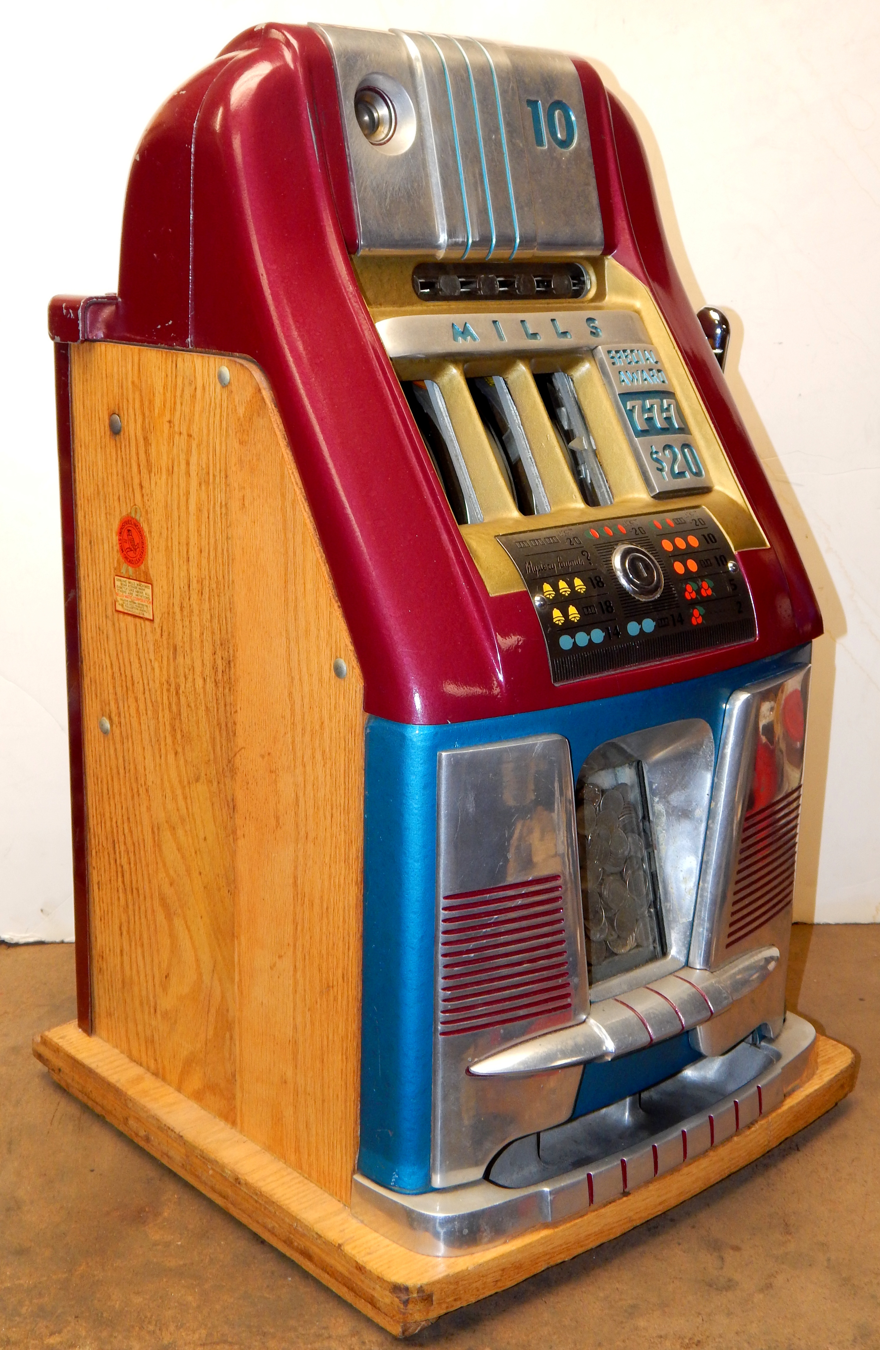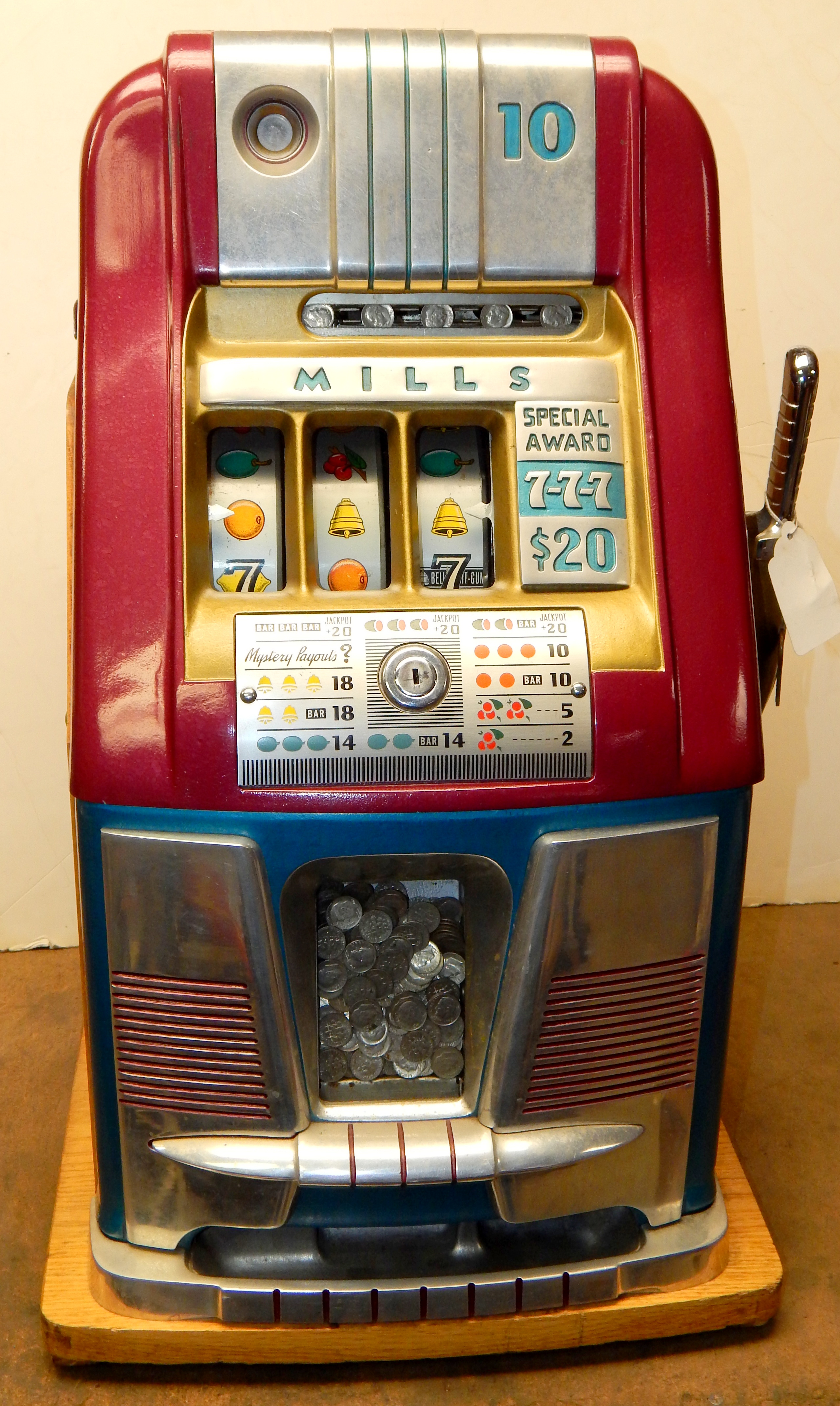 1950  Mills "7-7-7" Hi-Top 10 cent, in original condition, reel strips are in mint condition. Front load Jackpot with lock and key. Mint original cash box, oak cabinet, mint original award card. This machine comes with 7-7-7 token vendor with three original 7-7-7 tokens. The back door has the original Mills lock with keys. Plays very easy and pays as it should. If you are looking for an all original condition machine here you are.