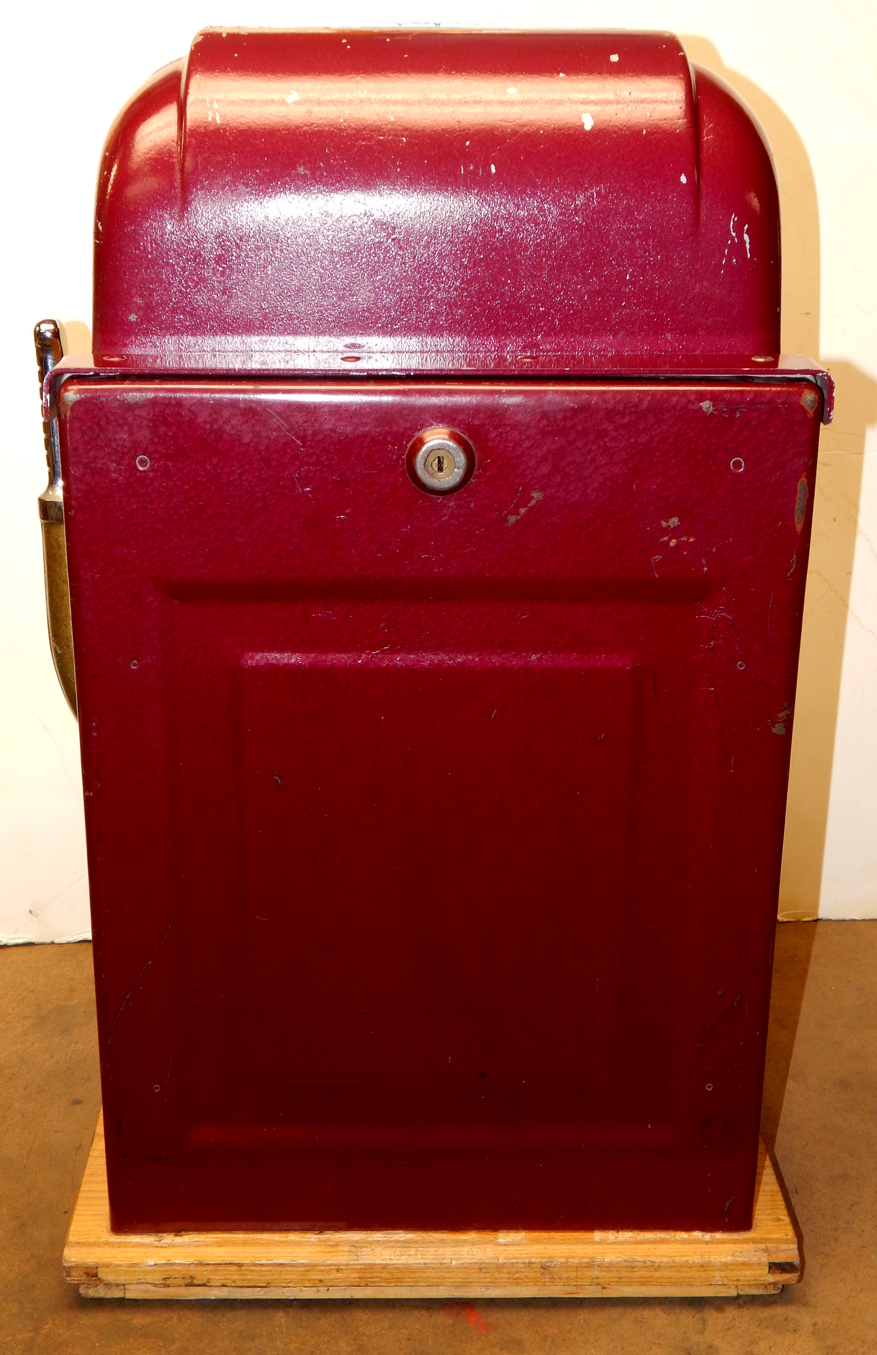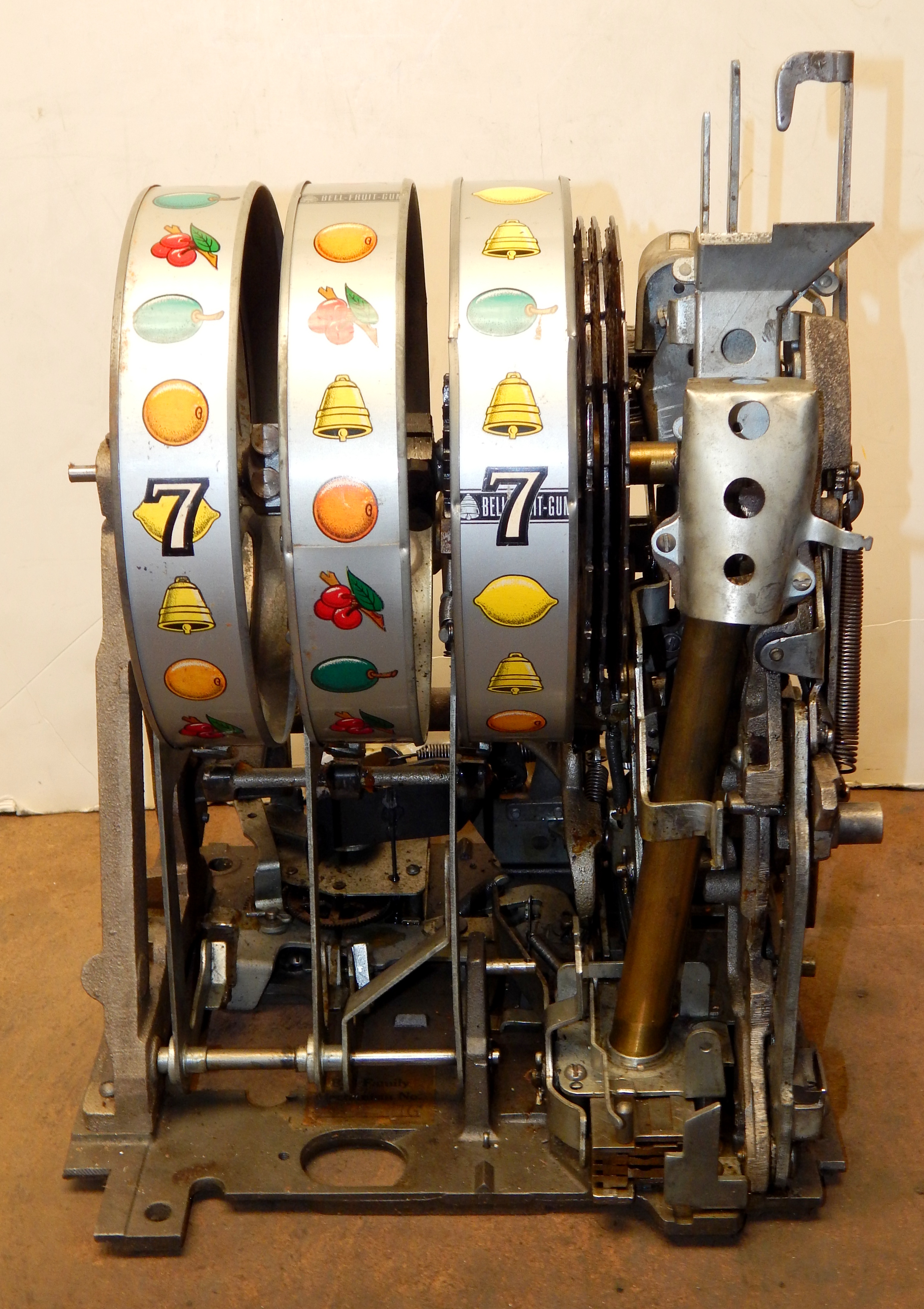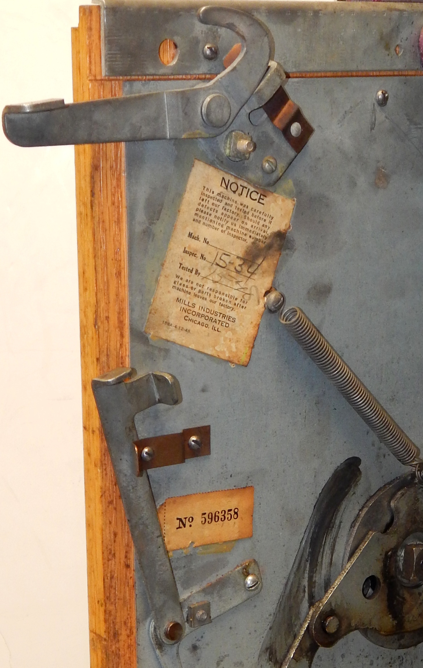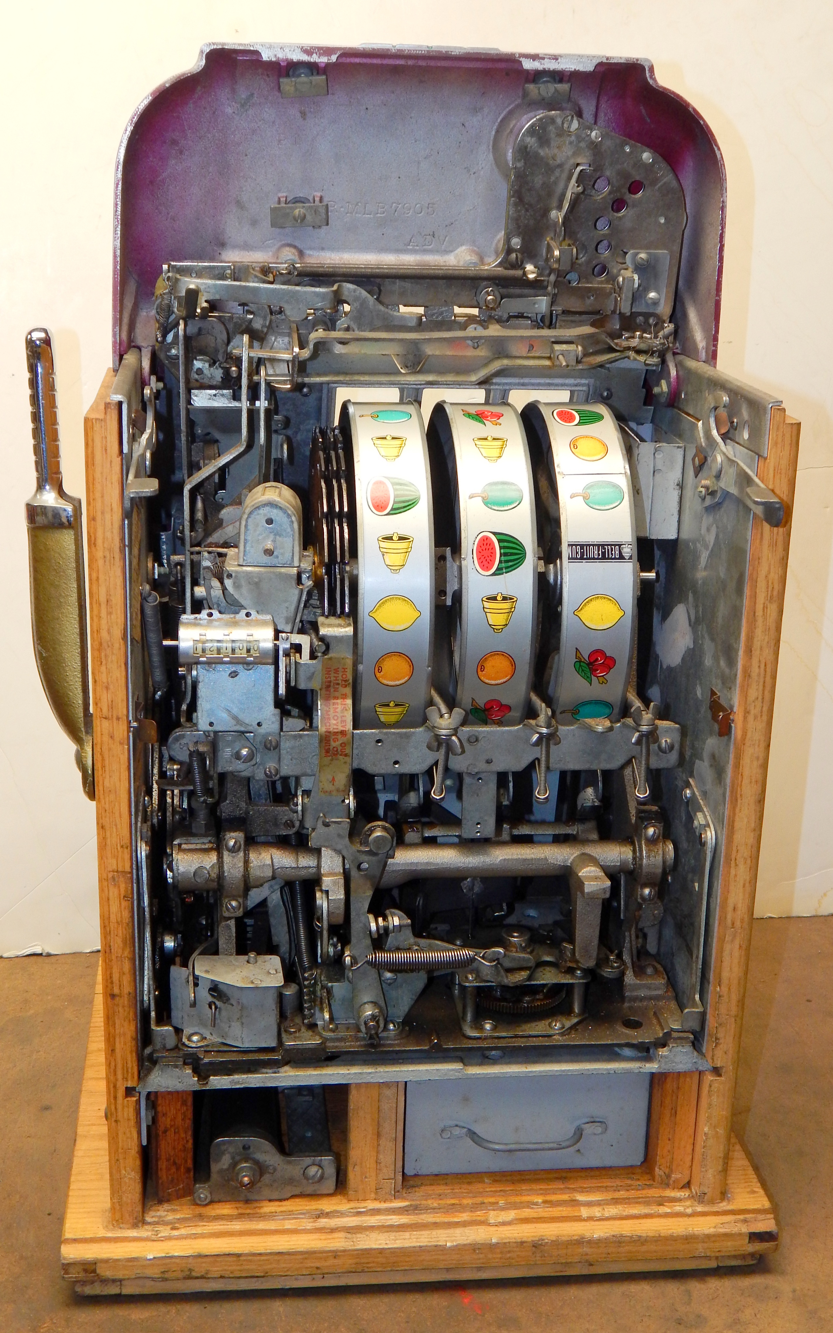 1950  Mills "7-7-7" Hi-Top 10 cent, in original condition, reel strips are in mint condition. Front load Jackpot with lock and key. Mint original cash box, oak cabinet, mint original award card. This machine comes with 7-7-7 token vendor with three original 7-7-7 tokens. The back door has the original Mills lock with keys. Plays very easy and pays as it should. If you are looking for an all original condition machine here you are.