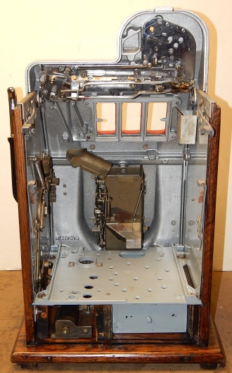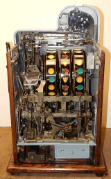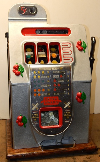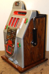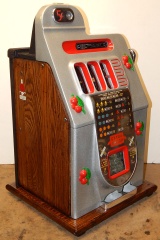 Mills 1946 Black Cherry 5 cent, restored. Silver, trimmed in red with black wrinkle finish back door. This is a very nice machine restored back to the original colors. Original award card, Original reel strips. Jackpot with reserve, original back door with original Mills lock with one key, original cash box. This machine has the criss cross payout on bars, any where in the window pays 18 coins. Plays very easy.