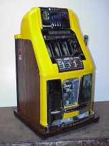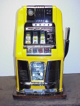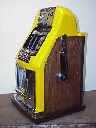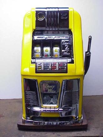 Mills 1959 Deuce Wild 25 cent, This is a very nice machine restored back to the original colors Yellow with Black. Mint condition award card, Jack pot with reserve, original back door and lock with two keys, original cash box. All the trim on this machine was chrome plated to add a little flash with the bright color.