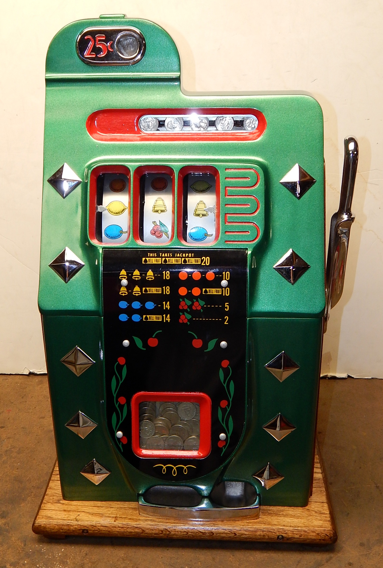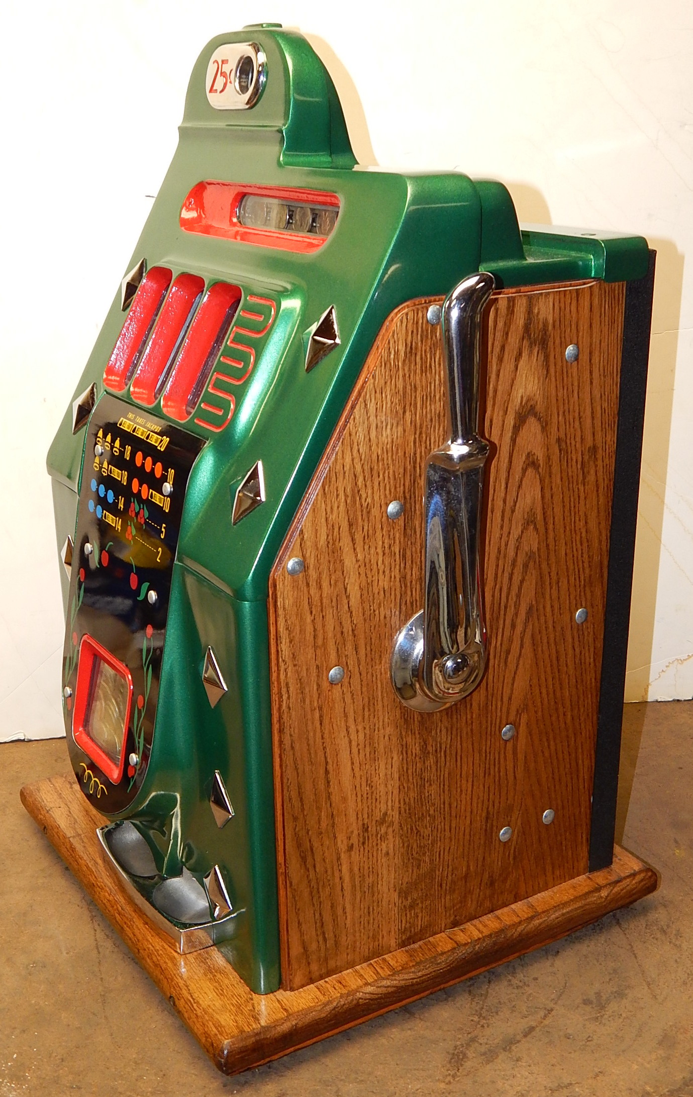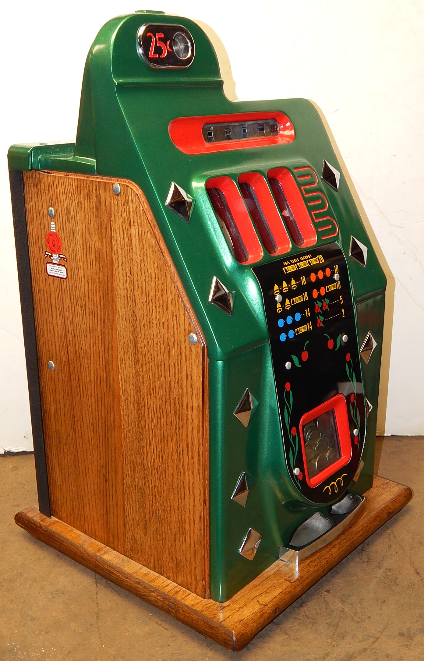 1942 Mills Diamond Front, 25 cent. This is a very nice machine previously restored condition. Painted green, trimmed in red with chrome diamonds. The cabinet on this machine has a beautiful oak wood finished, NO JACKPOT, new award card, new back door with Mills lock, original cash box, new reel strips, original serial number still on the side of the cabinet. Plays very easy.