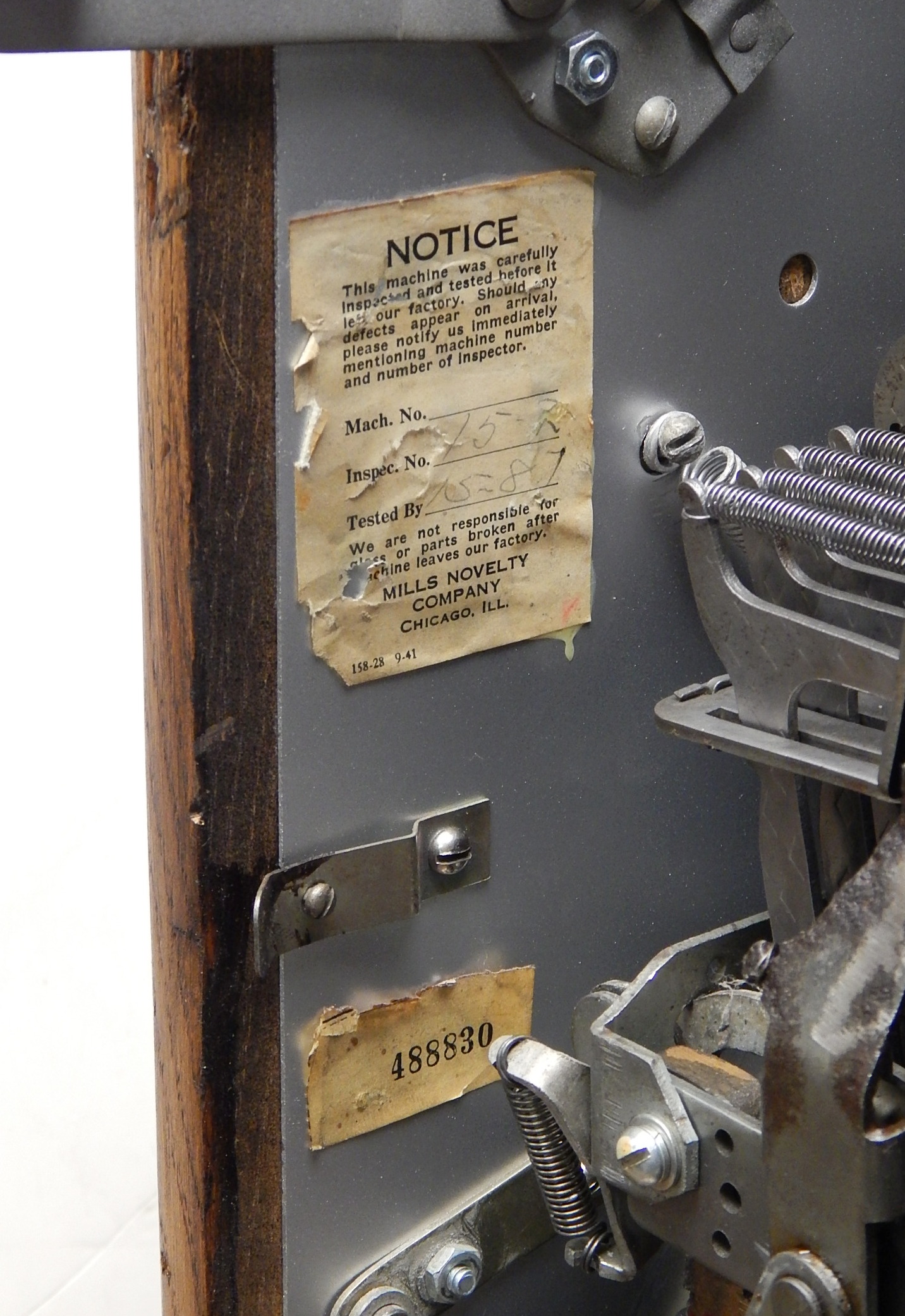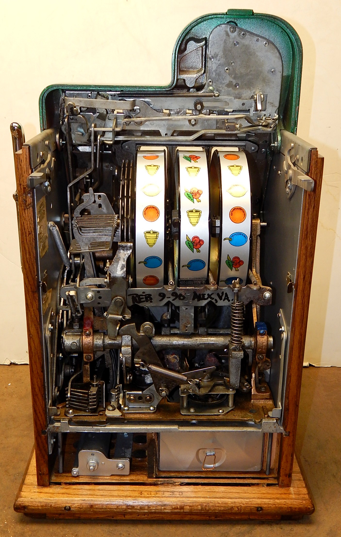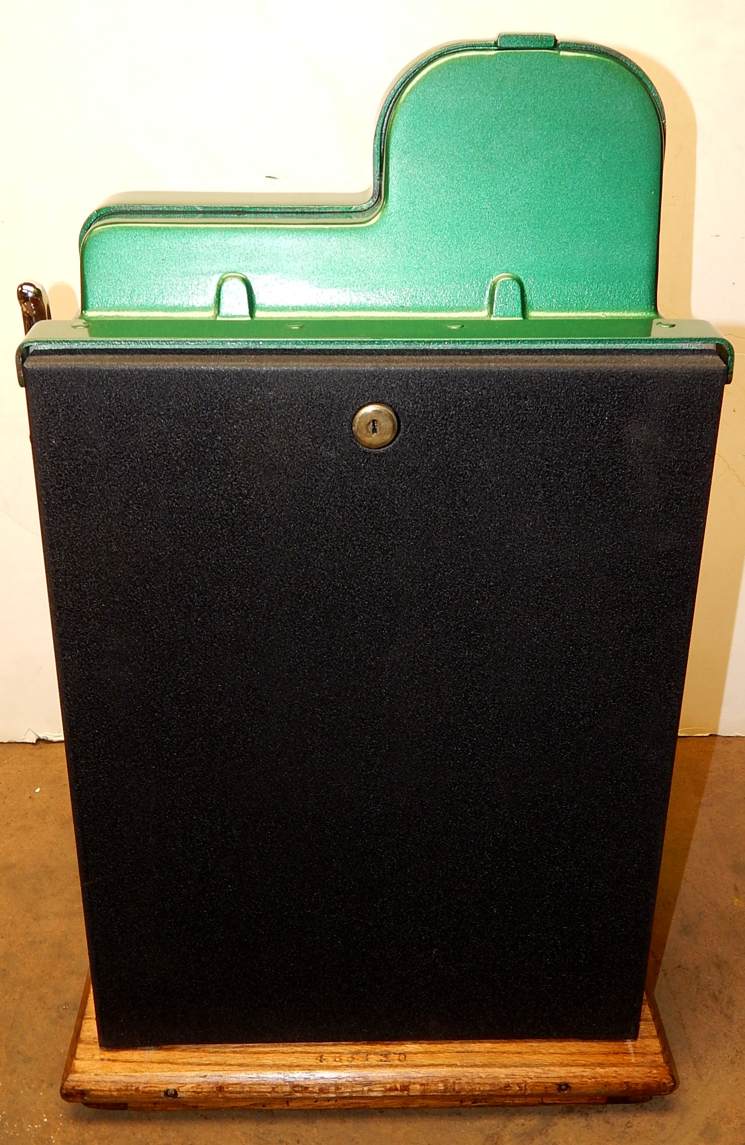 1942 Mills Diamond Front, 25 cent. This is a very nice machine previously restored condition. Painted green, trimmed in red with chrome diamonds. The cabinet on this machine has a beautiful oak wood finished, NO JACKPOT, new award card, new back door with Mills lock, original cash box, new reel strips, original serial number still on the side of the cabinet. Plays very easy.