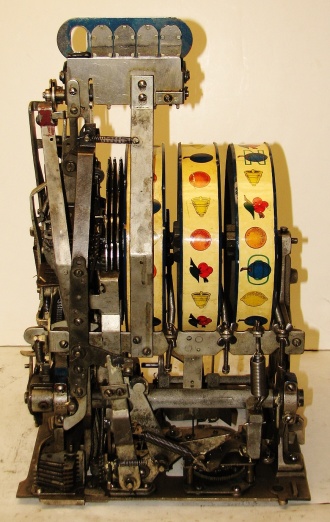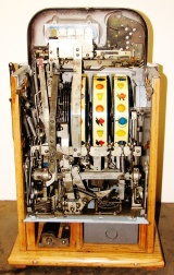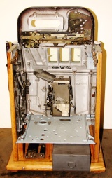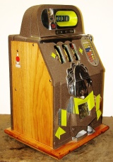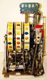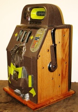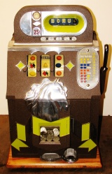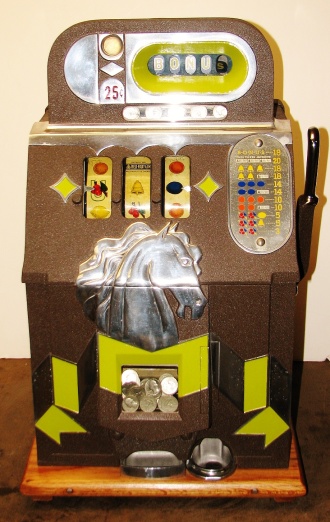 Mills 1938 Horse Head Bonus, 25 cent, restored, painted wrinkle brown, trim in green with the Hard to find Bonus feature. Original reel strips, original award card, original cashbox, original back door with Mills lock with one key. Casting polish not plated. This is a machine we restored a few years back. When the BONUS letters on the first reel come up in order, corresponding letters will appear at the top right of the machine. Once the entire word BONUS is spelled out, you win 18 coins. This was another way Mills would try to keep people playing longer and if you had almost all the letters showing, it was hard to walk away.