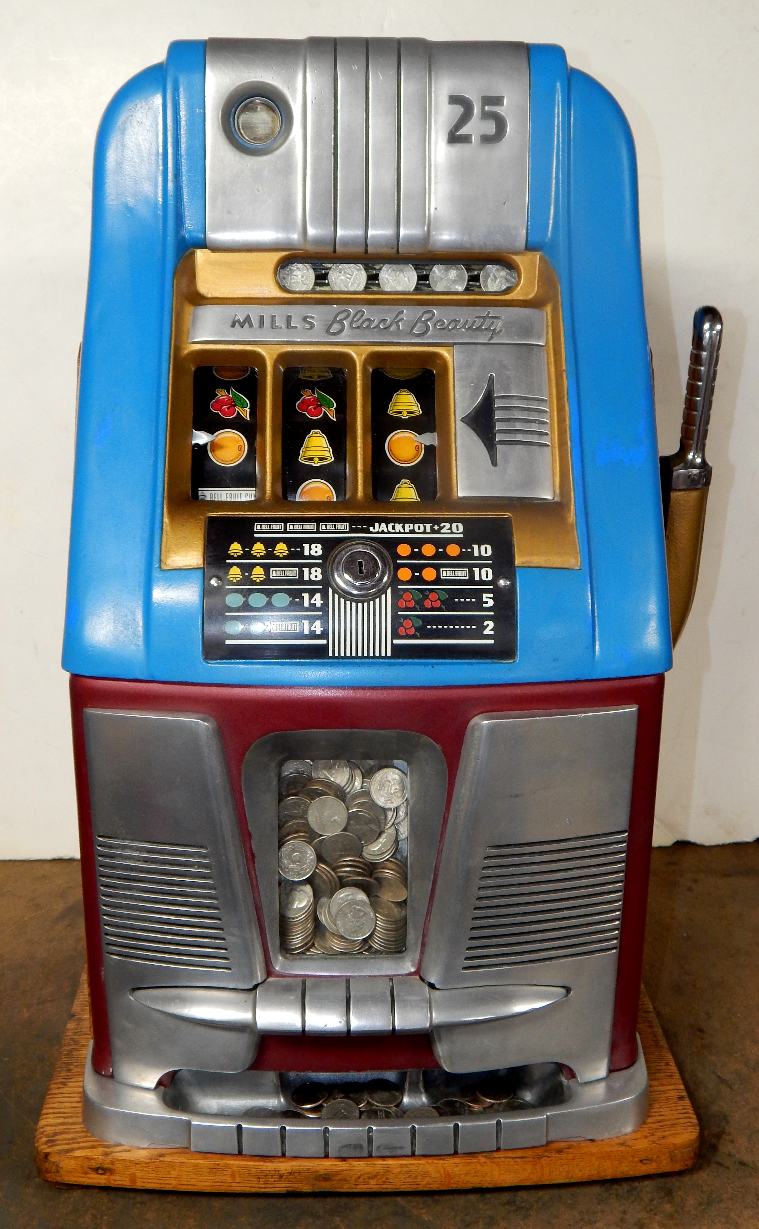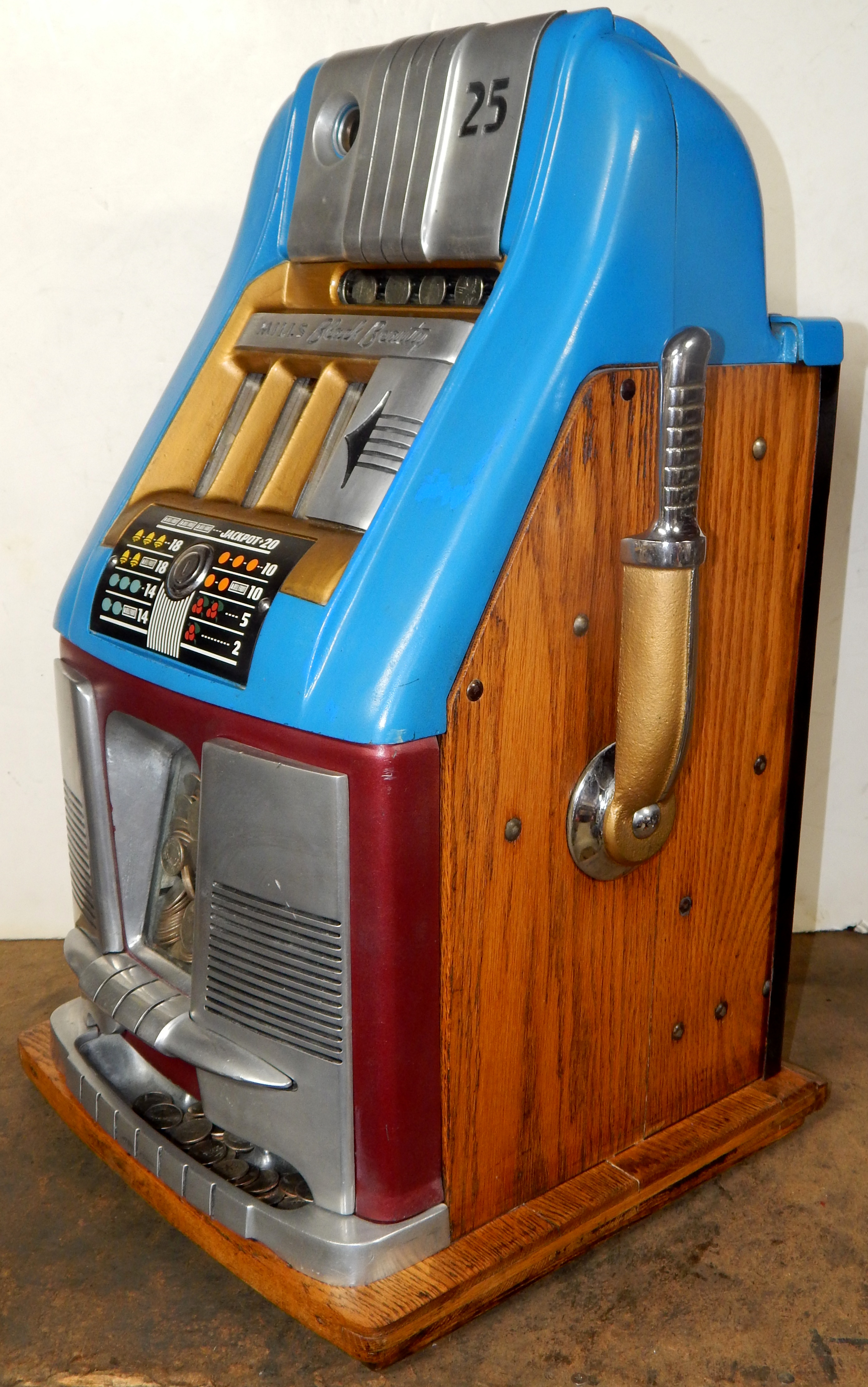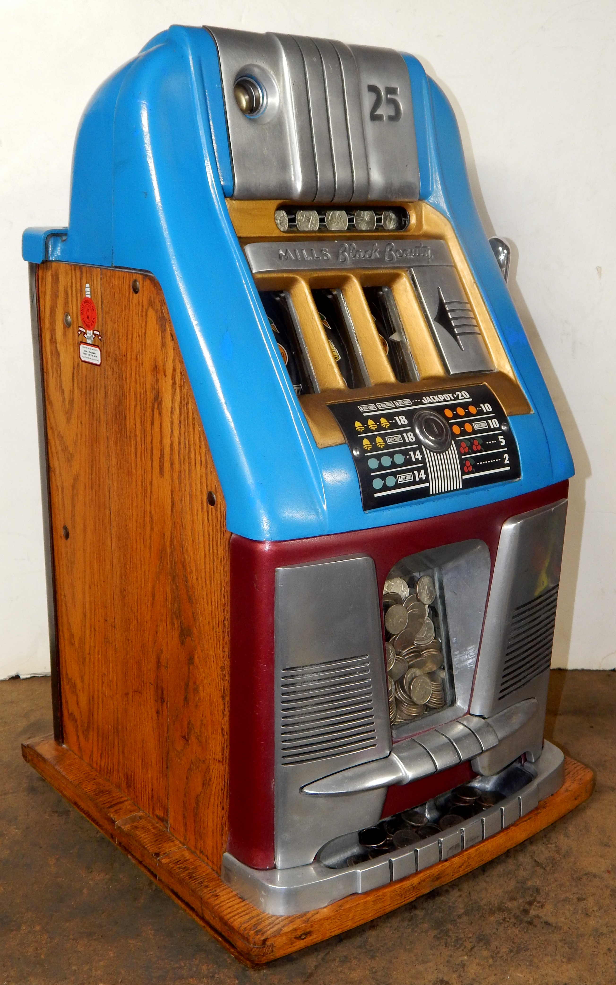 25 cent Mills Black Beauty black reel strips, front load Jackpot, oak cabinet original back door, original cash box, all locks are Mills locks with one key. Front loader lock and back door lock are keyed alike. If you are looking for a nice easy playing machine, here you are. This machine has been cleaned, lube and adjusted . Ready for many years of trouble free play.