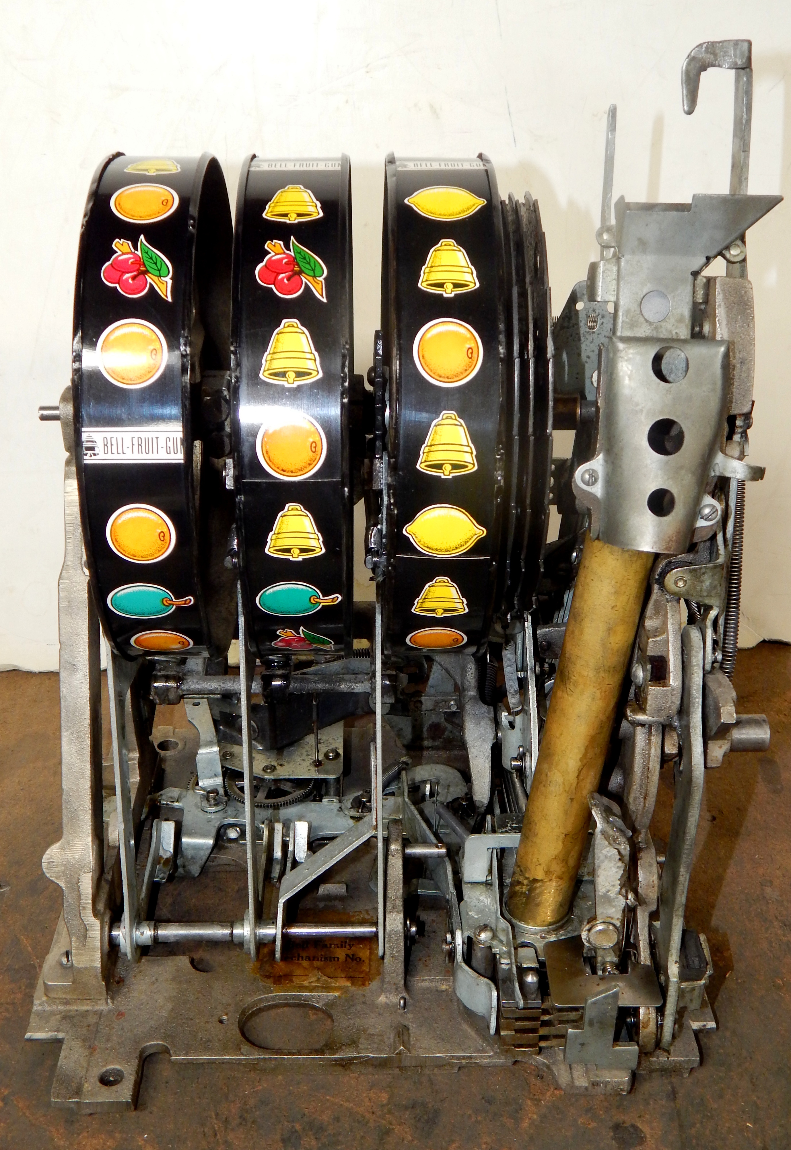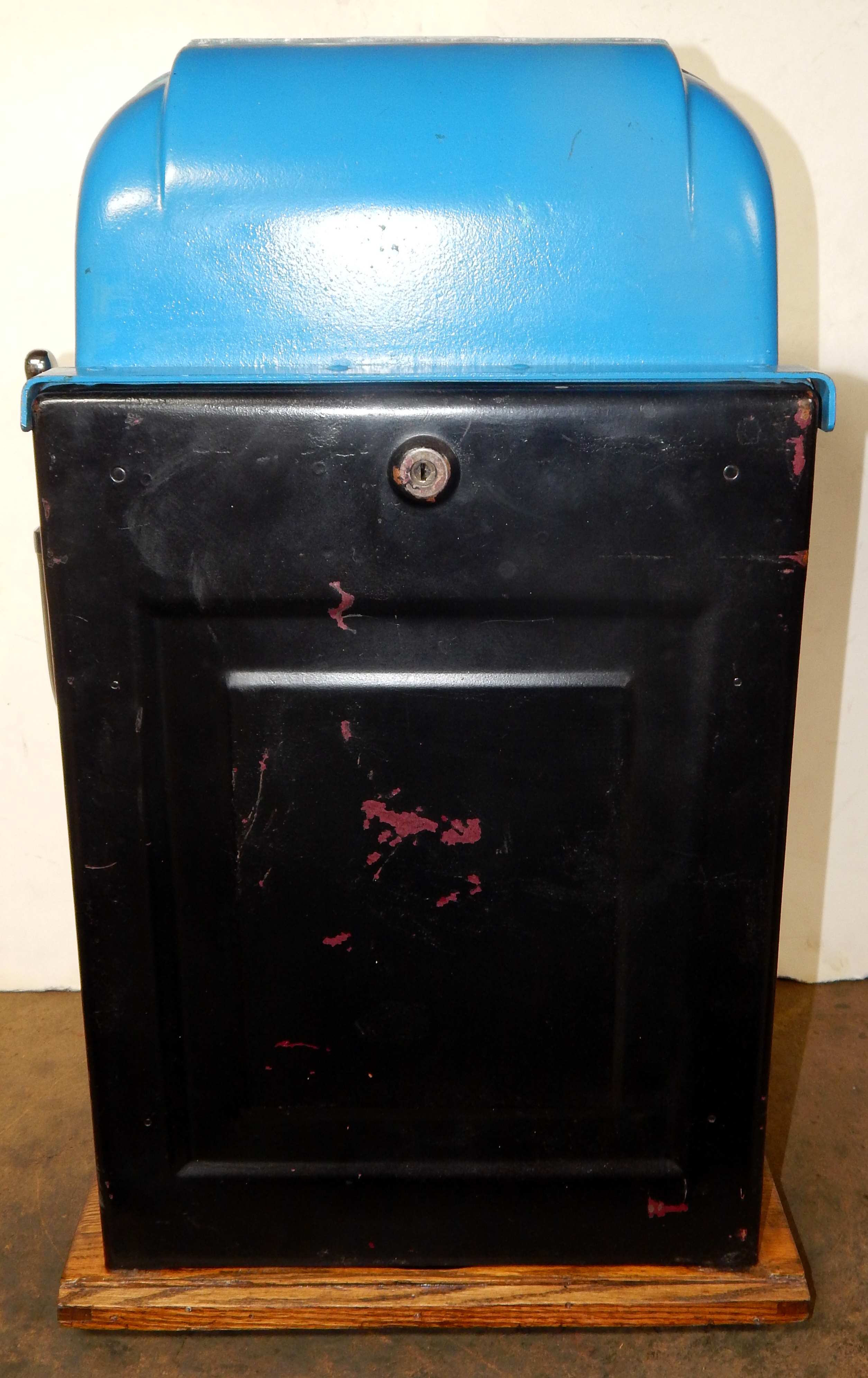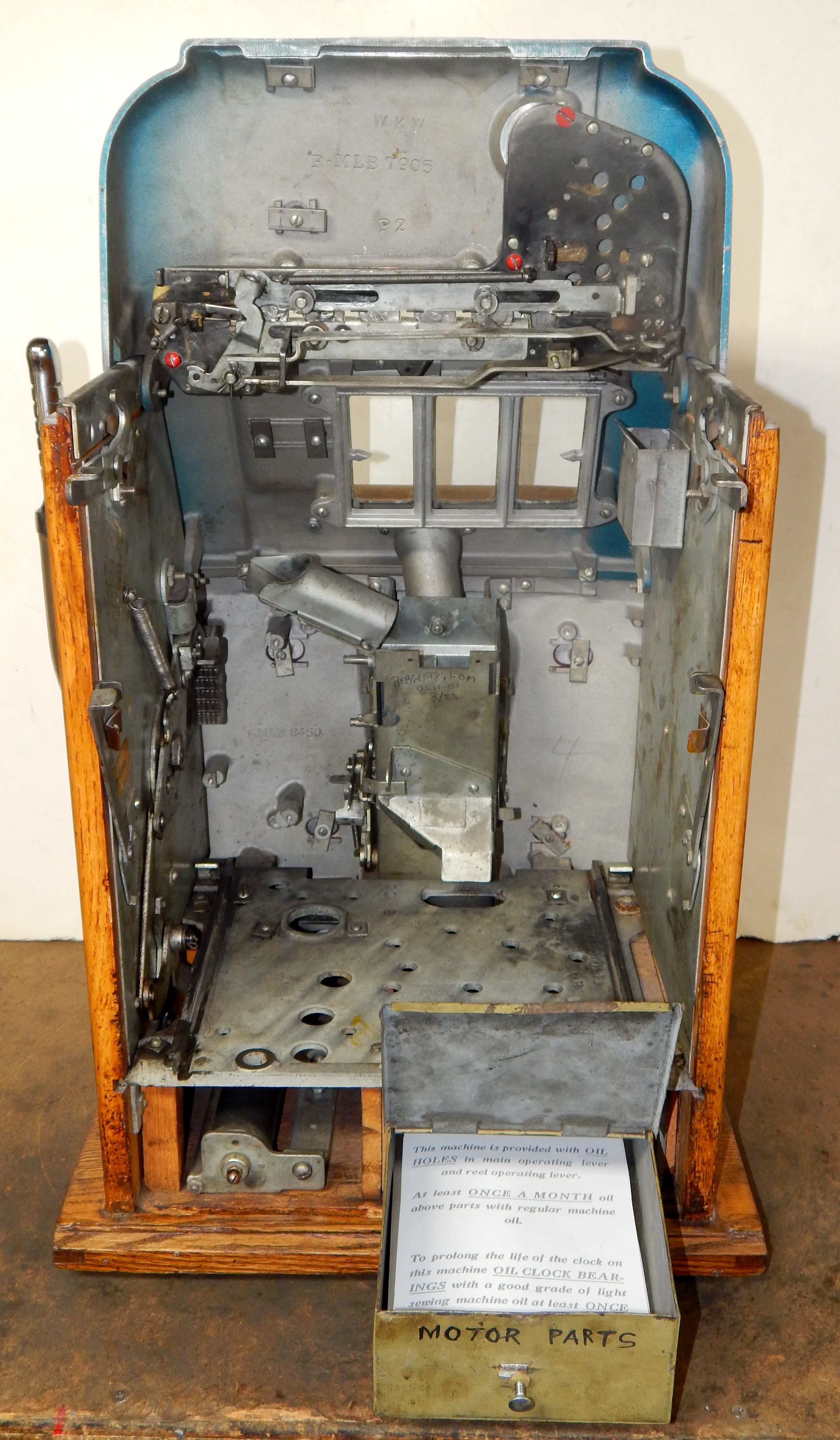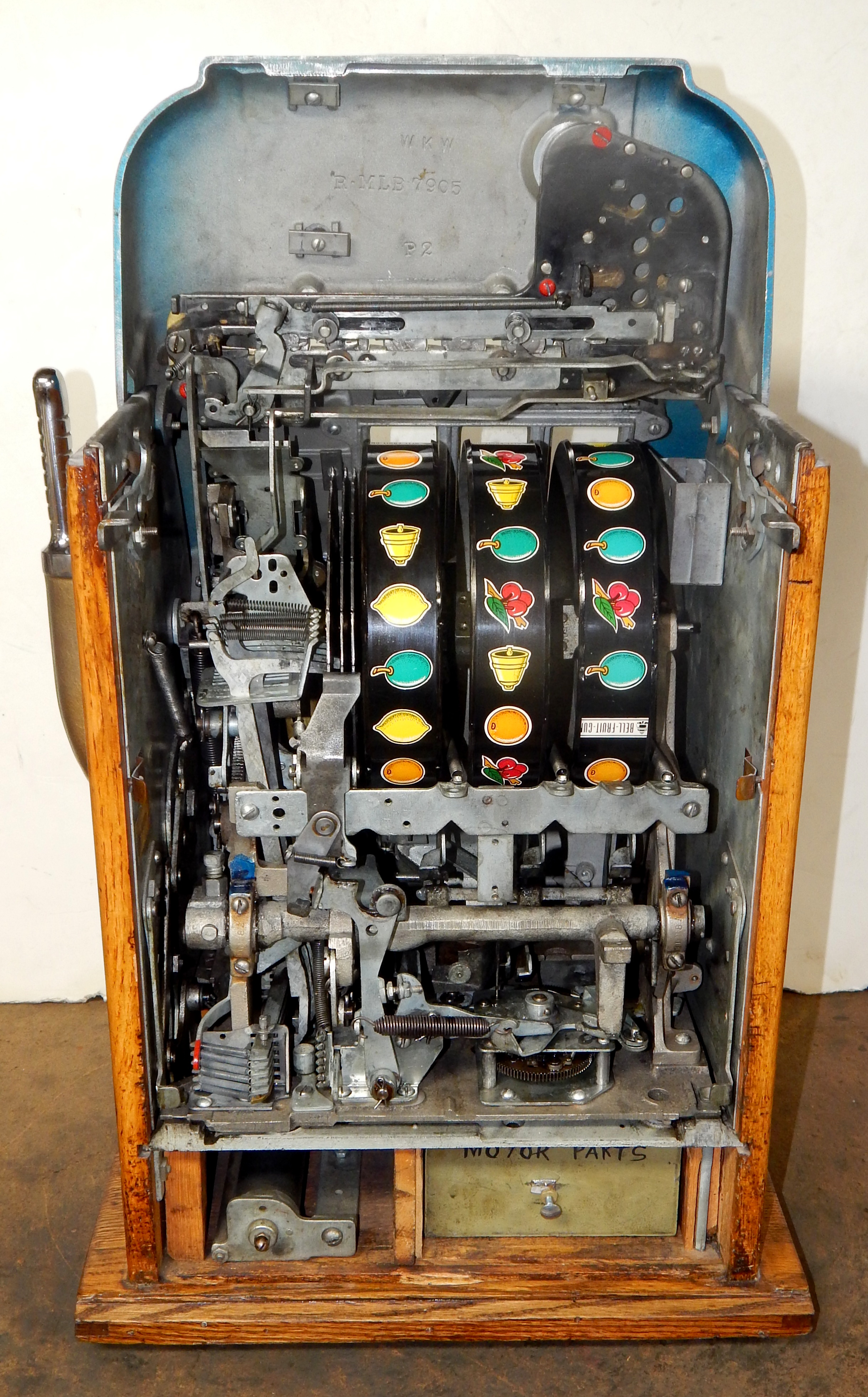 25 cent Mills Black Beauty black reel strips, front load Jackpot, oak cabinet original back door, original cash box, all locks are Mills locks with one key. Front loader lock and back door lock are keyed alike. If you are looking for a nice easy playing machine, here you are. This machine has been cleaned, lube and adjusted . Ready for many years of trouble free play.