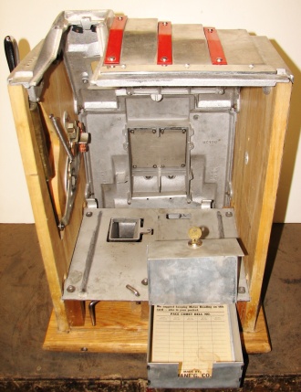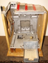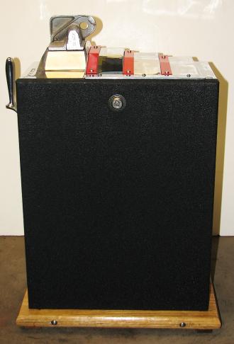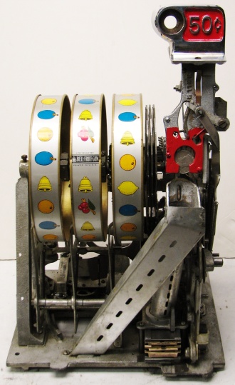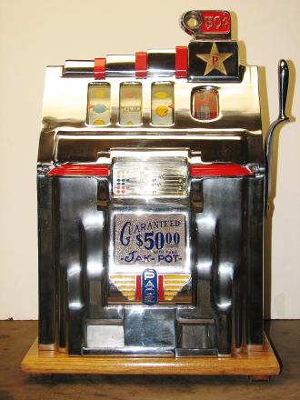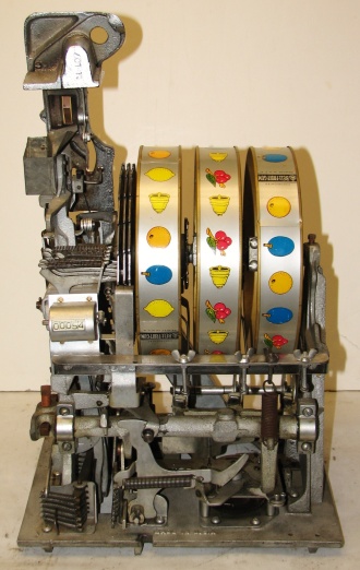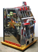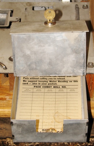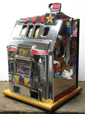 Pace 1948 Star Comet 50 cent, original reel strips, original back door, original cash box with Pace lock and key. Both sides have a beautiful high polish stainless steel plates, looks like chrome. Also still has the decal license from the 40's on the left side. This large coin machine has the Criss Cross feature and also plays 2-5 Bars cherry combonation on the frist two reels, play very nice. 2-5 pay out.