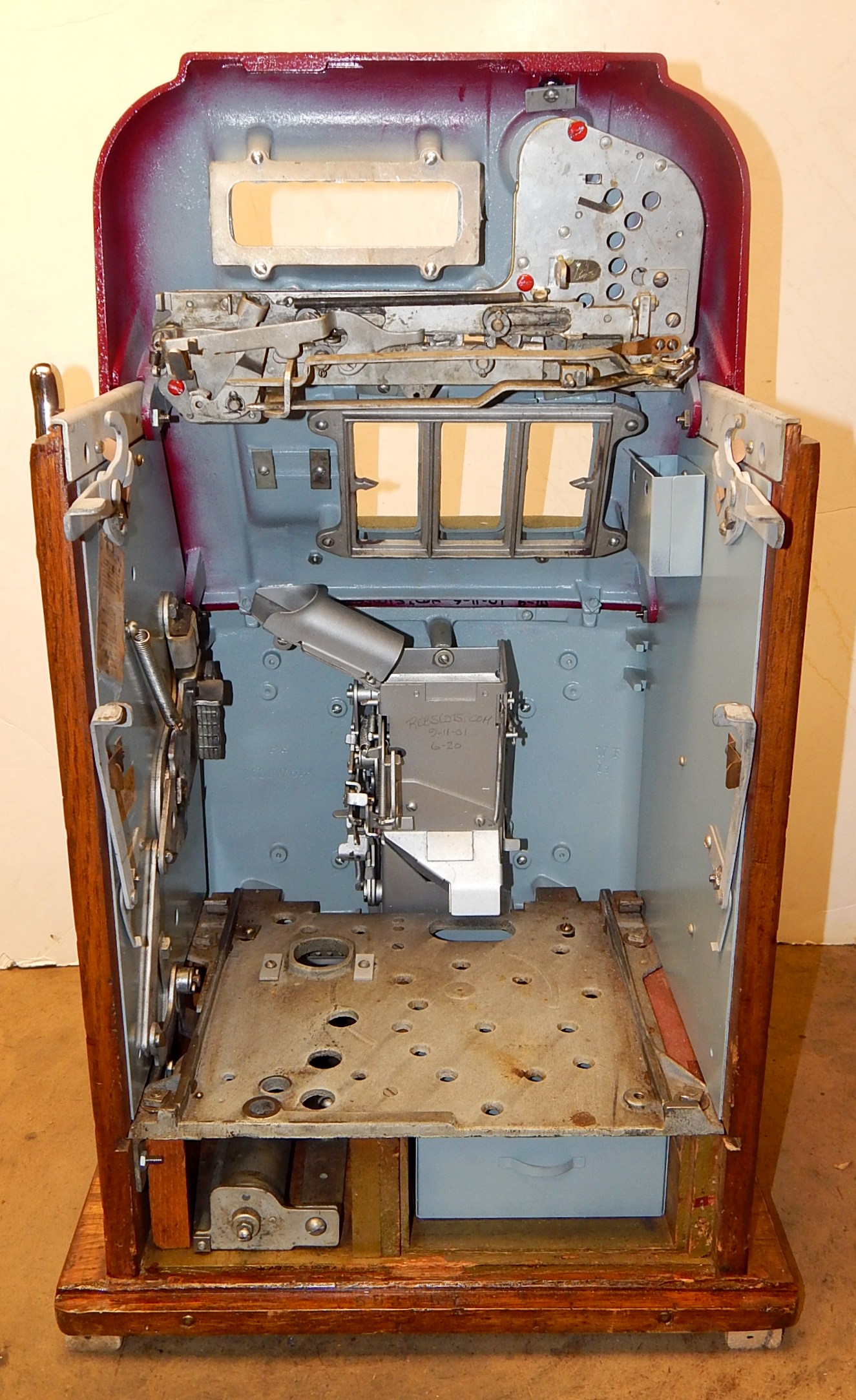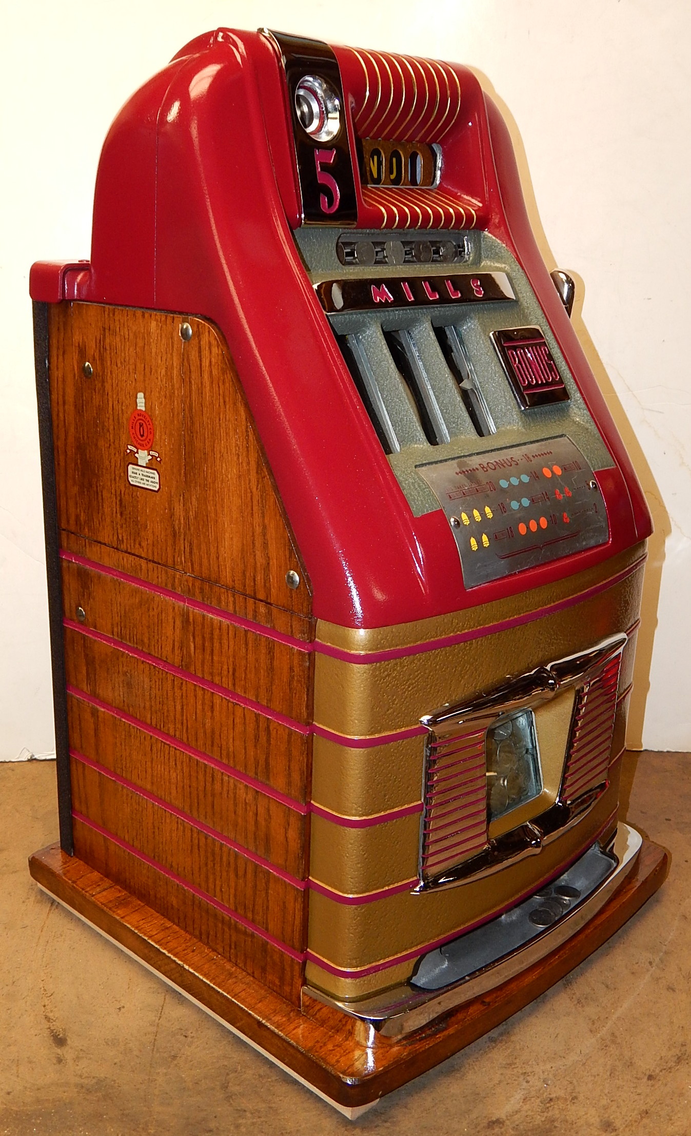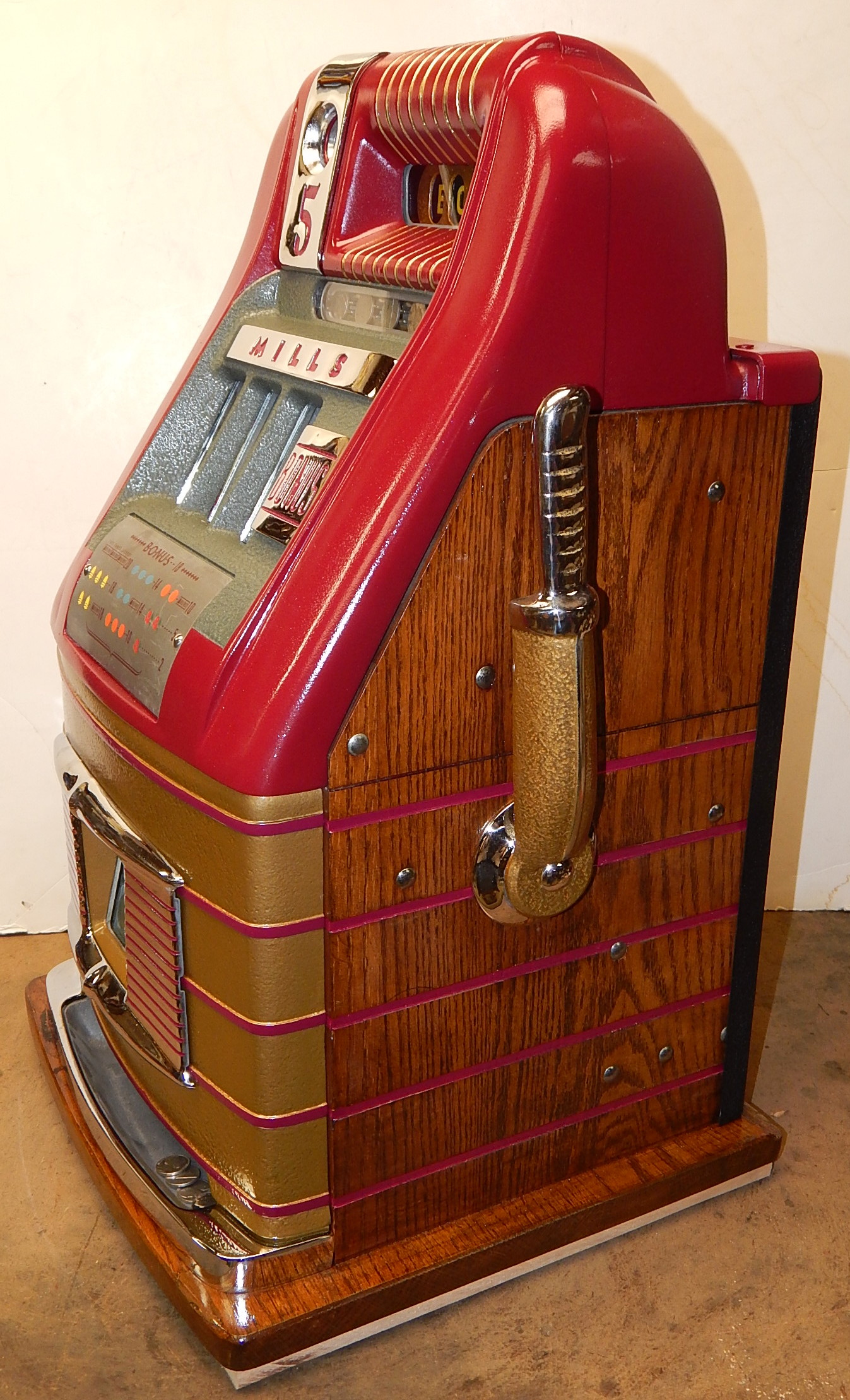 Mills 1948 Bonus Hi-Top 5 cent restored back to the original colors of burgundy, hammer gold trimed in wrinkle green. This machine has the Hard to find Bonus feature. Mint condition orignal award card, original reel strips, original cash box, original back door with Mills locks with one keys. All the trim on this machine is triple plated chrome. The cabinet on this machine was in such fine condition, we did not have the heart to hide this beautiful all oak wood cabinet with paint so, its finished and stained instead of painted to bring out it's natural beauty. Other then the new paint, a very nice all original machine which still has the original paper work on the inside of the cabinet and mechanism. Plays easy and pays as it should, 2-5 pay out