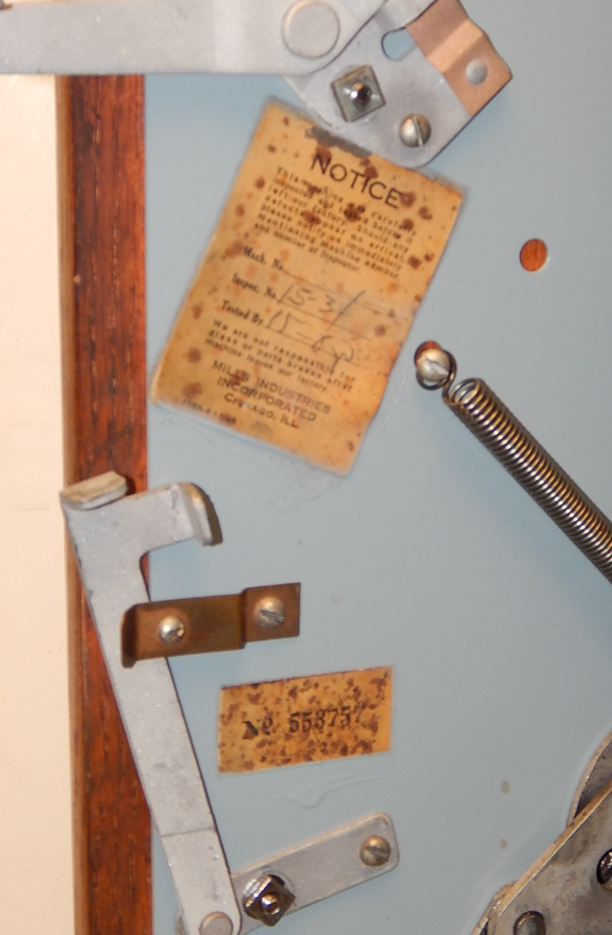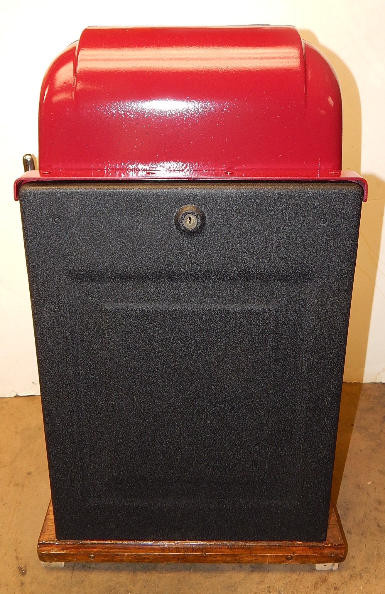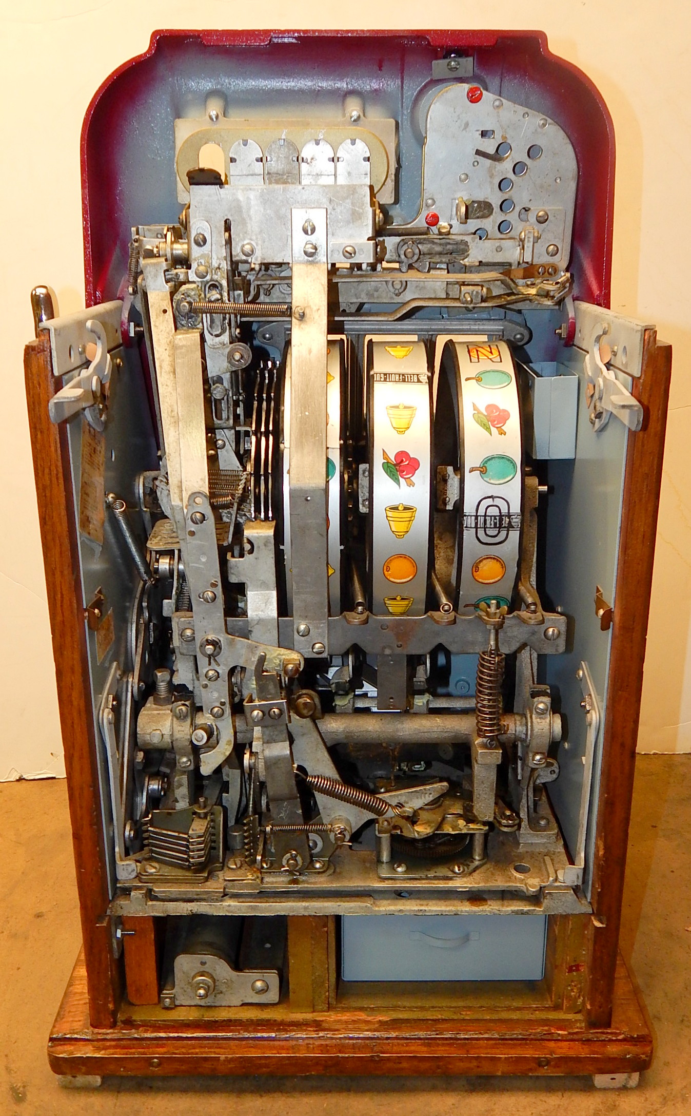 Mills 1948 Bonus Hi-Top 5 cent restored back to the original colors of burgundy, hammer gold trimed in wrinkle green. This machine has the Hard to find Bonus feature. Mint condition orignal award card, original reel strips, original cash box, original back door with Mills locks with one keys. All the trim on this machine is triple plated chrome. The cabinet on this machine was in such fine condition, we did not have the heart to hide this beautiful all oak wood cabinet with paint so, its finished and stained instead of painted to bring out it's natural beauty. Other then the new paint, a very nice all original machine which still has the original paper work on the inside of the cabinet and mechanism. Plays easy and pays as it should, 2-5 pay out