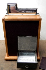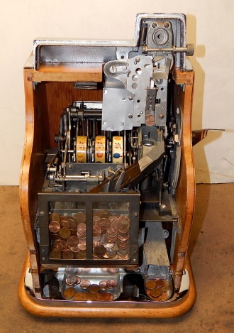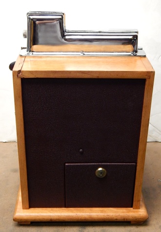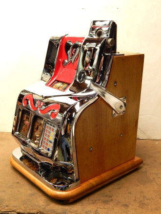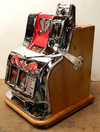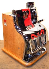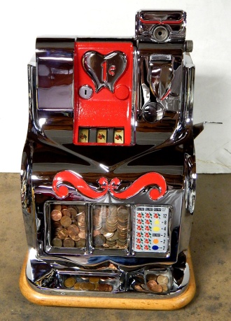1941 Mills QT "Sweet Heart" in a rare 1 cent denomination. This is a very nice restored cast iron machine. The chrome is triple plated 10 out of a 10. Trimmed in red. Twin Jackpots, original front and back door locks , original cash box, original award card, original reel strips. Very nice hard wood cabinet. Measurements 12.5" X 13.5" X 18", 51 pounds. Plays very easy.