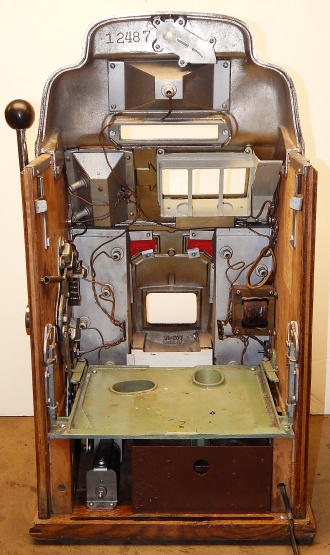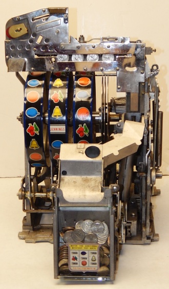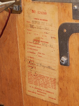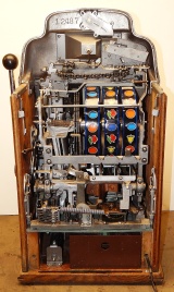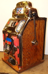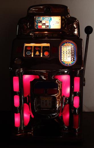 1949 Jennings Super Deluxe Club Chief "lite-up" 25 cent, previously restored. Chrome on this machine is very nice condition. Original back door, cashbox, with oak cabinet. 3 - 5 payout.