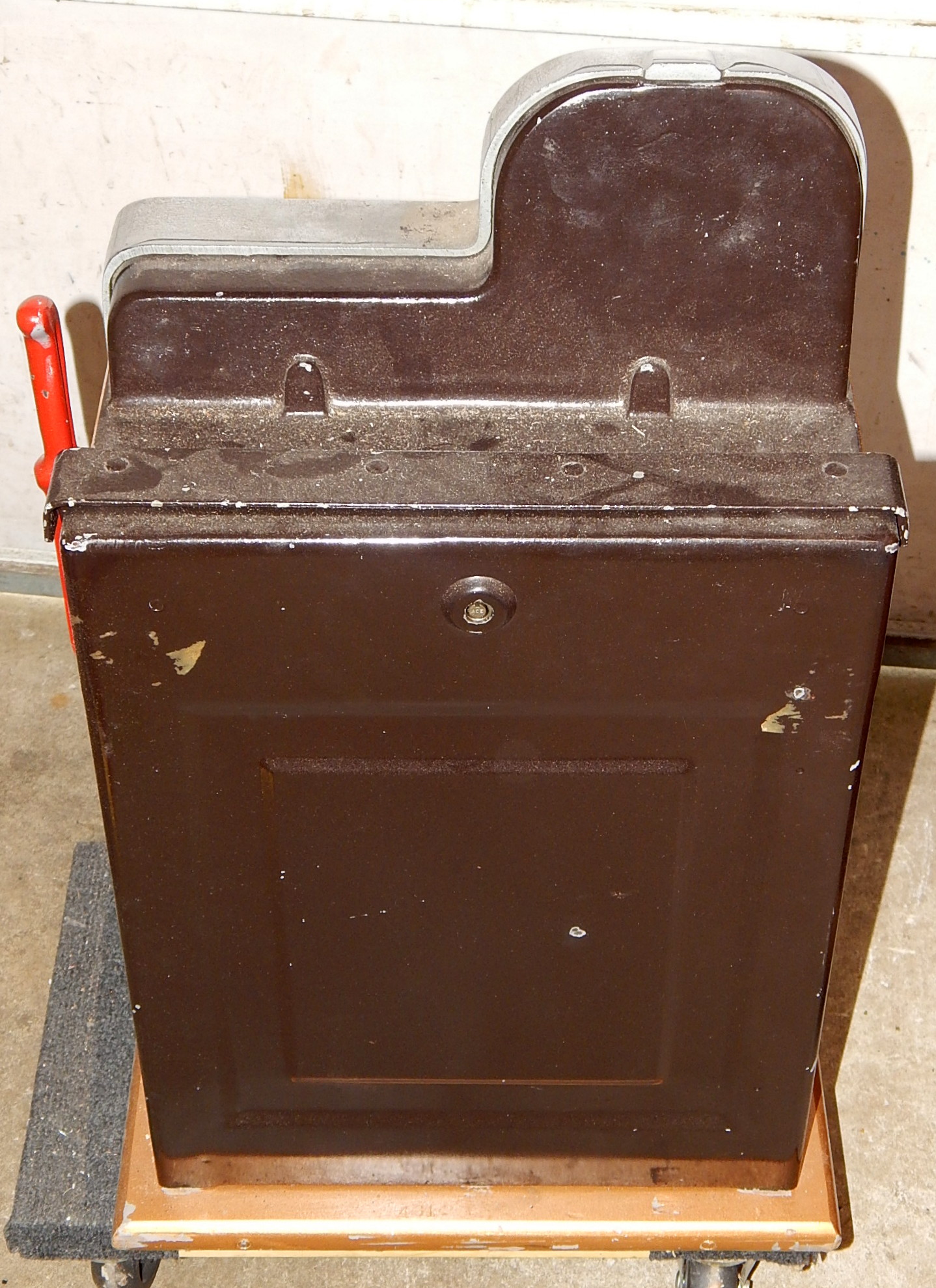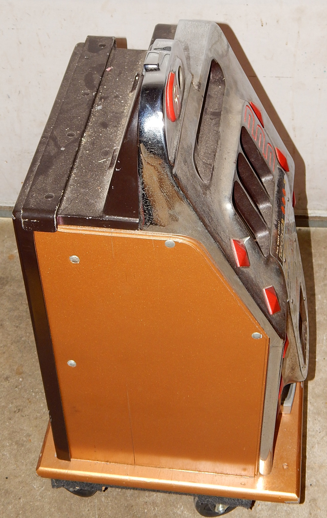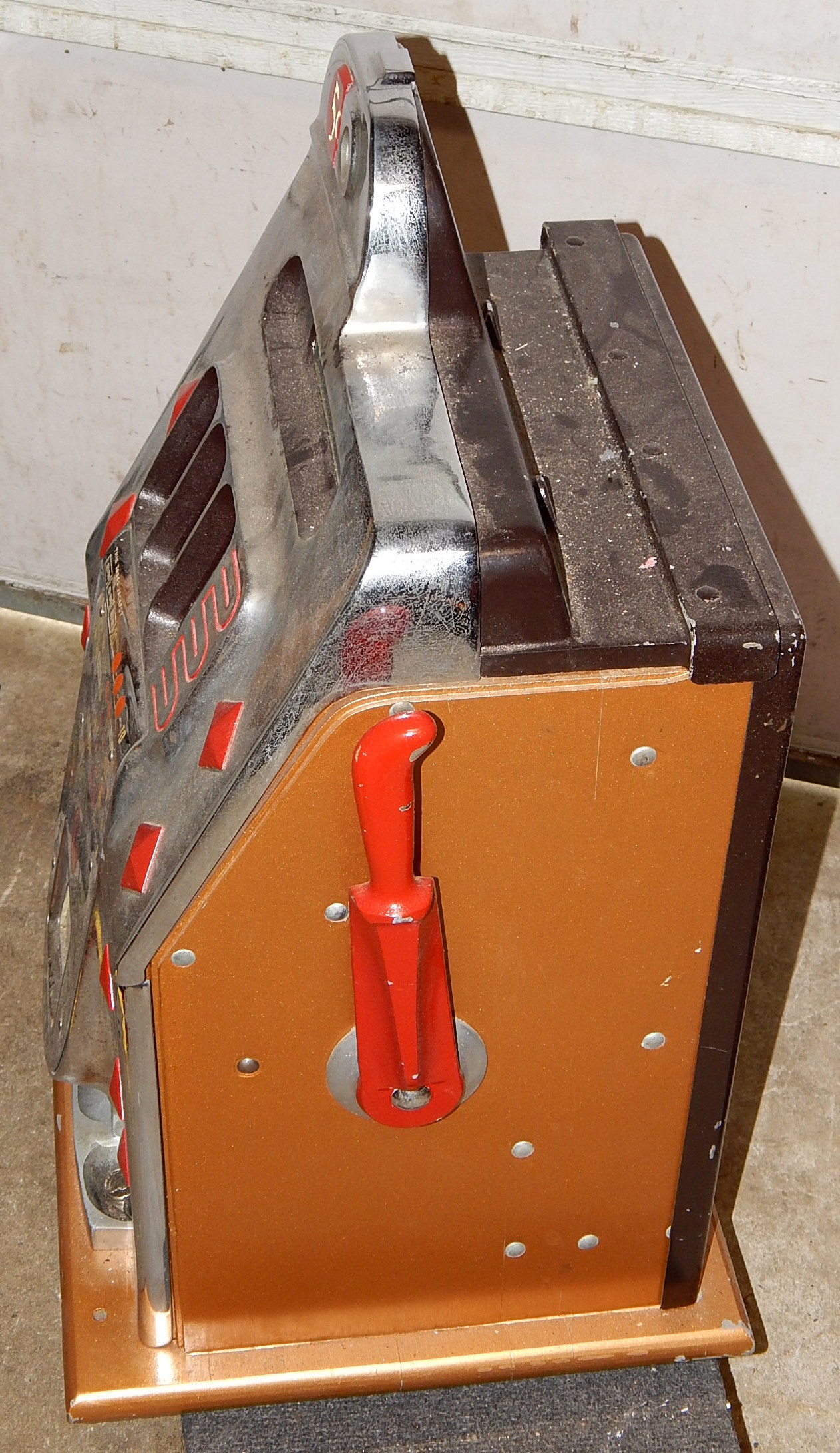 Mills 1940 Diamond Front 5 cent "Chrome". original chrome finish. Cabinet painted back to the original copper tone hammer. Jack pot with reserve, back door. lock with one key, cash box. Plays very easy.
