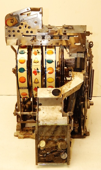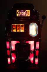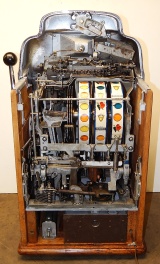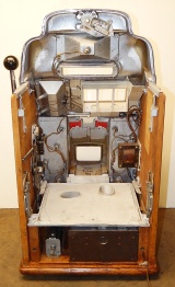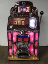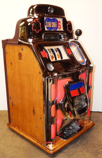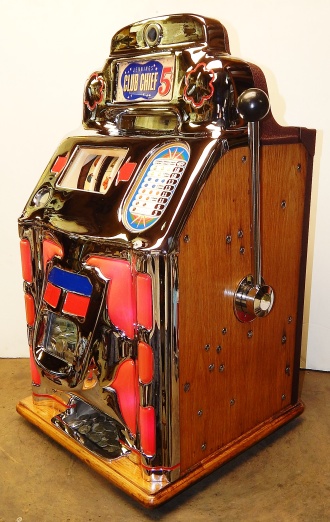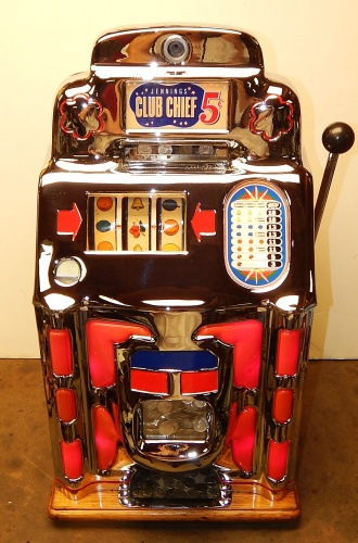 1949 Jennings Super Deluxe Club Chief "lite-up" 5 cent, restored. Chrome on this machine is 9.9 out of a 10. Original back door. Ace lock with one key. Original cashbox, with oak cabinet. Plays and pays as it should. 3 - 5 payout.
