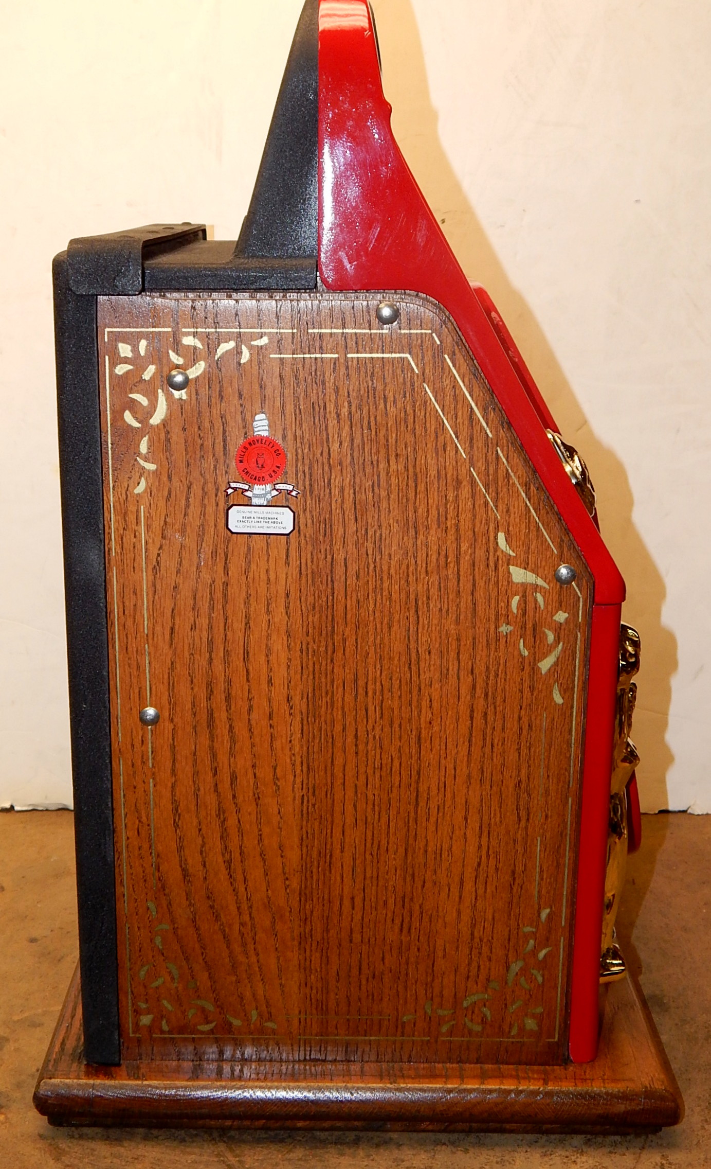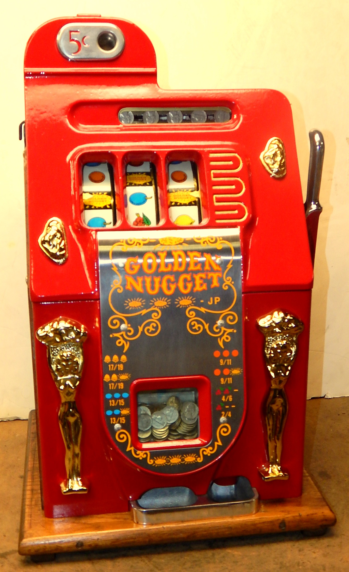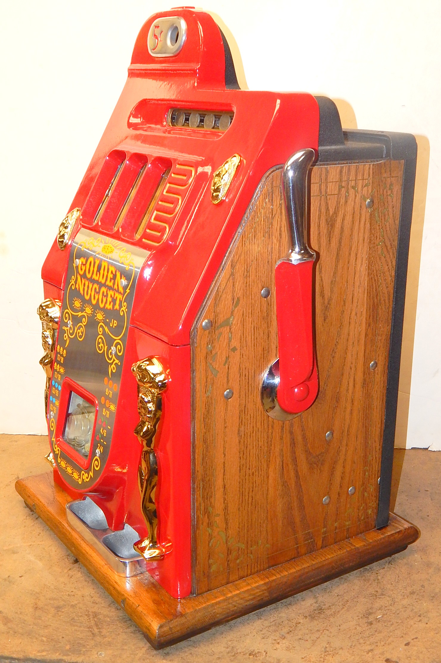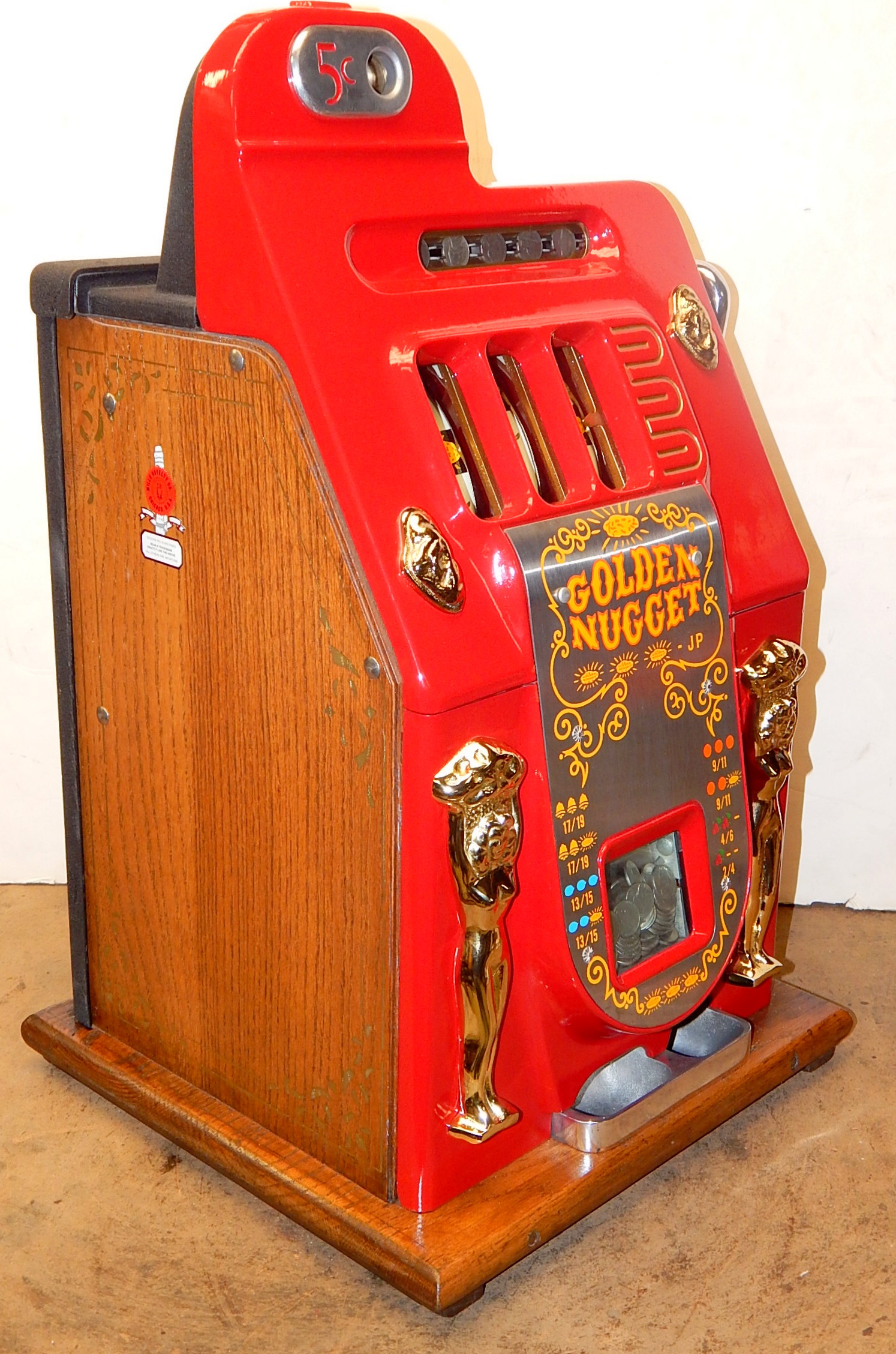 Mills 1946 Black Cherry Golden Nugget 5 cent, Gloss Red and Black Wrinkle, trim in gold. Jackpot with reserve, original Mills back door, new cash box. White Reel strips, stainless steel award card. Oak cabinet with gold leaf stenciled on the side. Plays very easy and pays as it should.