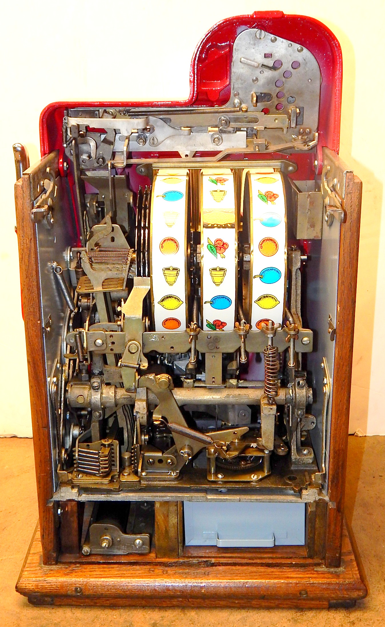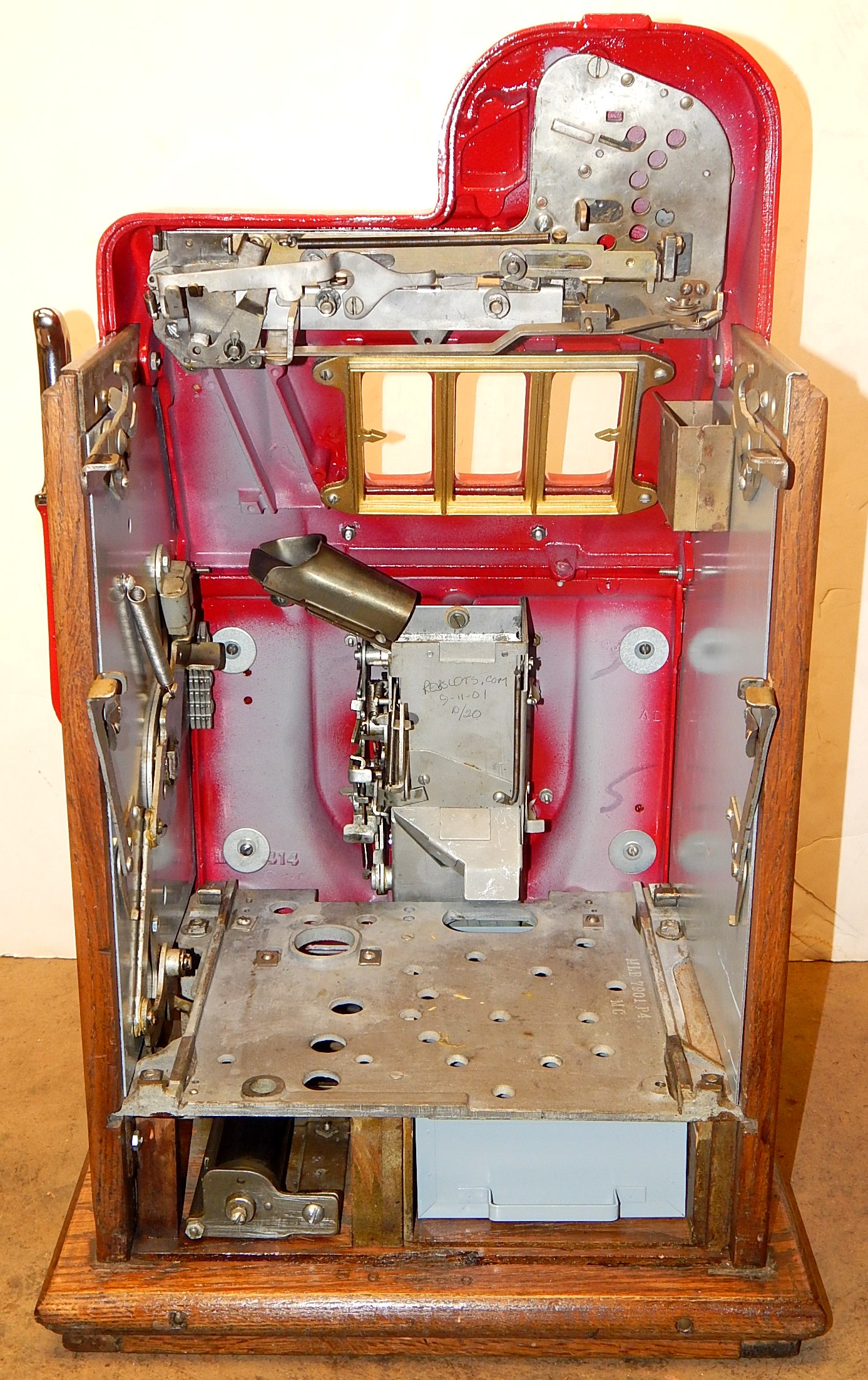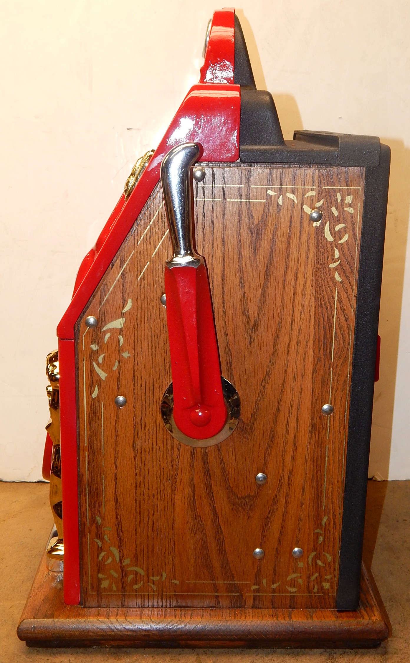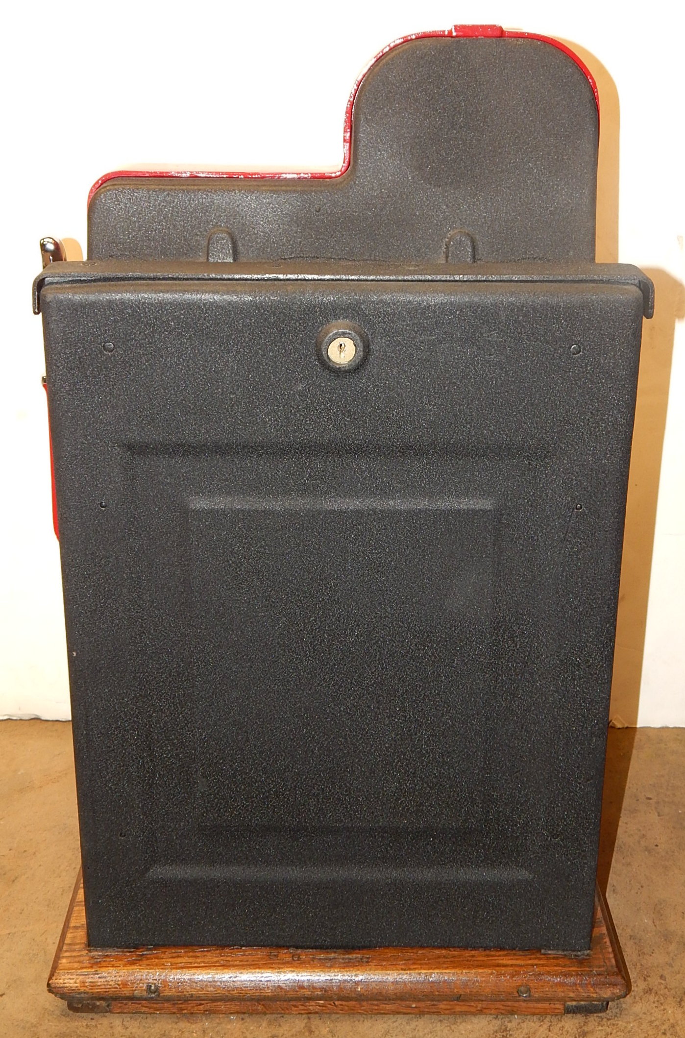 Mills 1946 Black Cherry Golden Nugget 5 cent, Gloss Red and Black Wrinkle, trim in gold. Jackpot with reserve, original Mills back door, new cash box. White Reel strips, stainless steel award card. Oak cabinet with gold leaf stenciled on the side. Plays very easy and pays as it should.