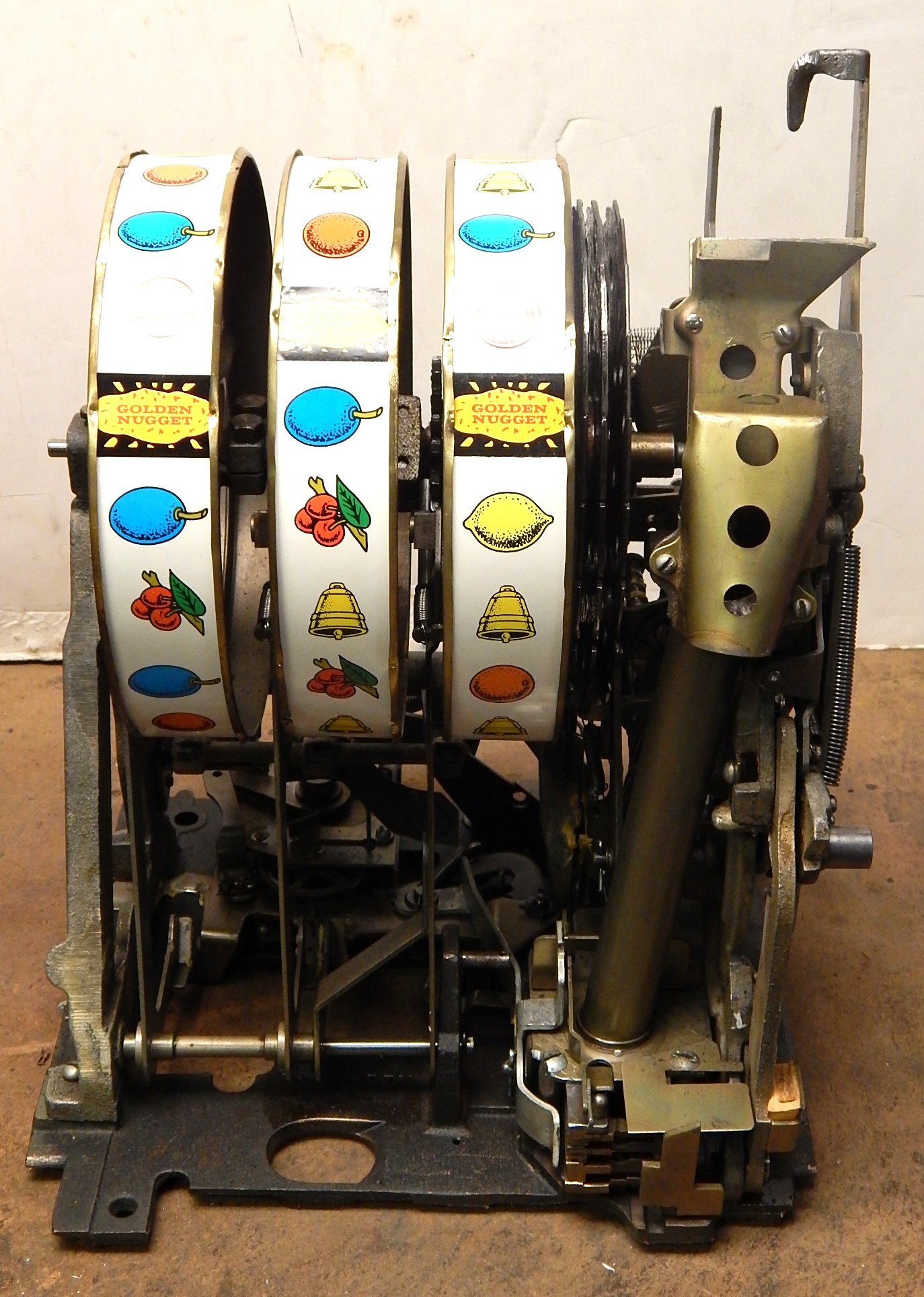 This machine was never operated in the Golden Nugget casino in Las Vegas. There were only a hundred or so Golden Nugget machines made for the casino back in the 50s. I don't want any one to think this is a original machine from the casino. The golden nugget kit was added to an original 1946 Black Cherry which only consist of two dolls, two nuggets, reel strips, and a award card. The machine it self is all original made by Mills.