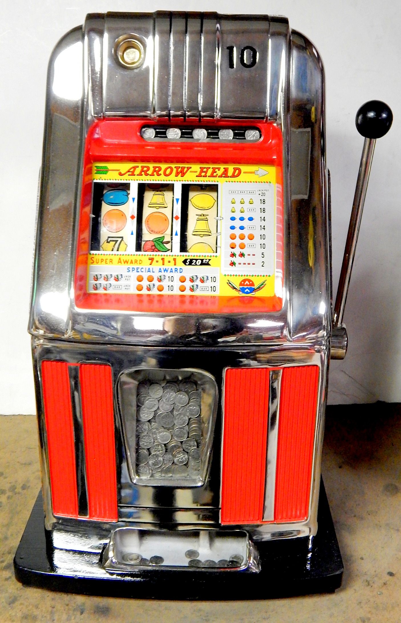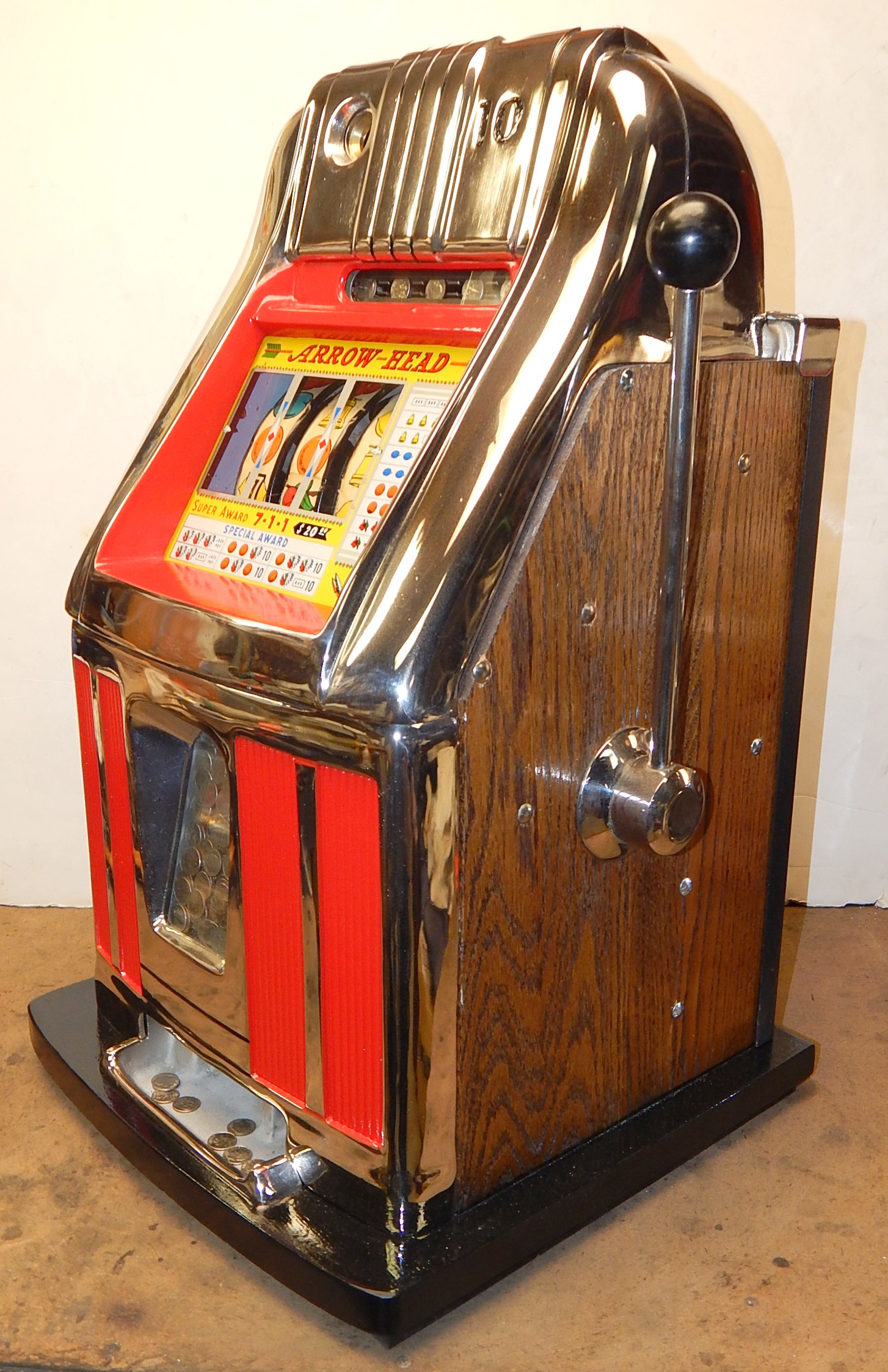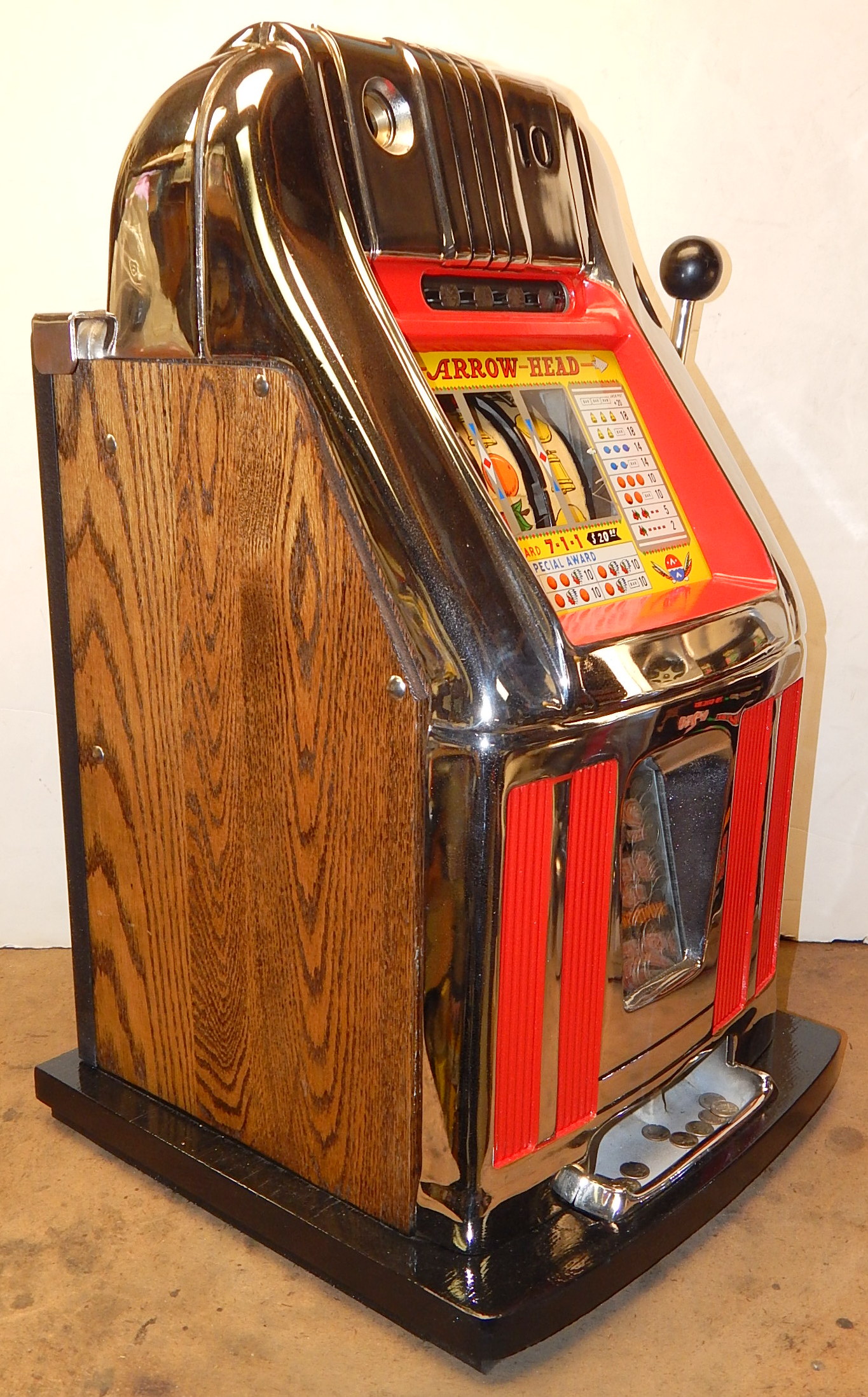 1960 10c Arrow Head High Top, previously restored condition, chrome plated. Oak cabinet, new cash box, original back door, club handle, false jackpot, original reel strips. plays very easy.