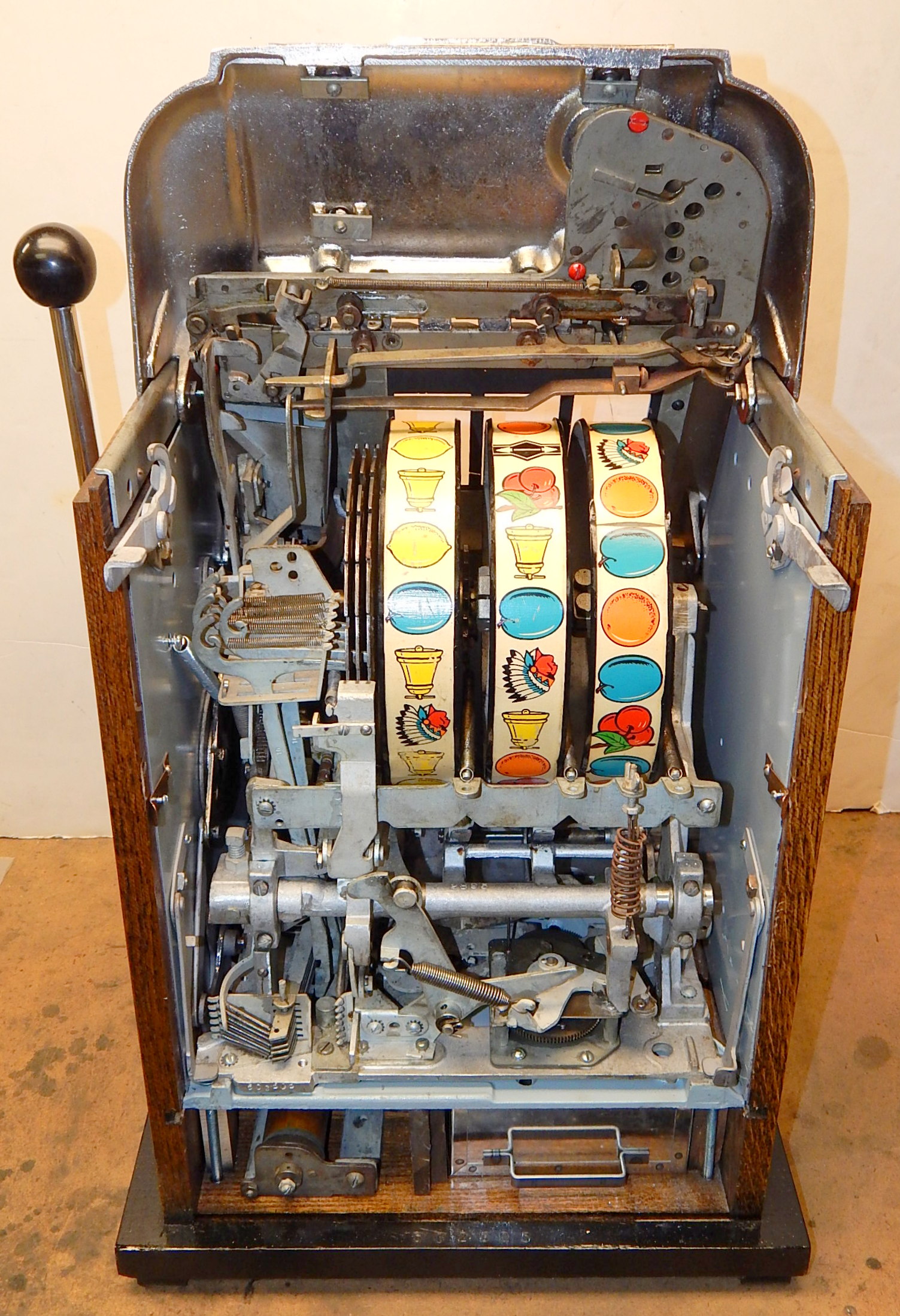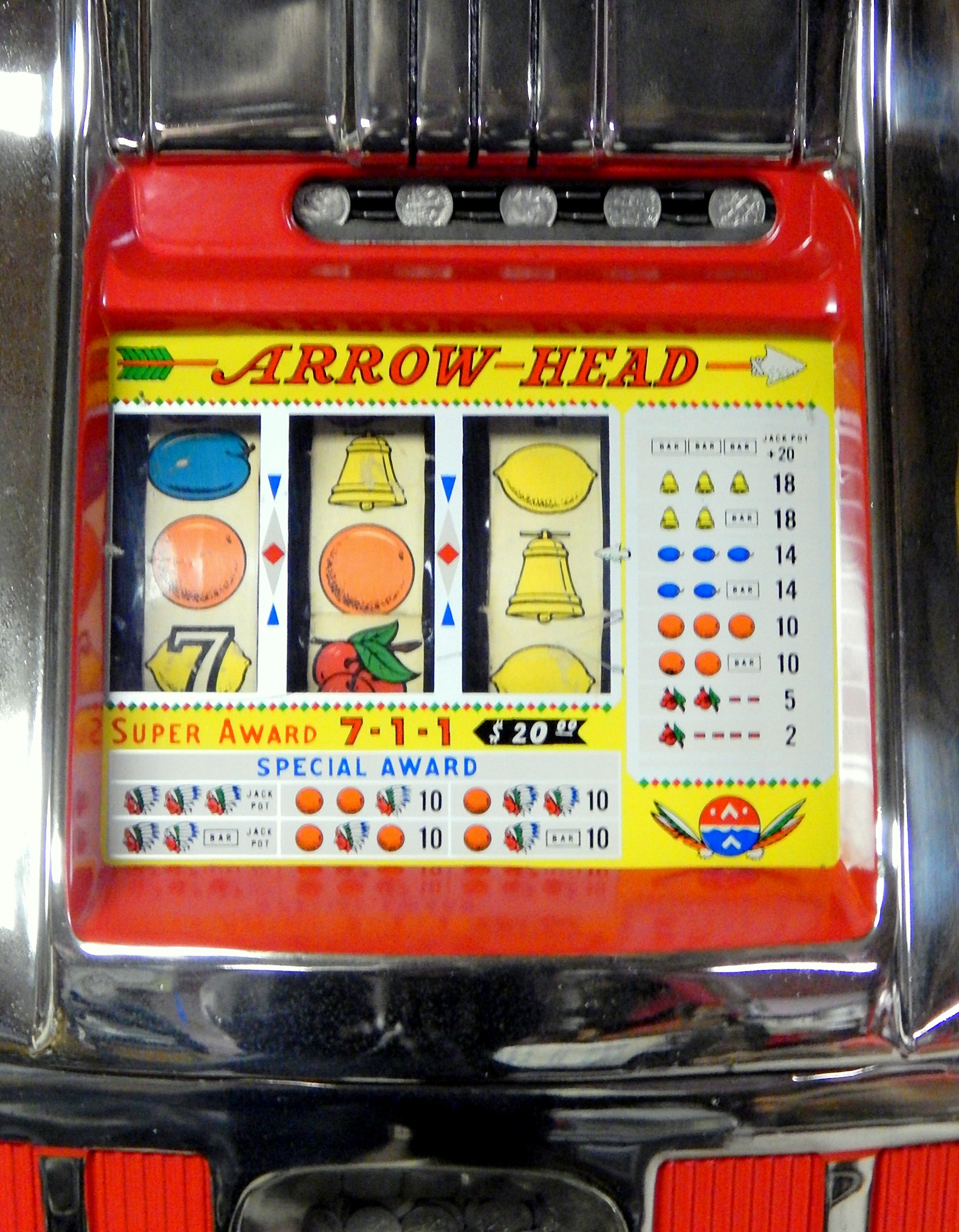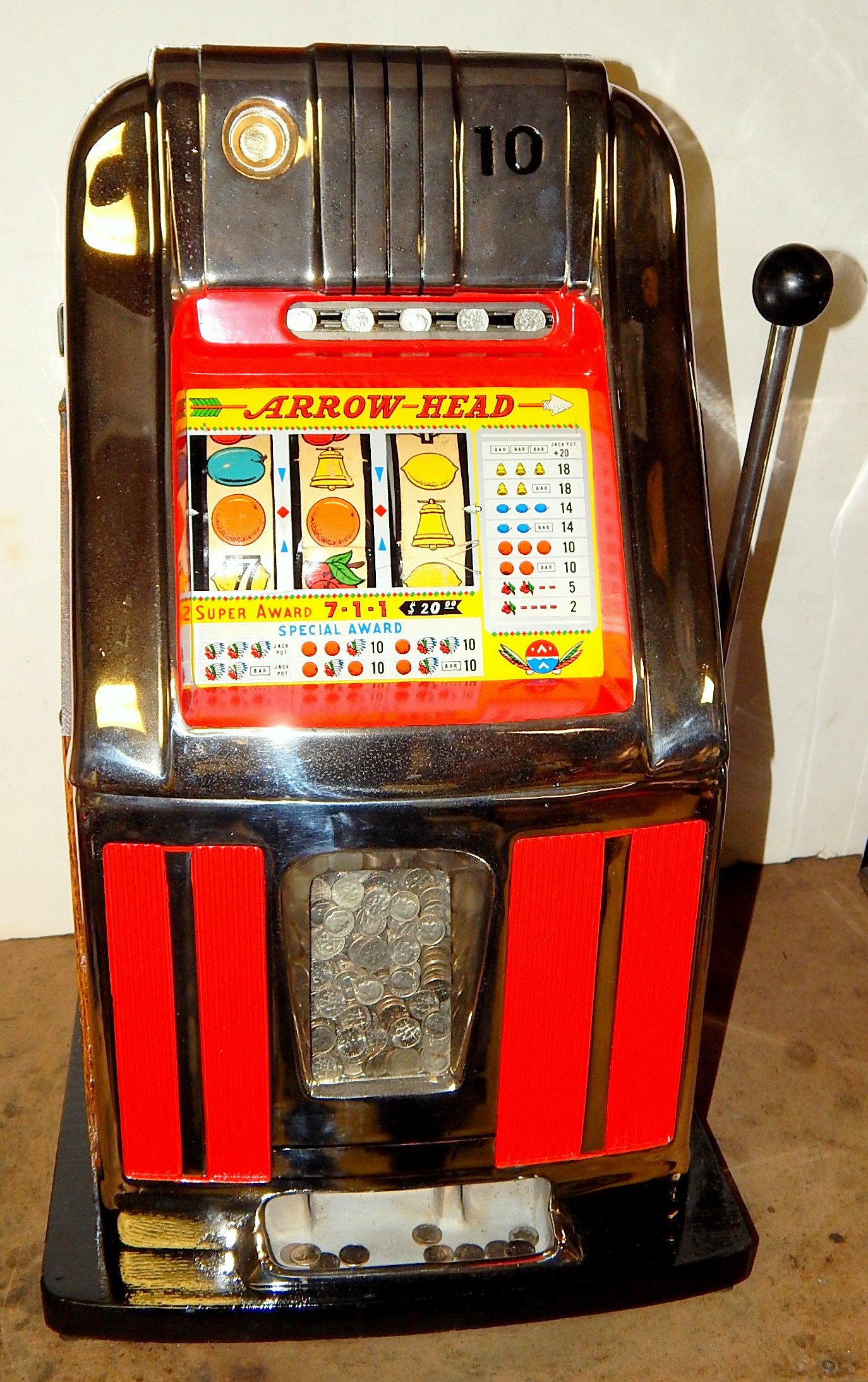 1960 10c Arrow Head High Top, previously restored condition, chrome plated. Oak cabinet, new cash box, original back door, club handle, false jackpot, original reel strips. plays very easy.
