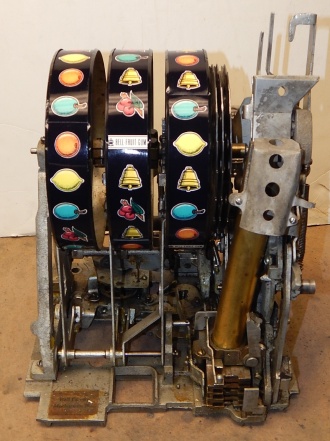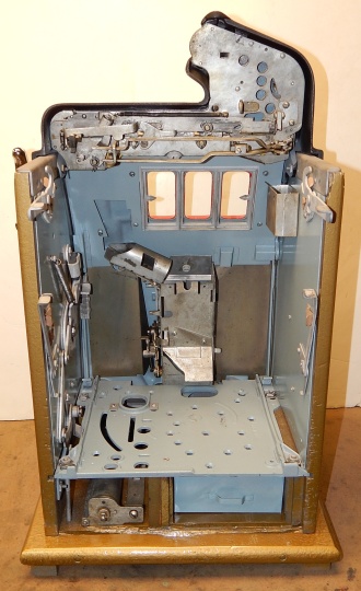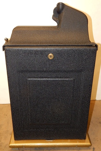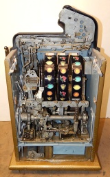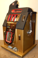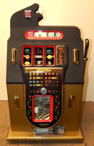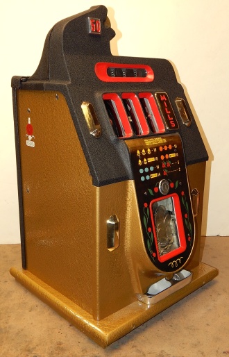 Mills 1947 Black and Gold 50 cent, restored condition. Hammer tone gold wrinkle black with red trim. This is a very nice original machine. Mint condition original award card, Front Load Jackpot, original back door with Mills lock with one key, original cash box. Beautiful oak cabinet. Still has the original paper work on the inside of the cabinet. Plays very easy, 2-5 payout.