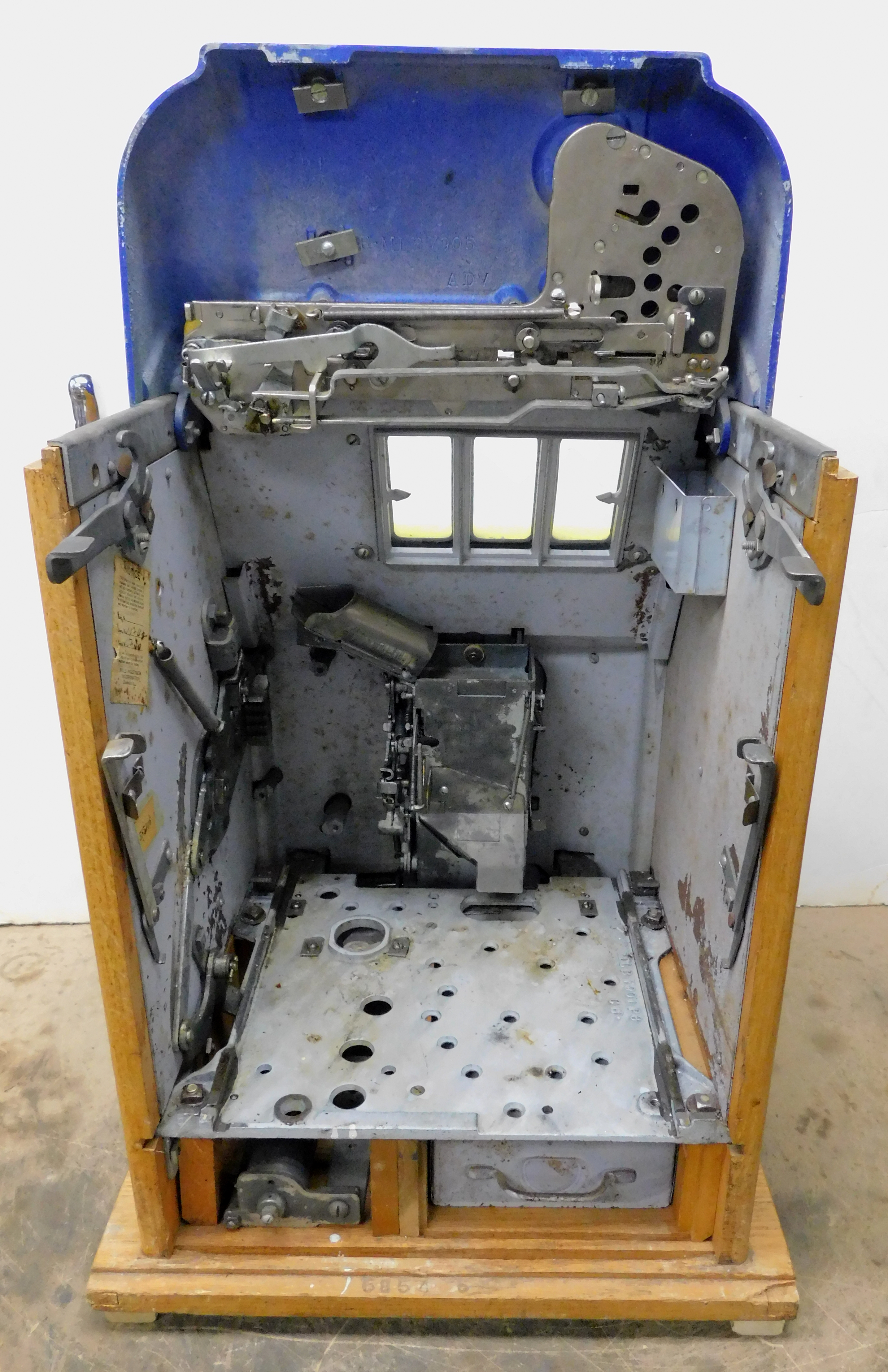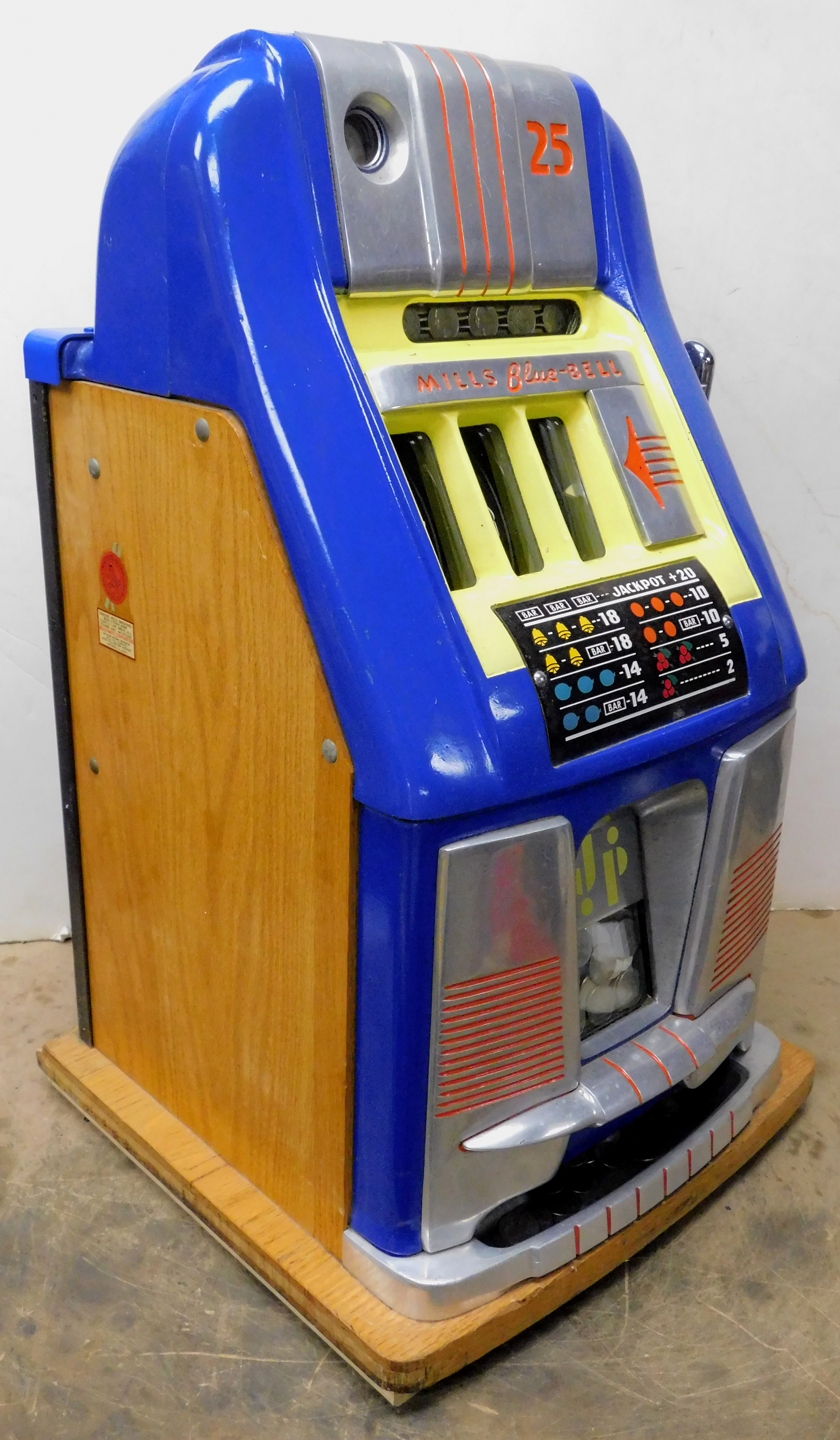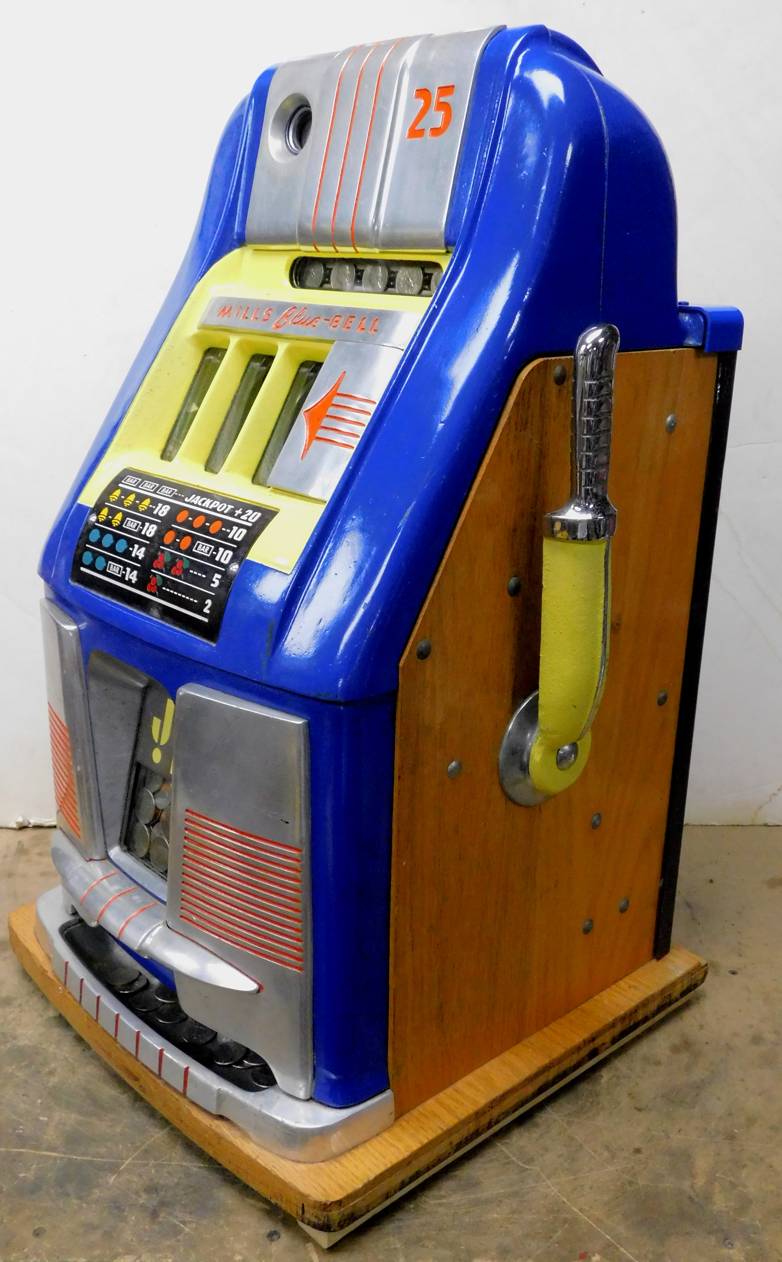 Mills 1948 Blue Bell Hi-Top 25 cent, in original condition the way it left the factory. Original award card, original reel strips, Jackpot with reserve, original back door with Mills lock with one key, original cash box. Still has the original paper inspection tag and serial number on the inside of the cabinet. Plays very easy, 2-5 pay out.