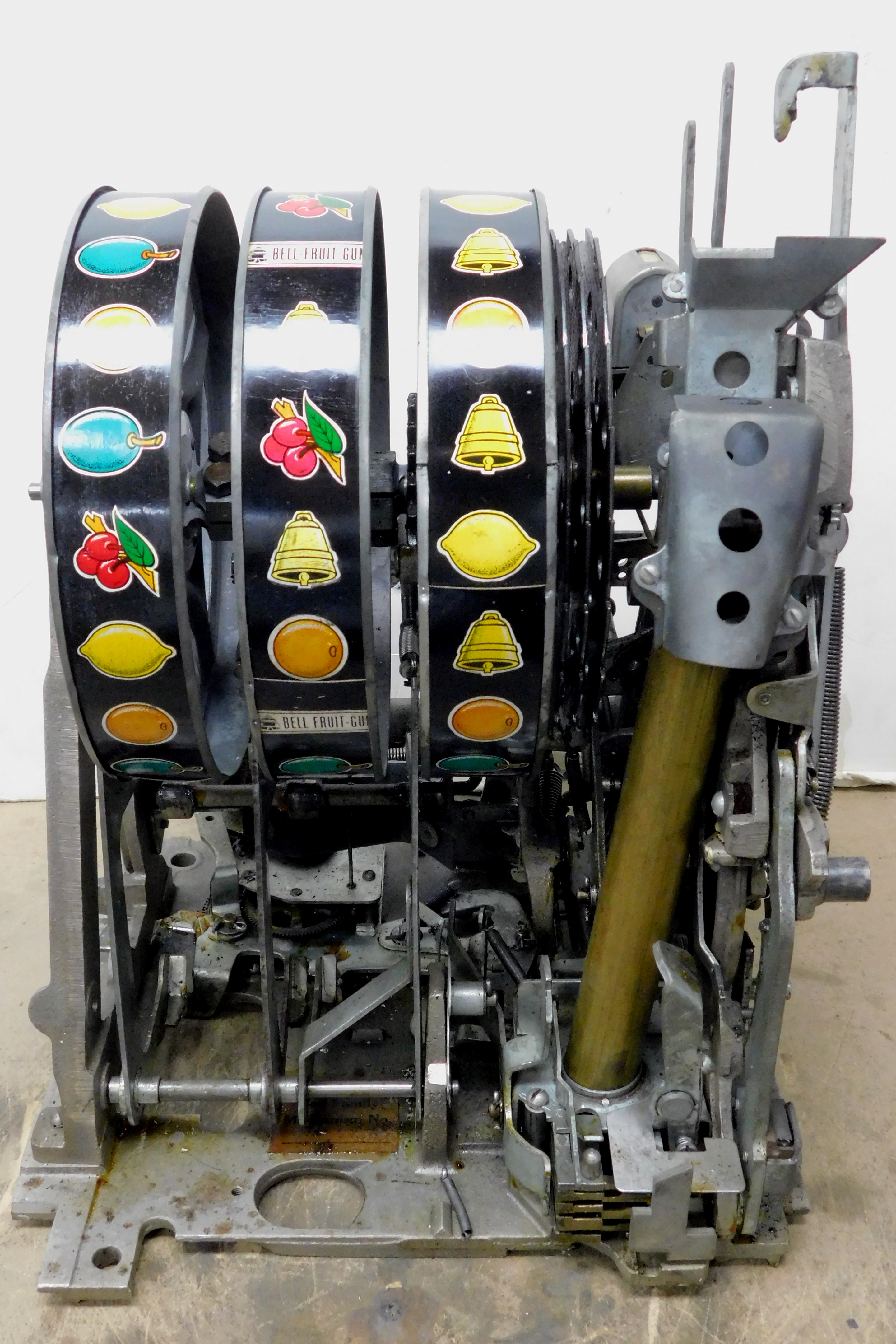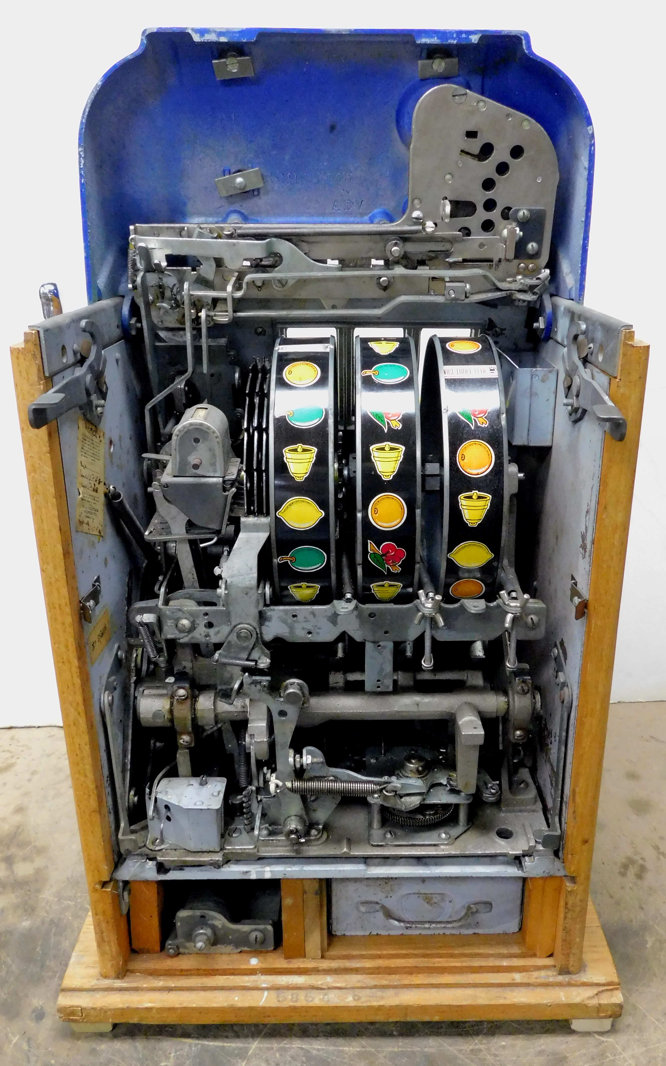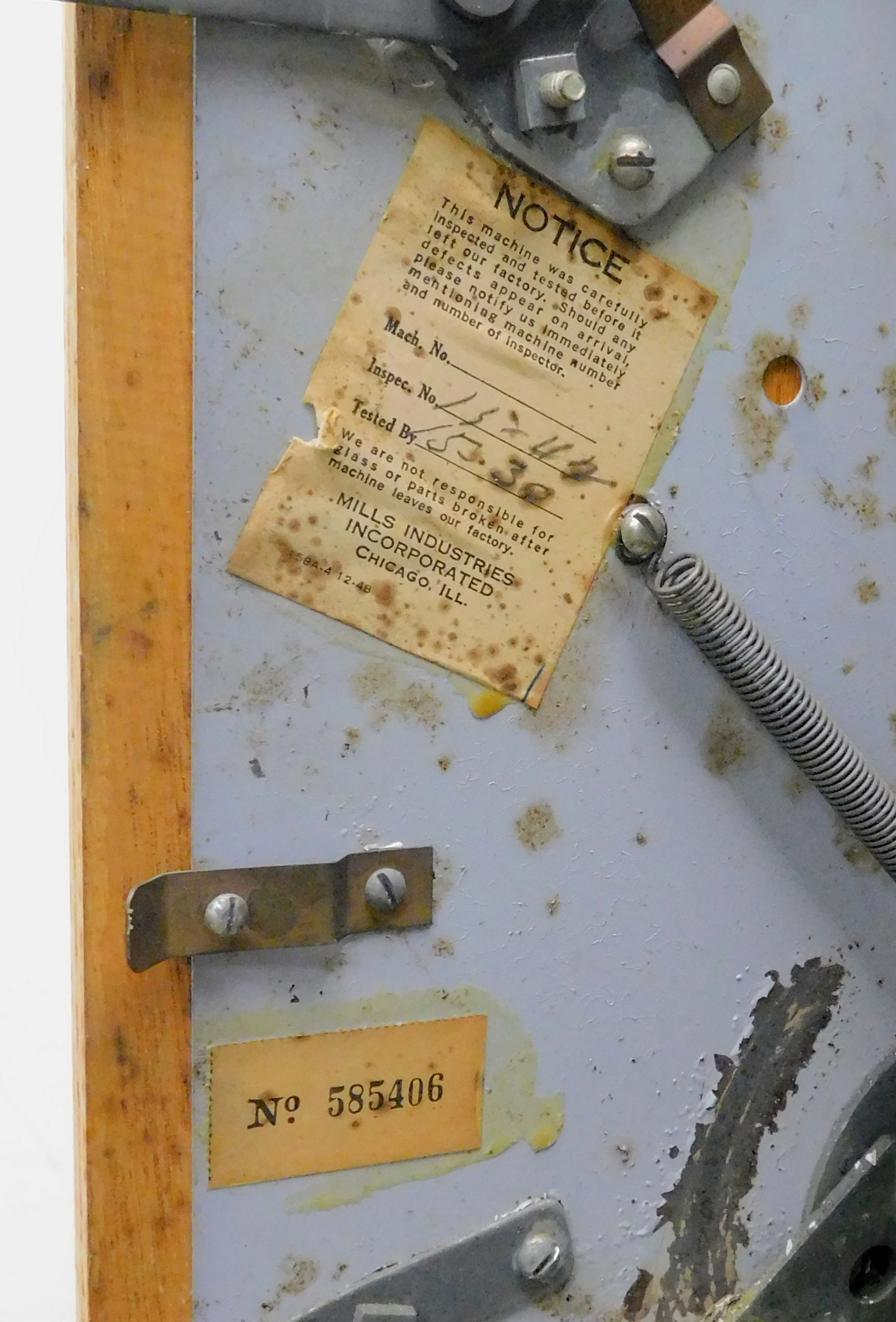 Mills 1948 Blue Bell Hi-Top 25 cent, in original condition the way it left the factory. Original award card, original reel strips, Jackpot with reserve, original back door with Mills lock with one key, original cash box. Still has the original paper inspection tag and serial number on the inside of the cabinet. Plays very easy, 2-5 pay out.