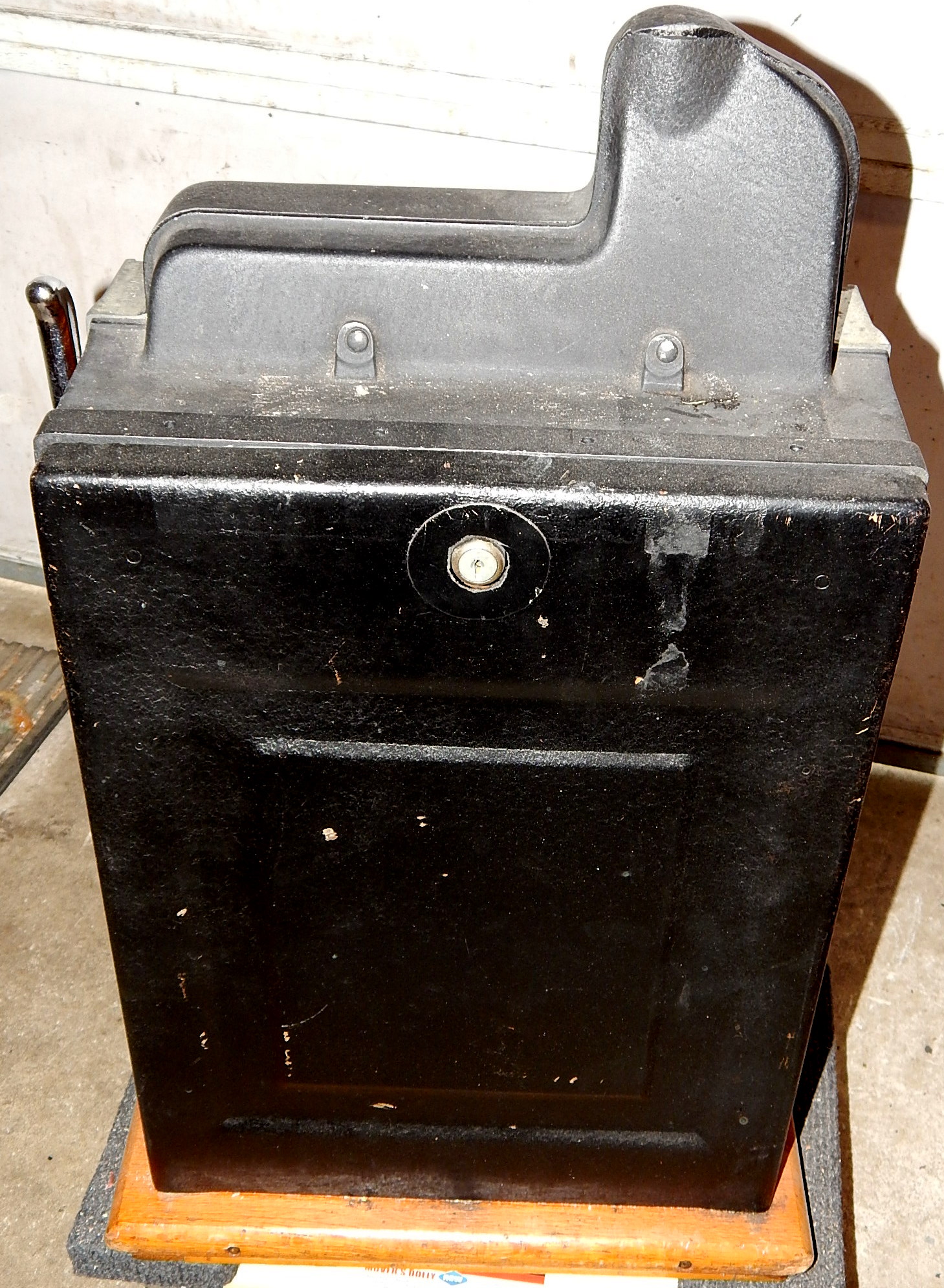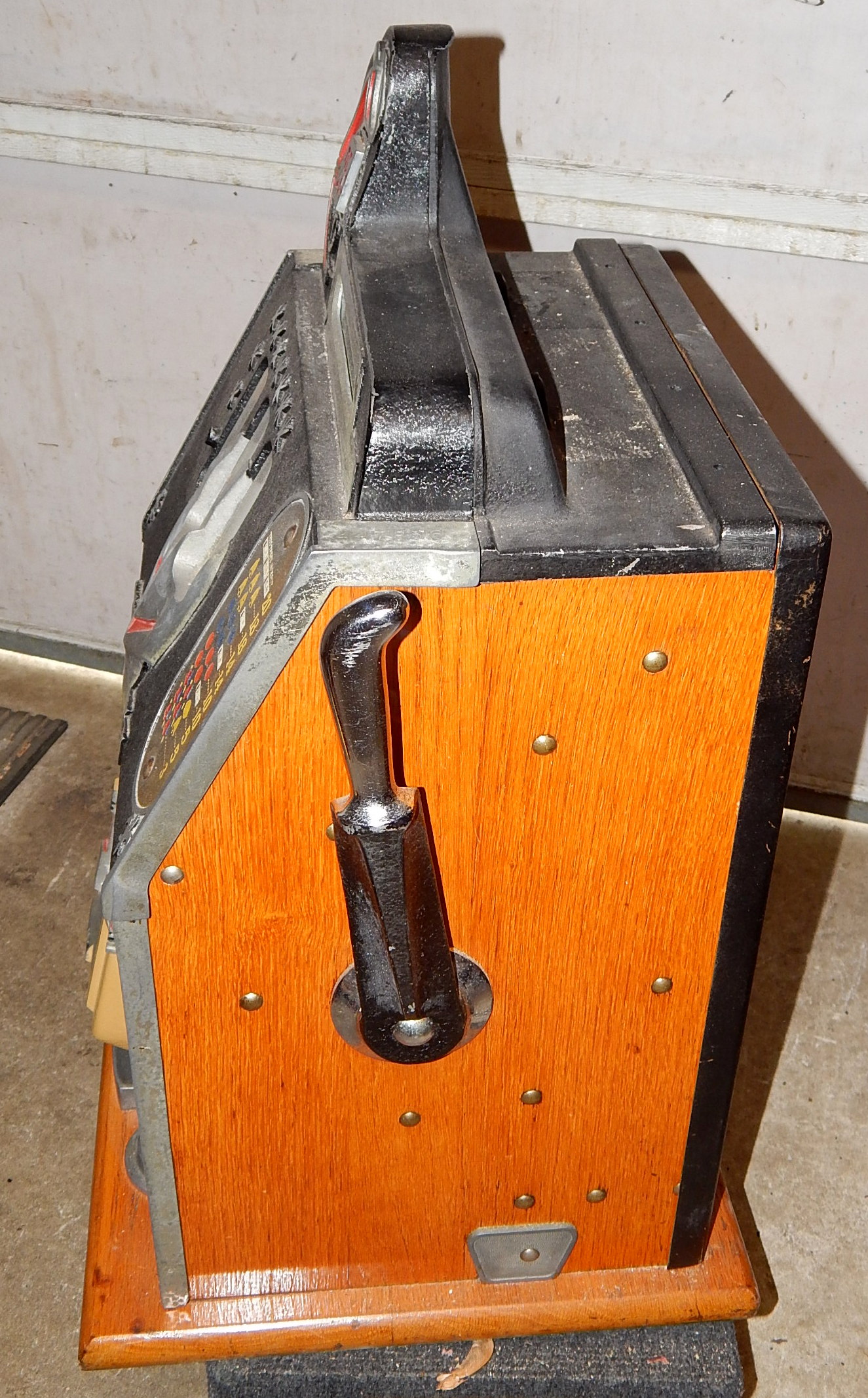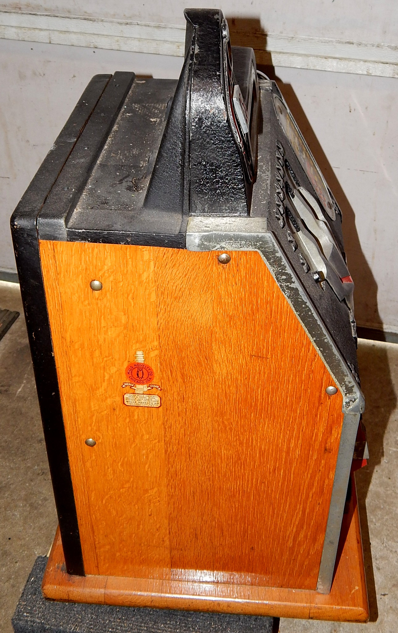 1938 Mills Castle Front 25 cent, original Wrinkle Black color, trimmed in white and dark red. Working front load Jackpot, original Reel Strips, original back door, original lock with one key, original cash box. Plays and pays as it should.