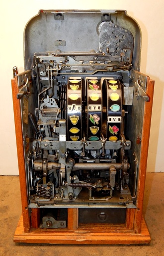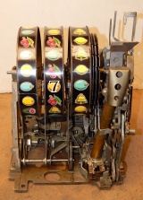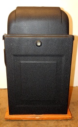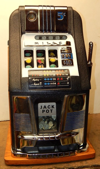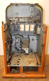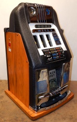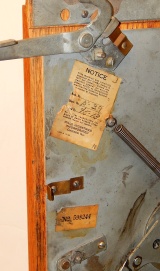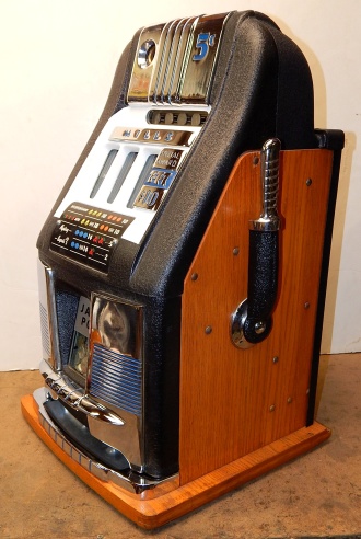 Mills 1950 " 7-7-7 " Hi-Top 5 cent, This is a very nice perviously restored machine. Painted wrinkle black trim in white, original cash box, original back door, jackpot, origiinal reel strips, very nice cabinet. The 7-7-7 token vendor has one token. Still has the original paper work on the inside of the cabinet. Plays very easy, 2-5 payout.