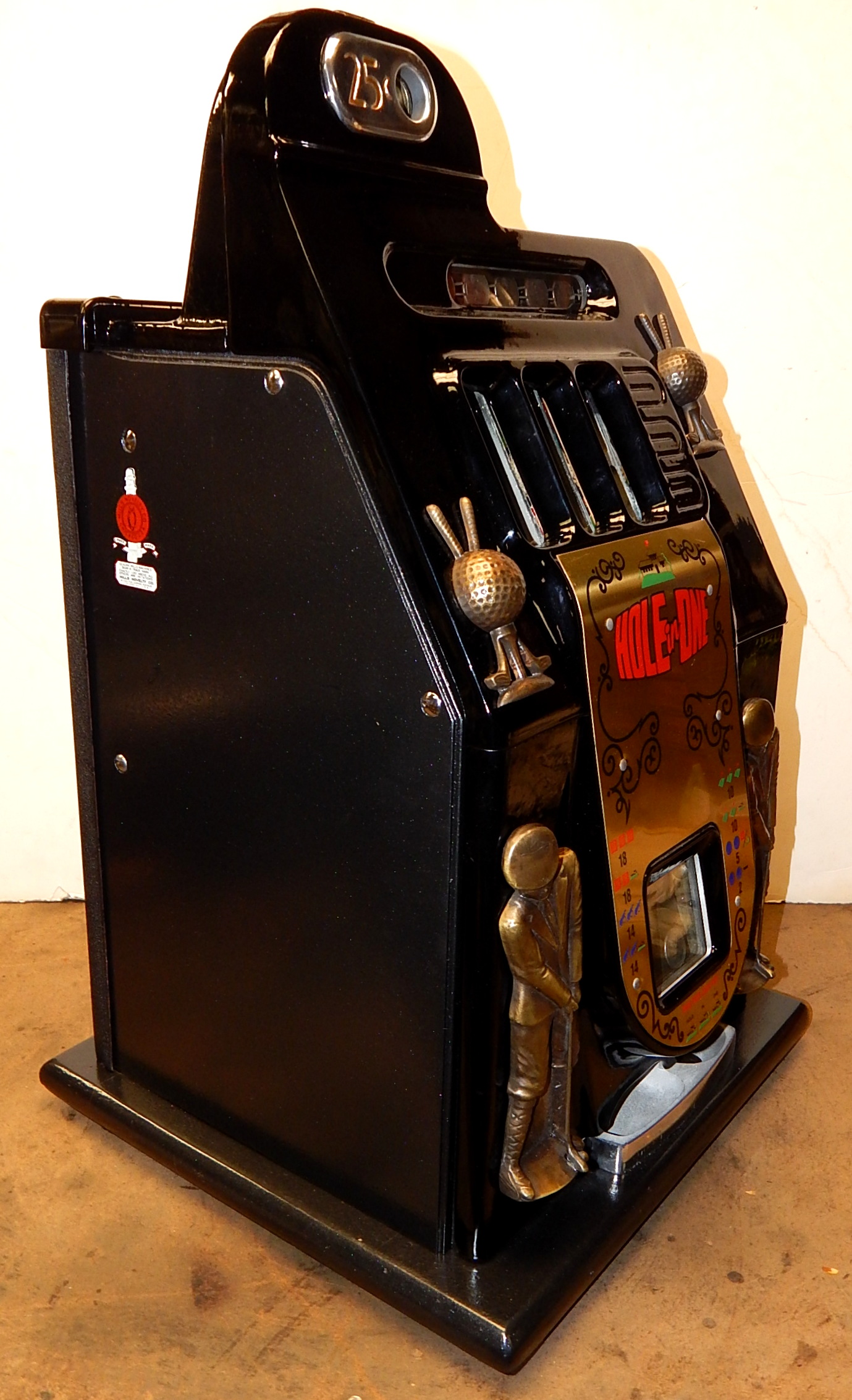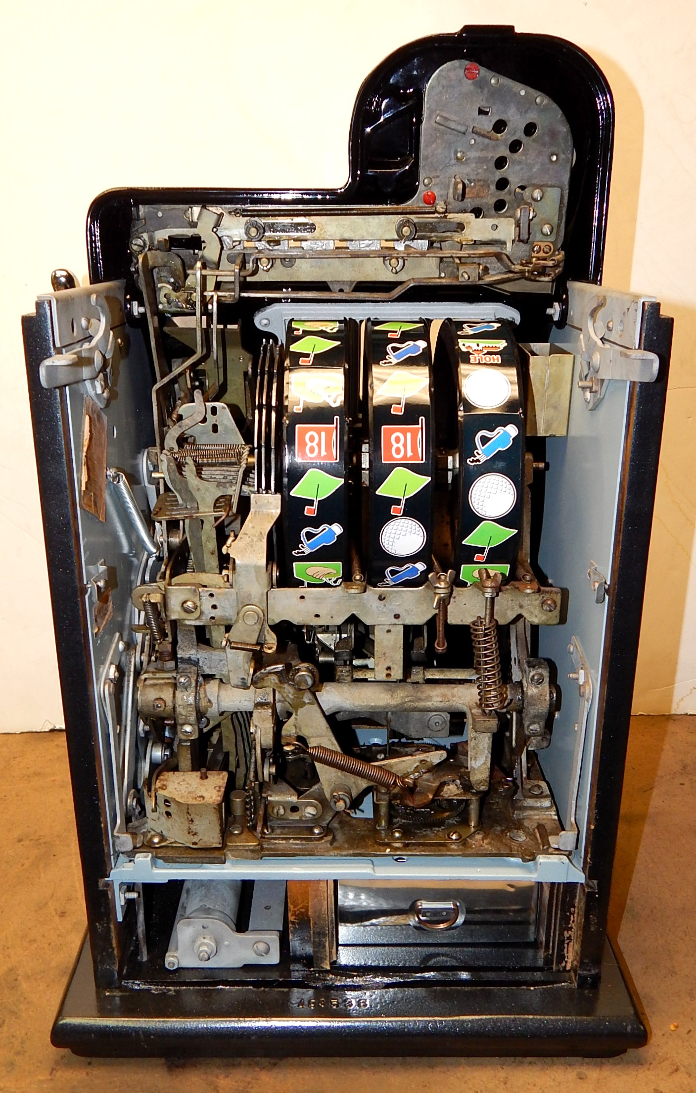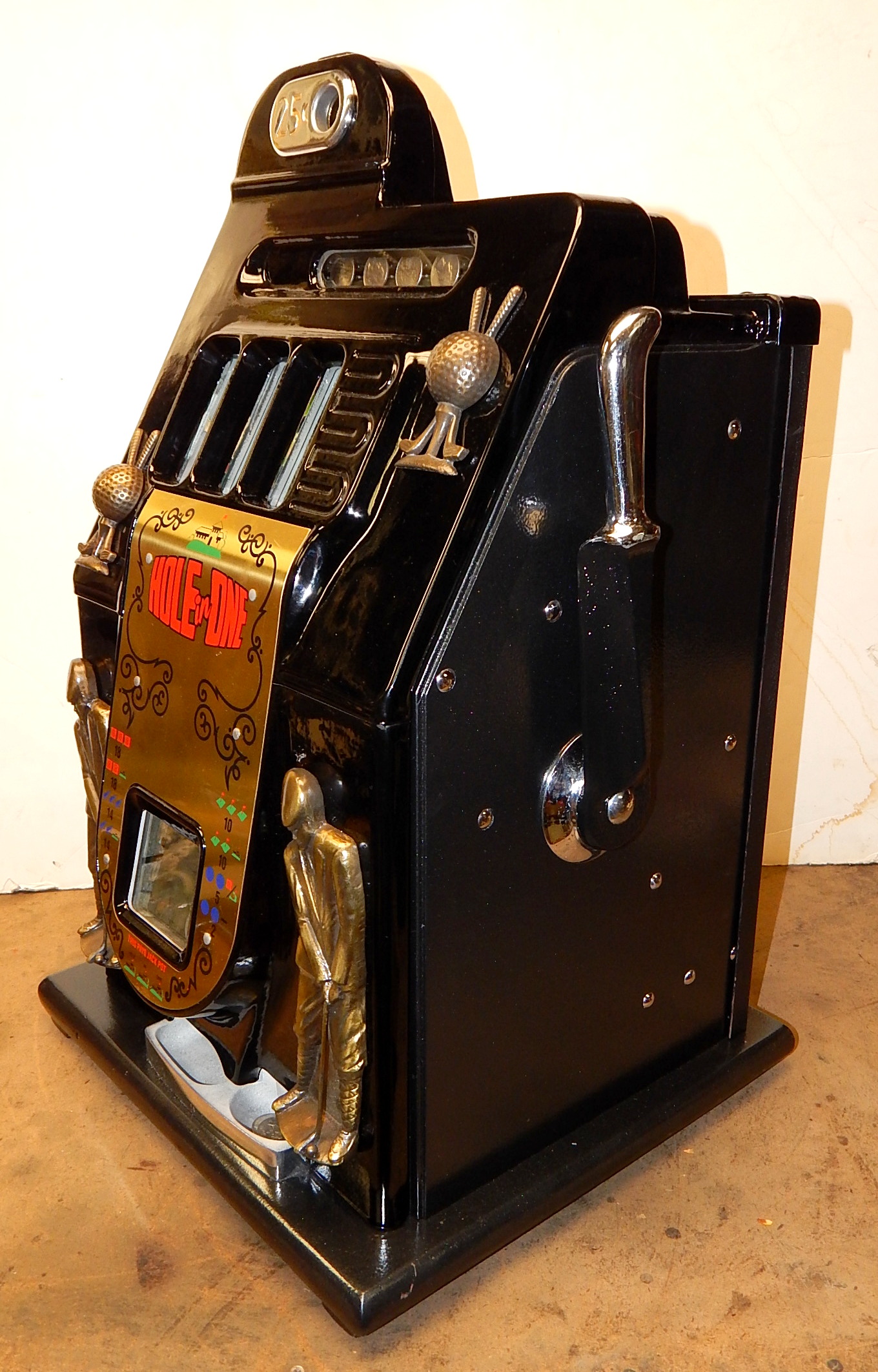 1946 Mills Black Cherry "Golfer" 25 cent, restored painted gloss Black, with oak cabinet. Still has the original paper work on the inside of the cabinet. This is a very nice machine that play very easy. New award card, new reel strips. all the trim on this machine is polish. Original back door, original cash box. Plays very easy. A great rec-room machine.