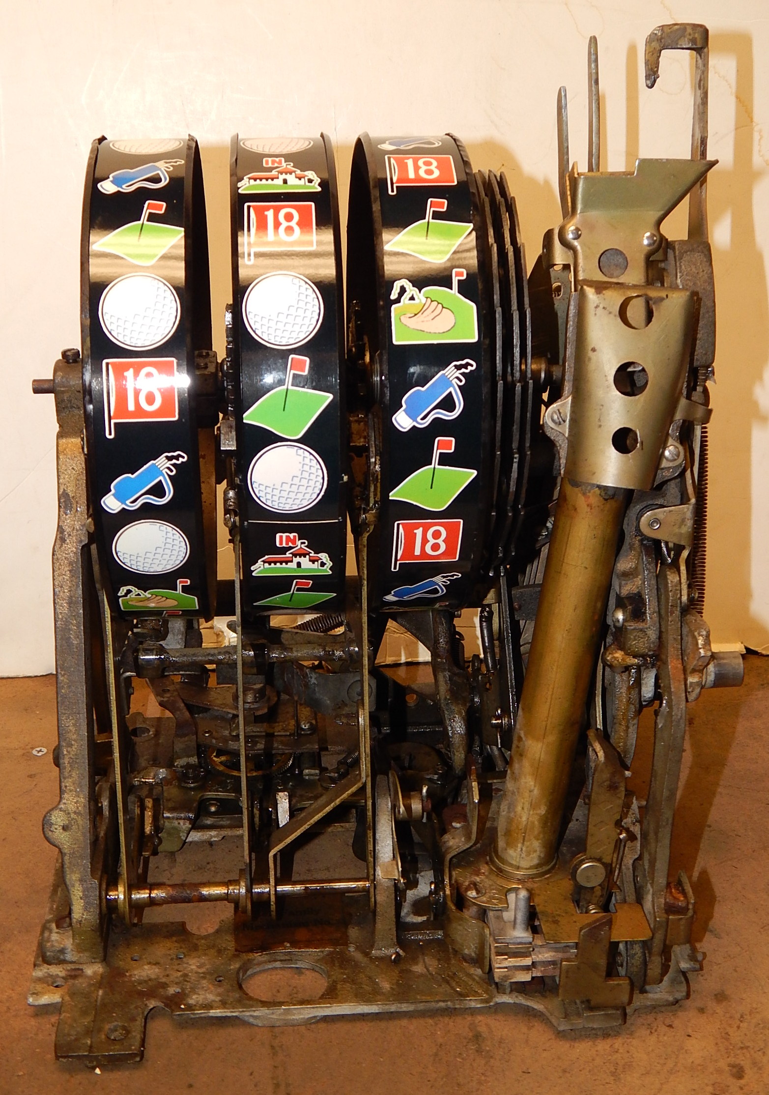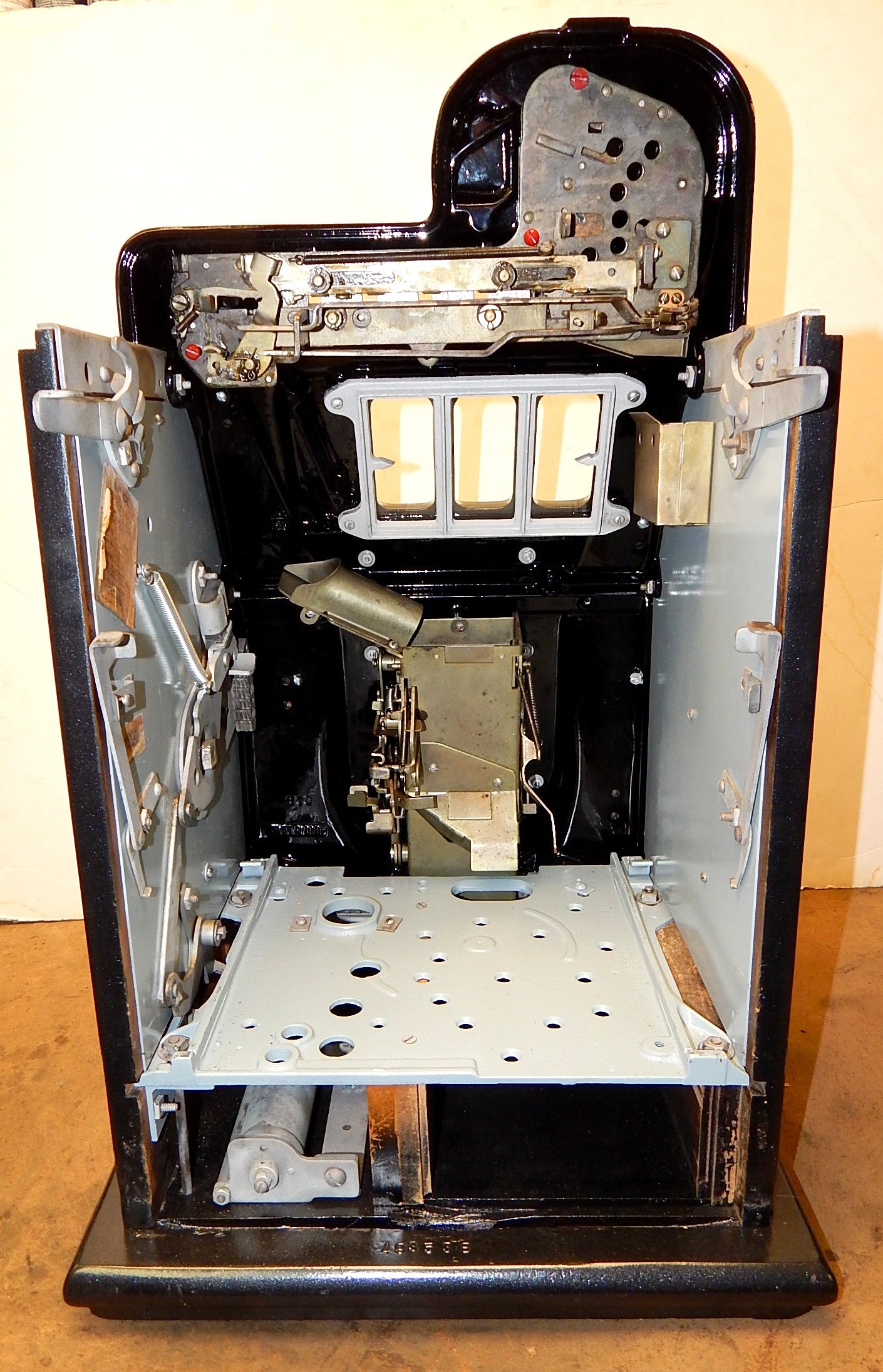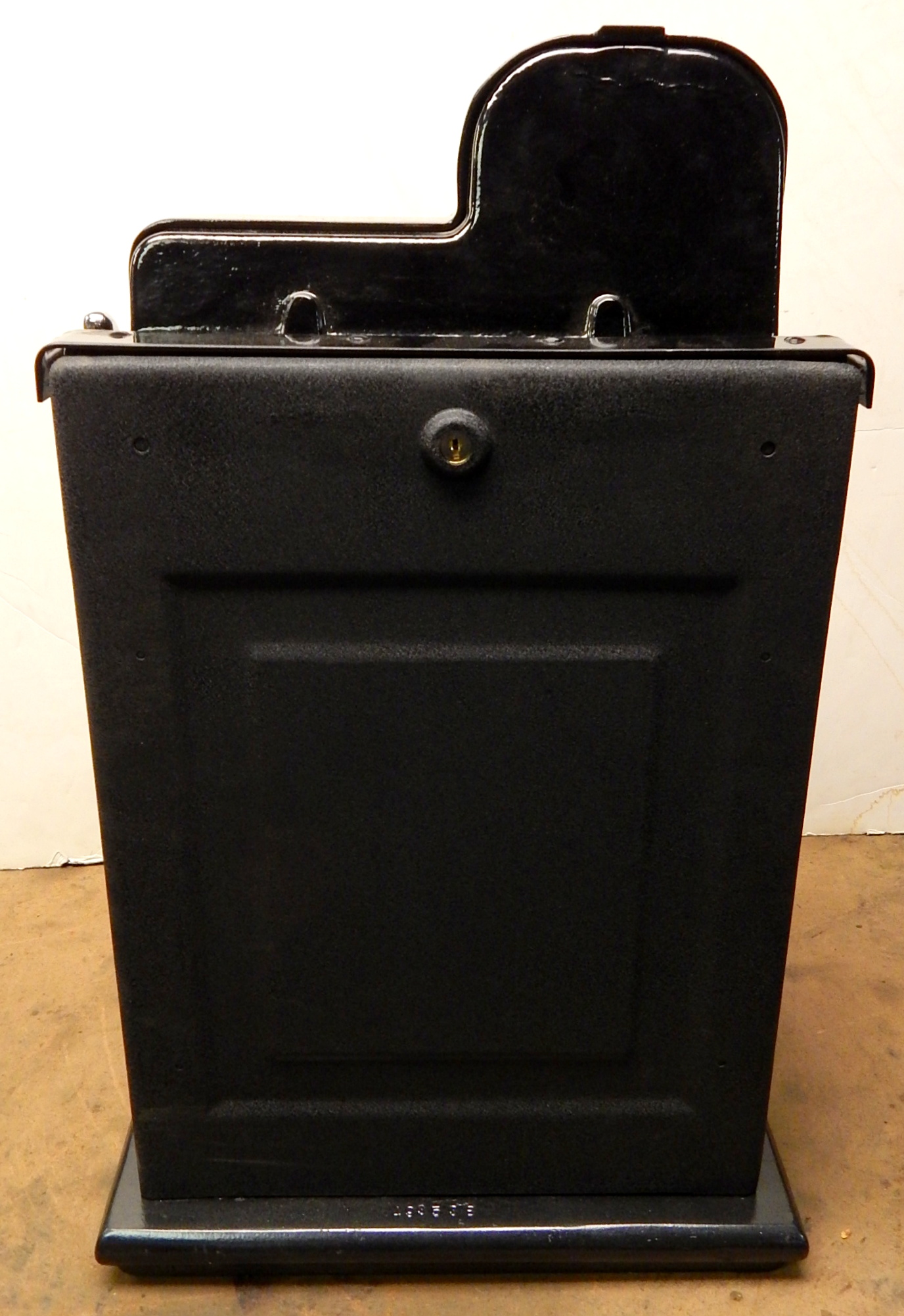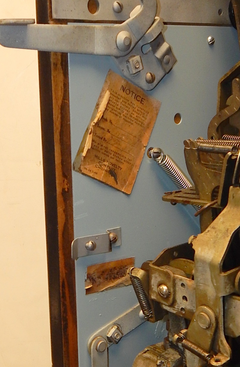 1946 Mills Black Cherry "Golfer" 25 cent, restored painted gloss Black, with oak cabinet. Still has the original paper work on the inside of the cabinet. This is a very nice machine that play very easy. New award card, new reel strips. all the trim on this machine is polish. Original back door, original cash box. Plays very easy. A great rec-room machine.
